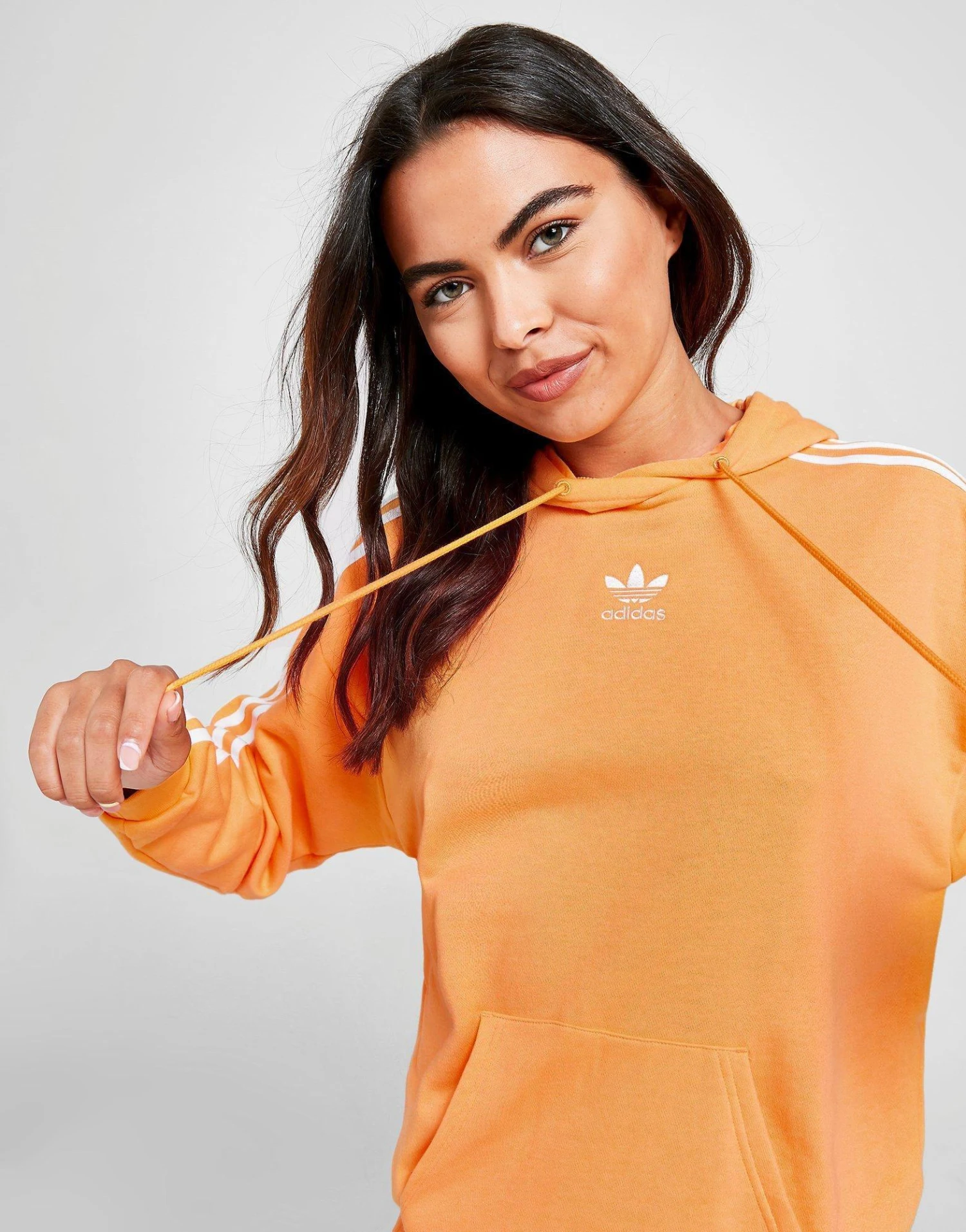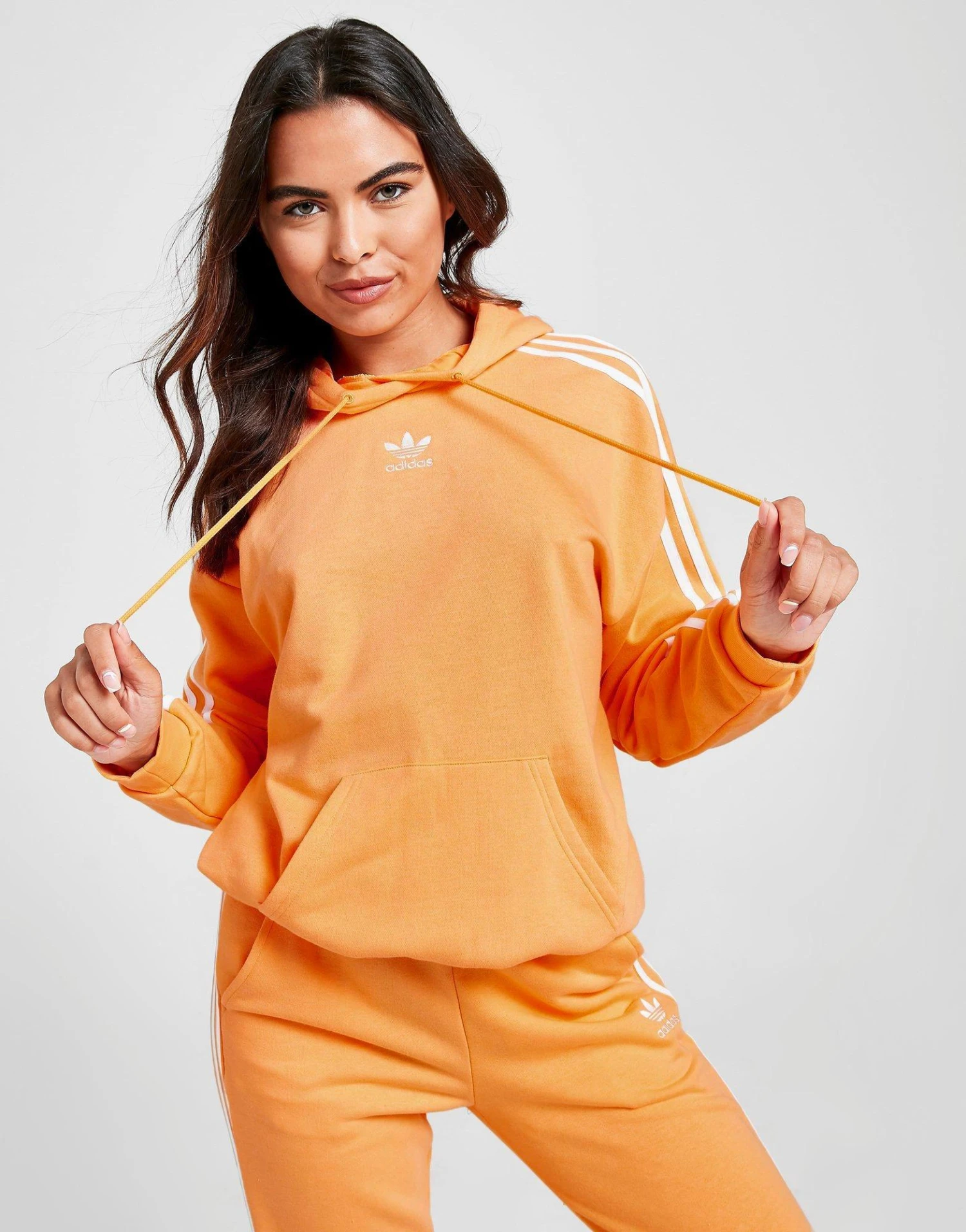 Cop a classic casual for your laidback looks in this women’s 3-Stripes Essential Boyfriend Hoodie from adidas Originals. Exclusive to JD, this sweat comes in a Hazy Orange colourway and is made from a smooth cotton blend for relaxed comfort. In a pullover style, it features an adjustable drawcord hood for custom coverage, ribbed trims and a central kangaroo pocket. With White 3-Stripes to the sides, this hoodie is finished with Trefoil branding to the chest. Machine washable. | Our model is 5’9″ and wears a size 8.|H36831