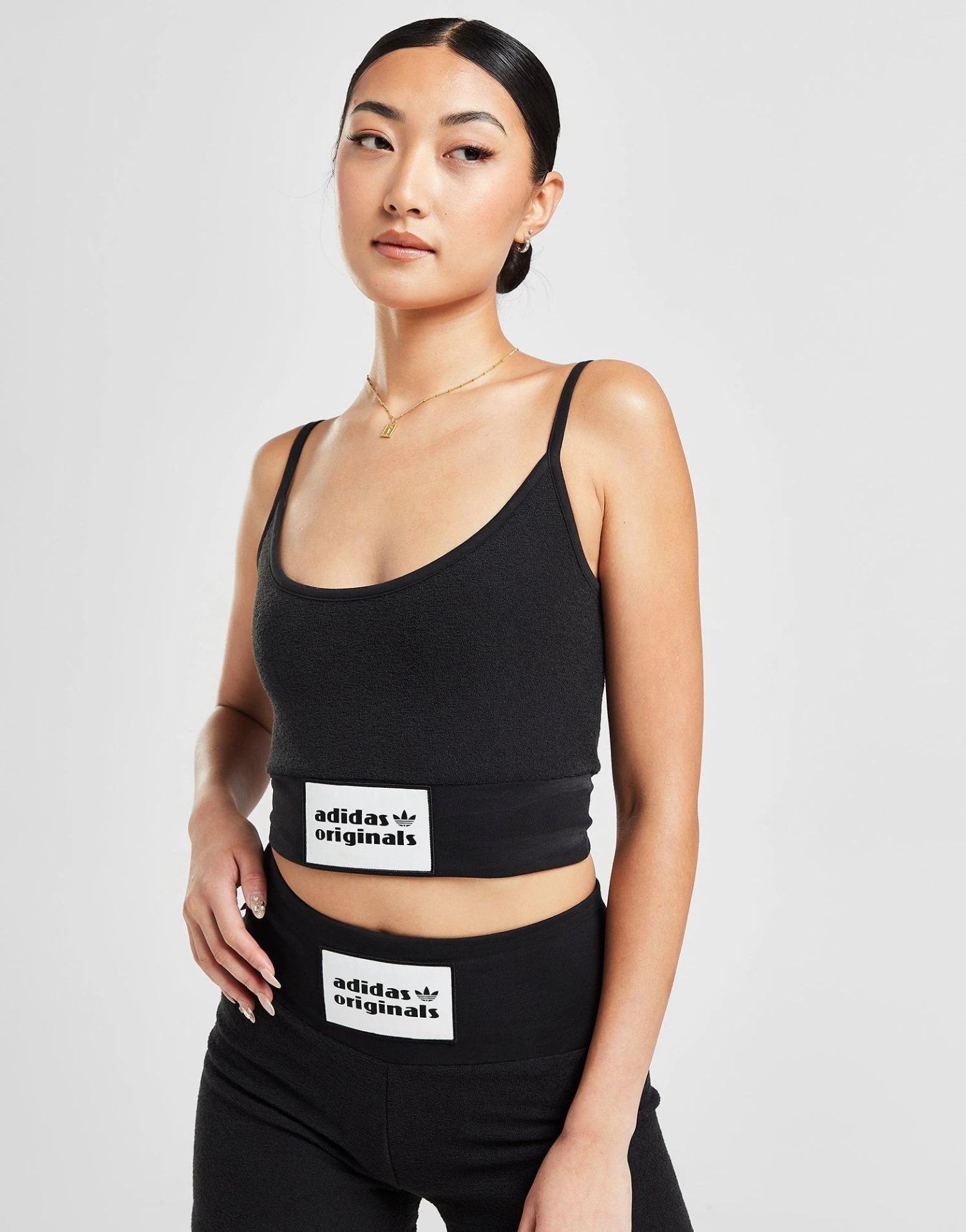 Add sports vibes to your Summer style with this women’s Badge Slim Tank Top from adidas Originals. In a Black colourway, this slim-fit top takes inspiration from boxing and is made from super soft, recycled towelling fabric. It features a scoop neckline and spaghetti straps. With an elasticated, cropped hem, this tank is finished up with a satin logo badge for a luxe feel. Machine washable. | Our model is 5’5″ and wears a size small. | IC8524