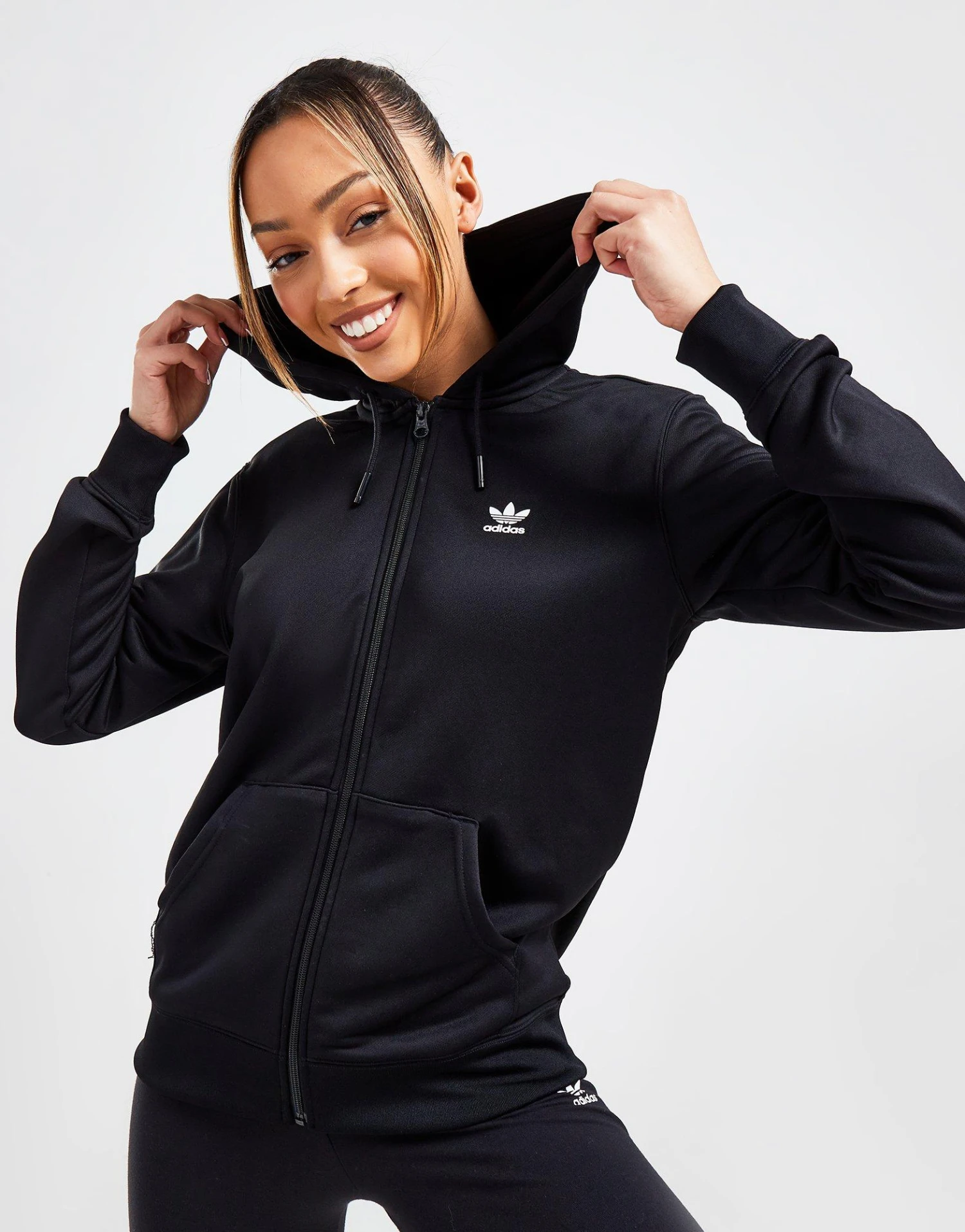 Exclusive to JD. Add a sporty vibe to your off-duty ‘fits with this women’s Essential Poly Full Zip Hoodie from adidas Originals. In a black colourway, this regular-fit layer features a full-zip front and drawcord-adjustable hood for custom coverage, as well as ribbed trims and a split kangaroo pocket to the front. Made from recycled French terry poly fabric, this hoodie is finished off with contrasting adi Trefoil branding to the chest. Machine washable.|HG4006
