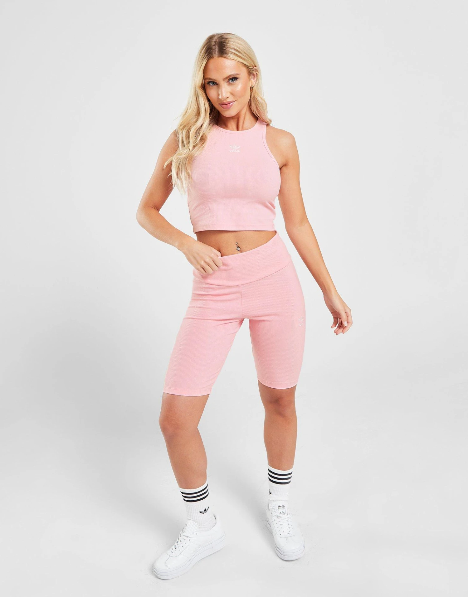 Get set for Summer with this women’s Essential Rib Tank Top from adidas Originals. In a True Pink colourway, this slim-fit top is made from stretchy cotton fabric in a ribbed build that hugs your body. It has a highneckline, sporty racerback and a cropped hem. Finished with an embroidered Trefoil logo. Machine washable. | Our model is 5’5″ and wears a size small. | IB9108_