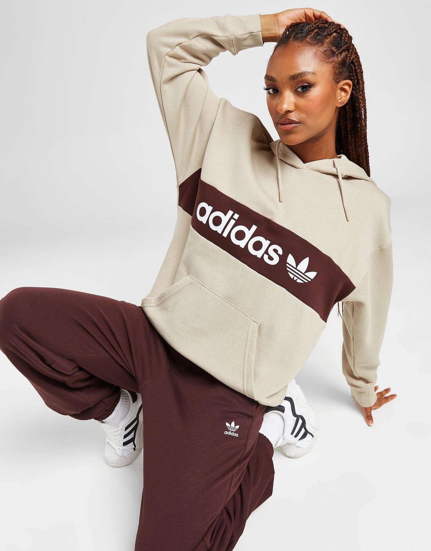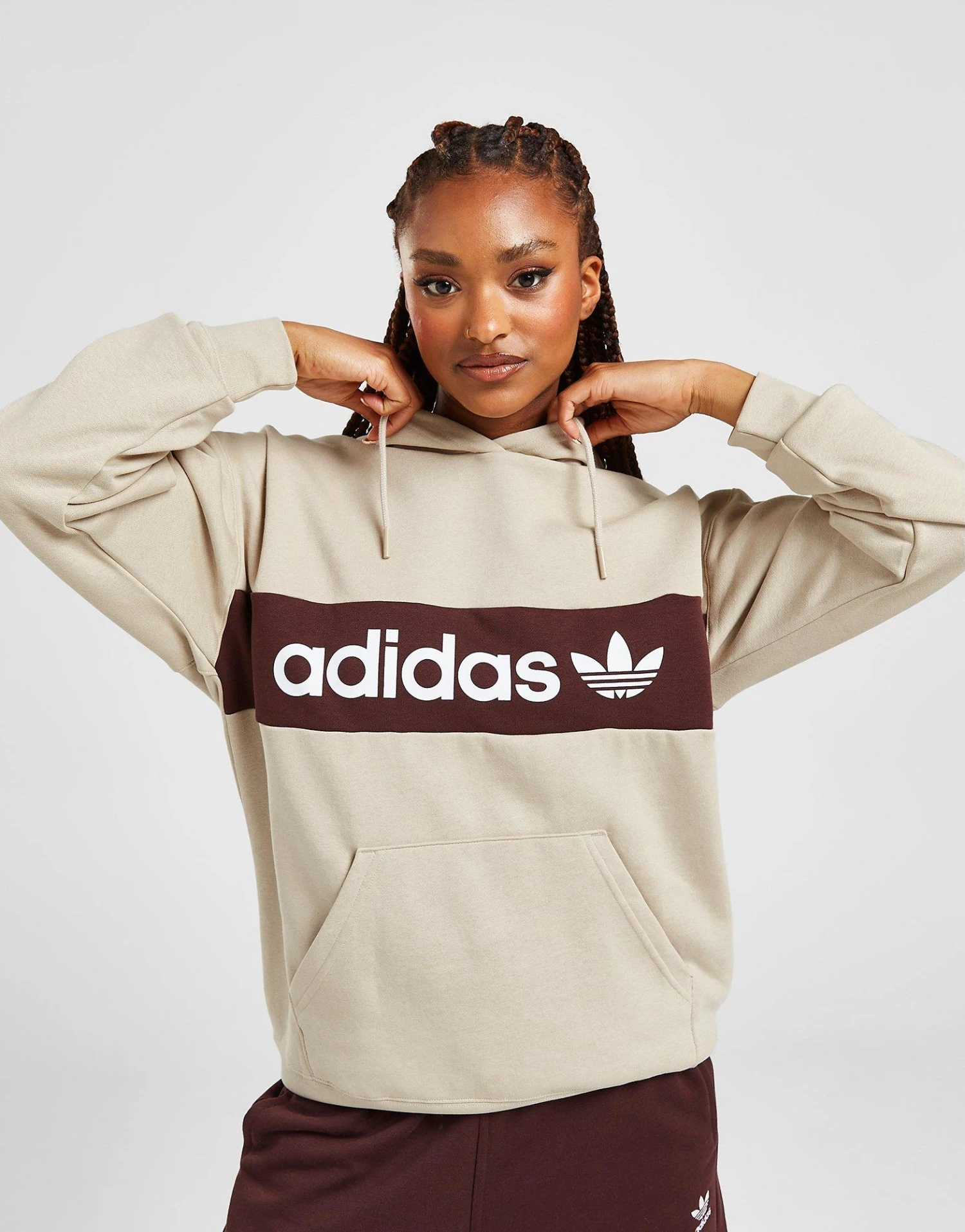 Layer up in and get snug in this women’s Linear Hoodie from adidas Originals. Exclusive to JD, this regular-fit hoodie is cut from an ultra-soft blend of cotton and recycled poly fabric for all-day comfort. In a Beige colourway, this overhead hoodie has an adjustable hood for custom coverage and stretchy ribbed trims to hold the shape. With a kangaroo pocket for storage, signed off with adidas Originals branding to the chest. Machine washable. | Our model is 5’7″ and wears a size small. | IQ0907