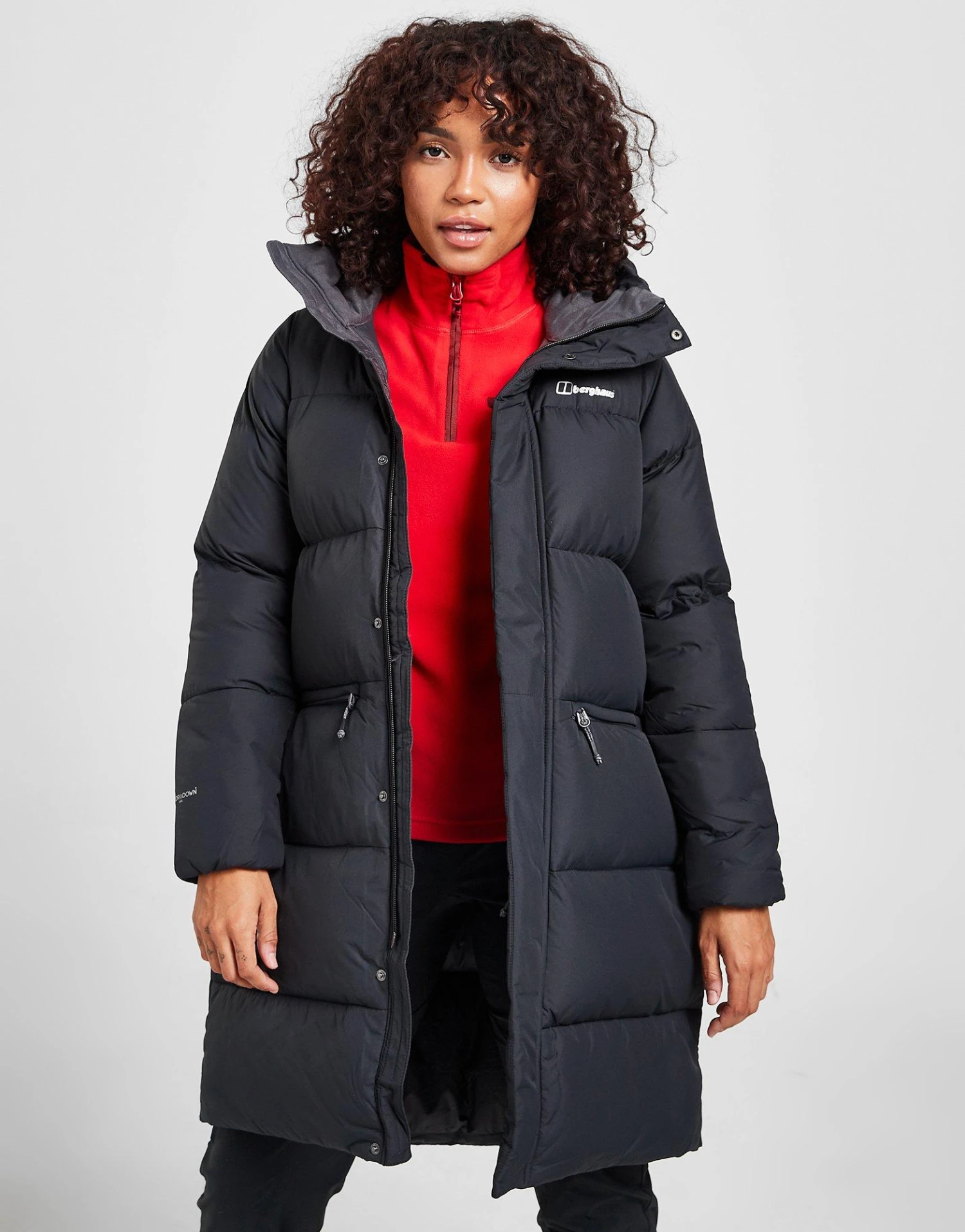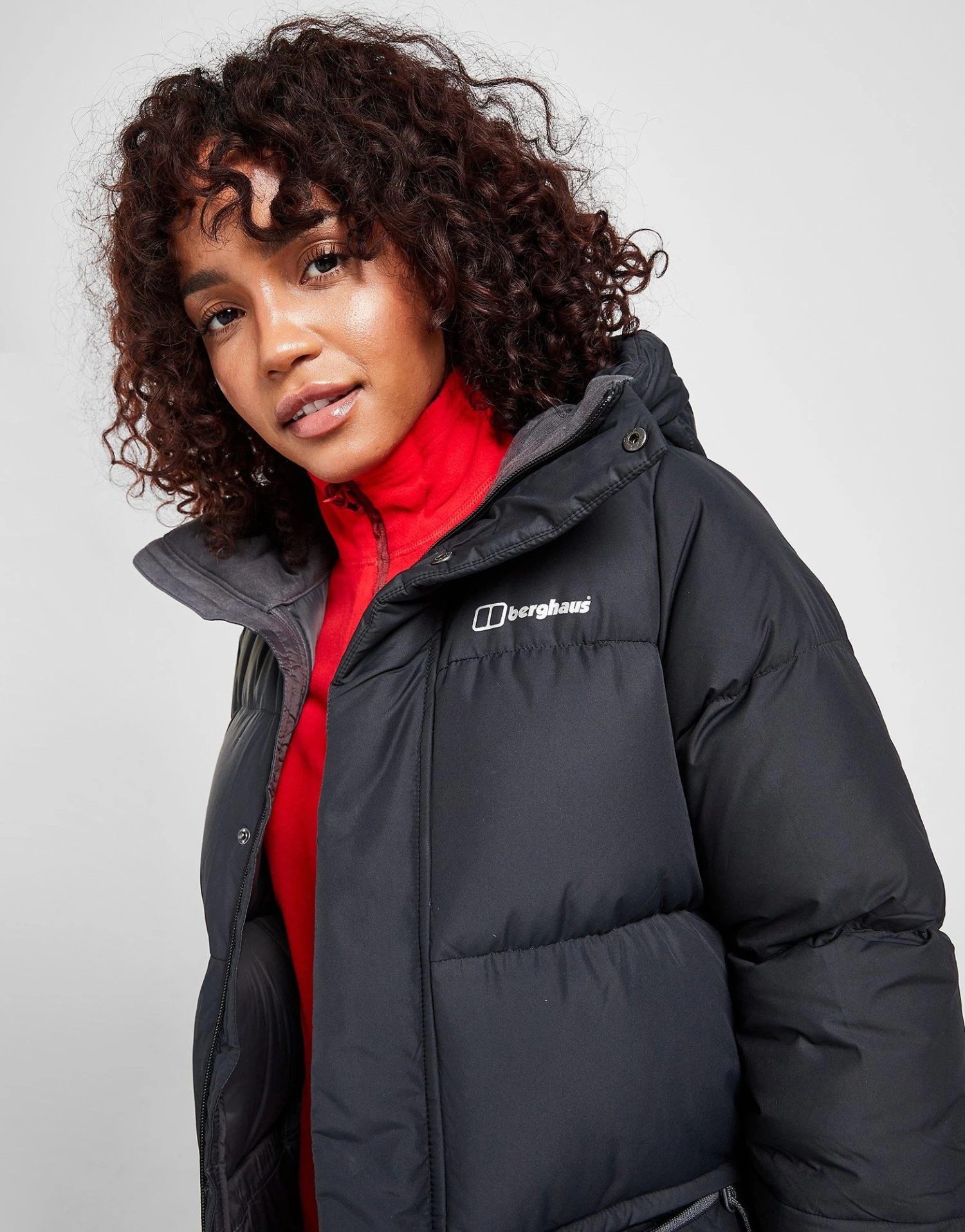 Style up for those cold and crisp days in this women’s Combust Long Jacket from Berghaus. In a black colourway, this knee-length jacket is made from smooth poly fabric that’s loaded with Hydrodown from hood to hem for max warmth. It features a full zip and metal popper front, as well as a riased neckline and hood for premium coverage. Using breathable Reflect tech in the liner for the perfect temp, this jacket is finished with elasticated cuffs, zippered pockets and signature Berghaus branding to the chest. Machine washable. | Our model is 5’6″ and wears a size 8.