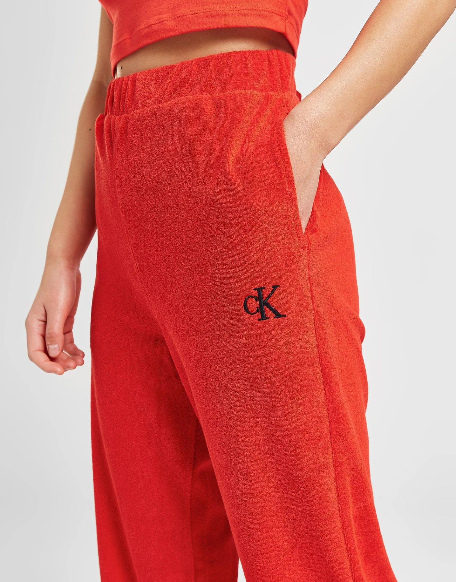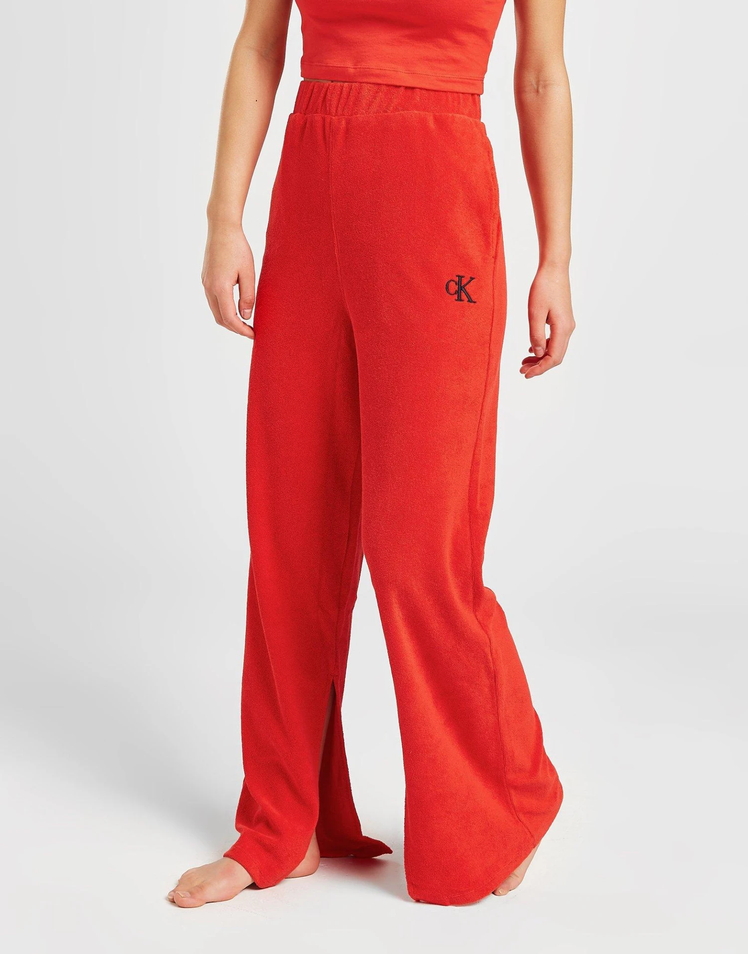 Maximise your comfort with these women’s CK96 Wide Leg Pants from Calvin Klein. In a Cajun Red colourway, these standard fit pants are cut from soft fleece fabric for total comfort. They feature an elasticated, high-rise waistband for a relaxed fit, with a split hem at the bottom for a light, laidback wear. They have side pockets for your essentials and are finished up with signature CK branding. Machine washable | Our model is 5’5.5″ and wears a size small.