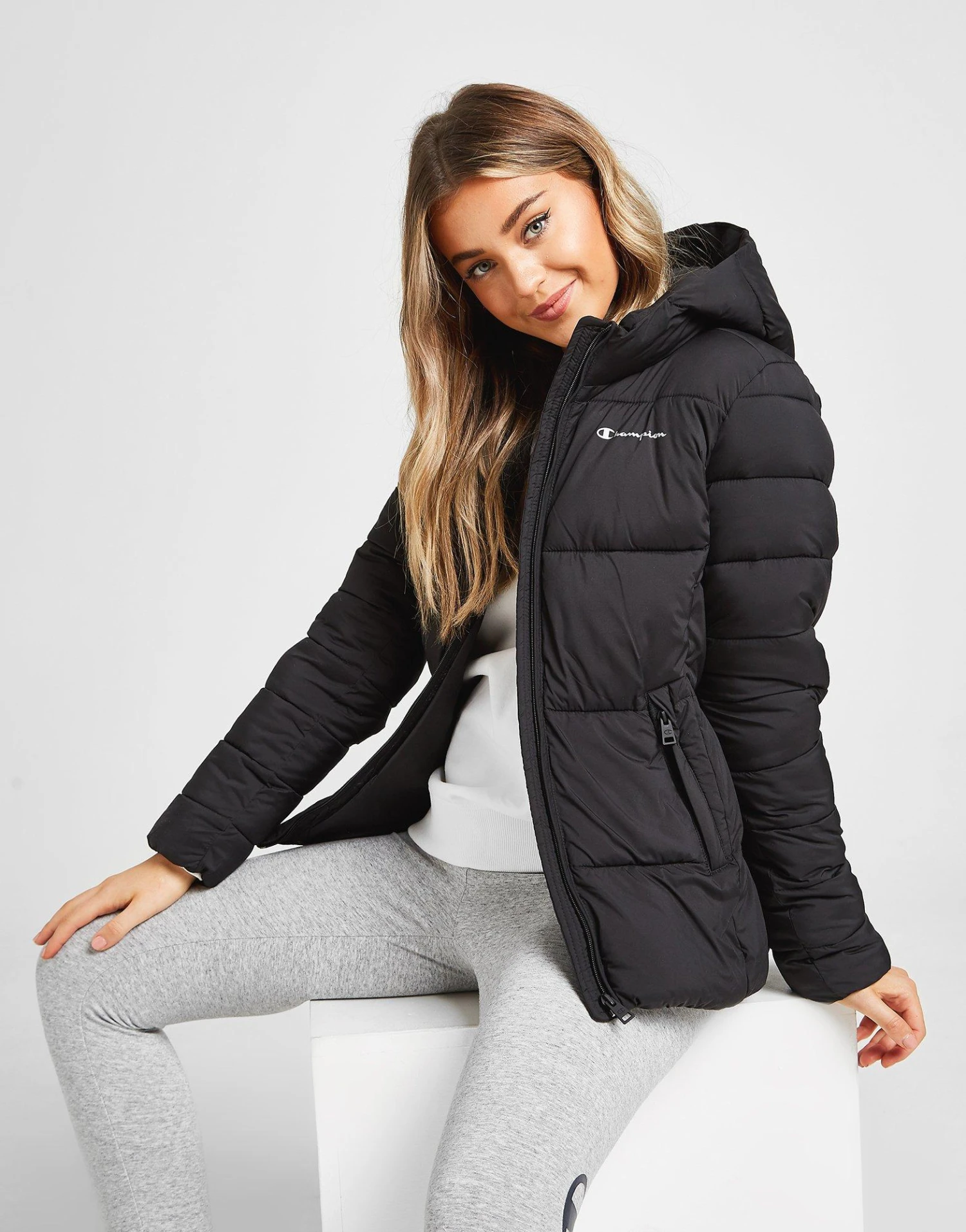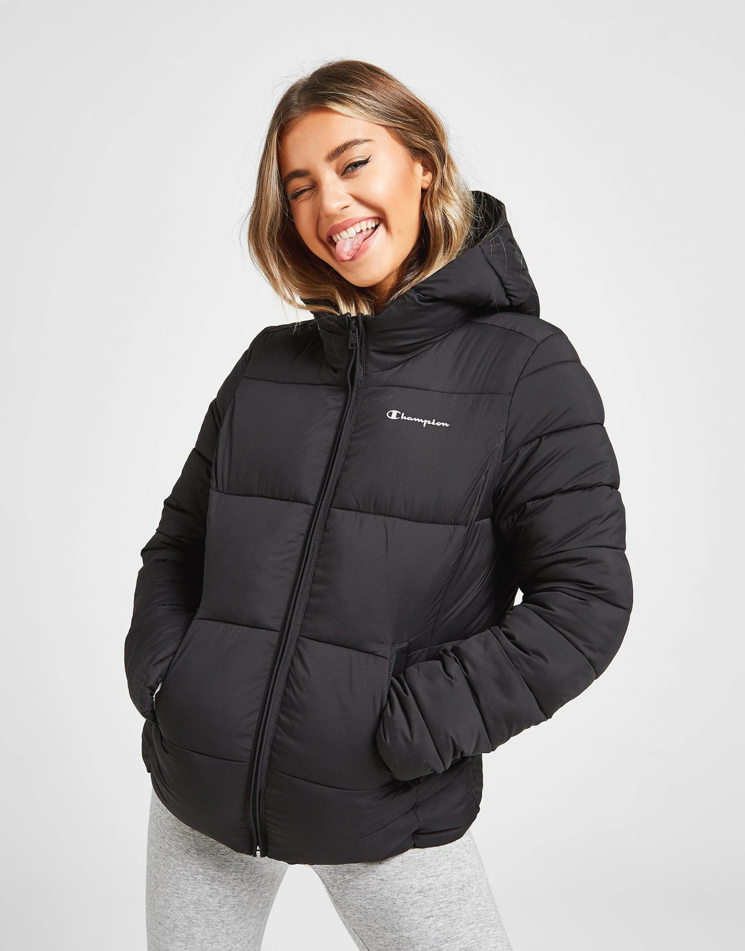 Exclusive to JD. Stay covered and cosy when you step out with this women’s Script Logo Padded Jacket from Champion. In a black colourway, this cold-weather essential is made from durable poly fabric and padded with cosy fill for maximum warmth. It features a full frontal zip fastening, fixed hood and elasticated trims to keep heat locked in. With two slide in side pockets, it’s finished with Champion branding to the chest. Machine washable. | Our model is 5’7″ and wears a size small.