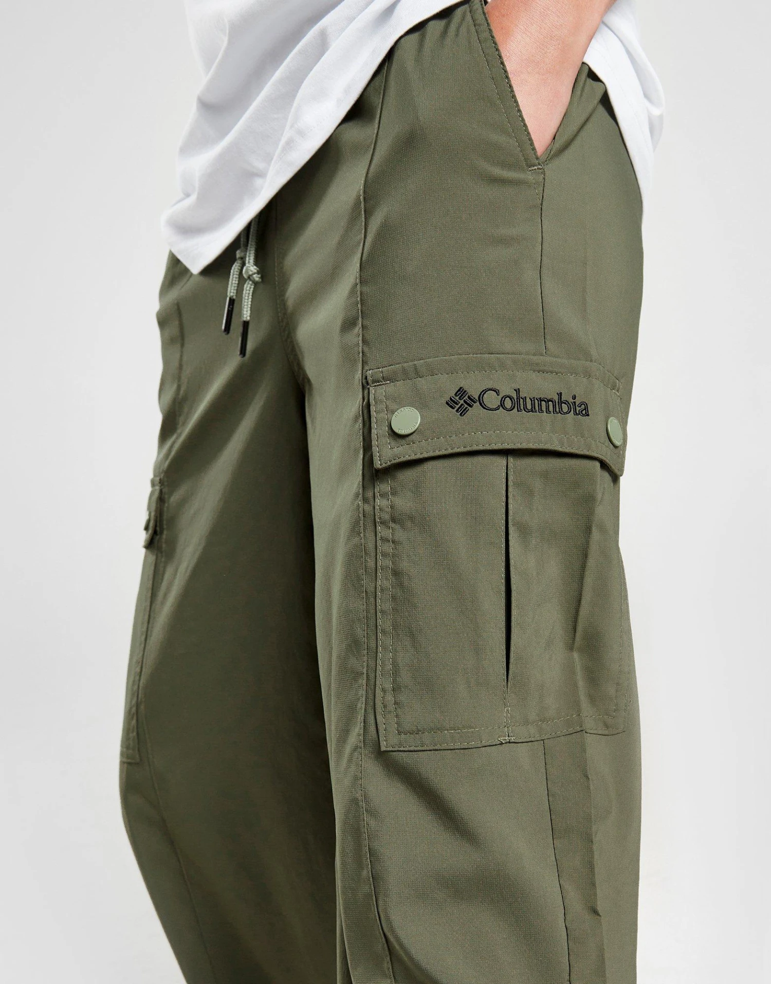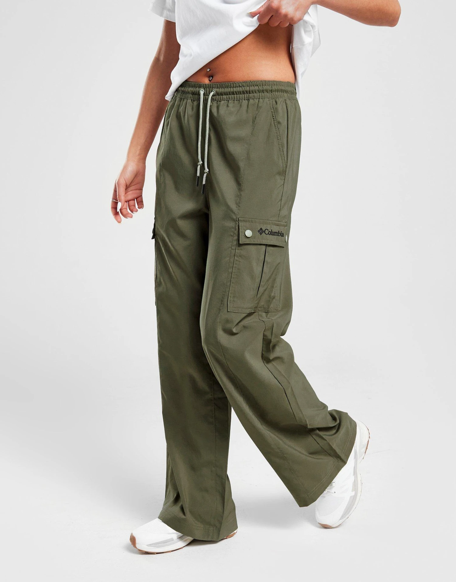 Get a slick style from Columbia with these women’s Wide Leg Cargo Pants. Coming in a Green colourway, these relaxed-fit cargo pants are made with a super-smooth and lightweight recycled poly fabric for comfy wear. They feature an elastic drawcord waistband so you can customise your fit and have side and cargo pockets for essential storage. With wide legs for relaxed wear, they’re signed off with Columbia branding. Machine washable. | Our model is 5’7″ and wears a size small.