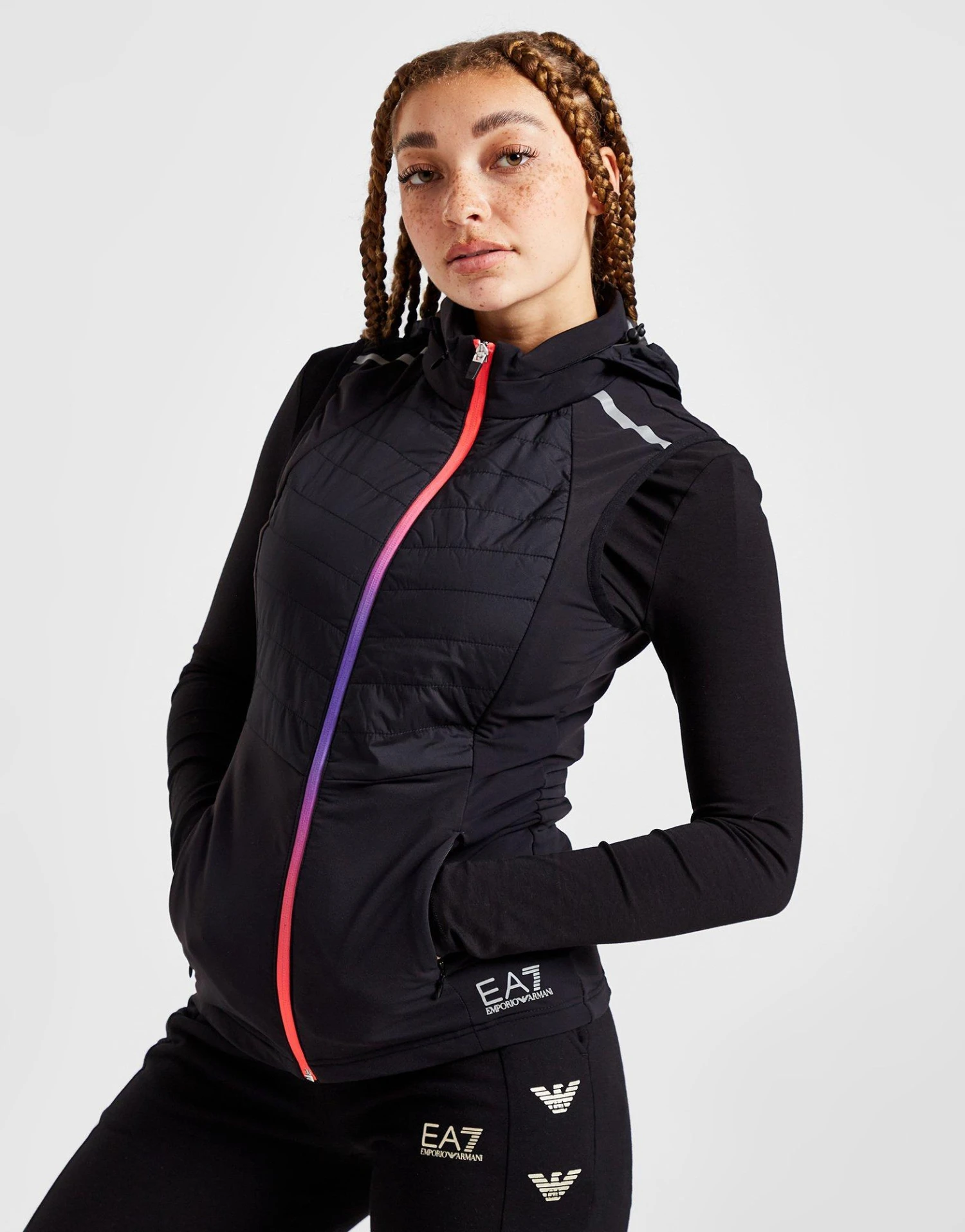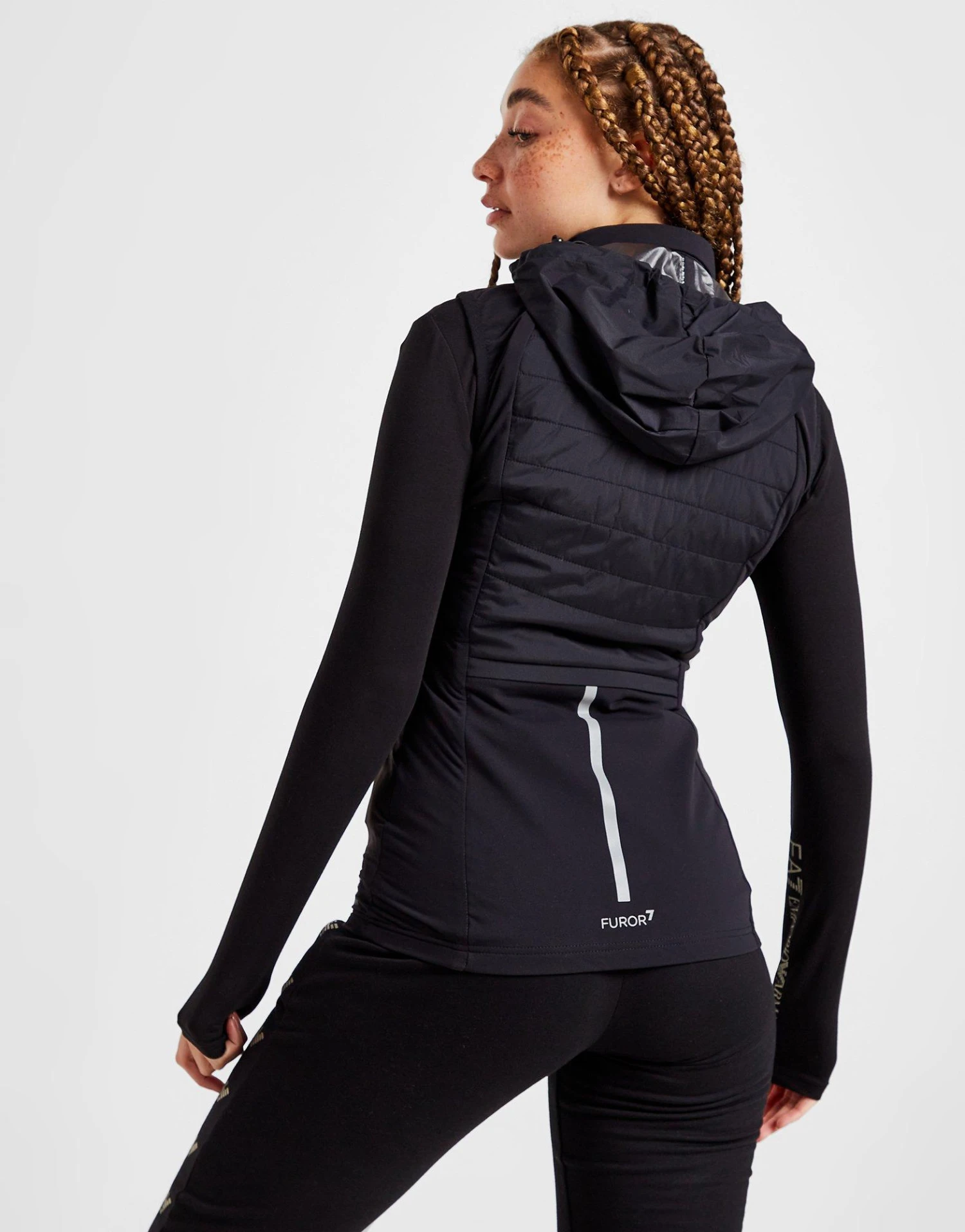 Step up your layers with this women’s Furor Vest from Emporio Armani EA7. In a Black colourway, this slim fit vest is cut from smooth polyester for a cool, comfy wear. It features a full-zip fastening and hood for custom coverage, with armholes and zip-up side pockets for secure storage. Finished up with reflective branding throughout. Machine washable | Our model is 5’6.5″ and wears a size small.