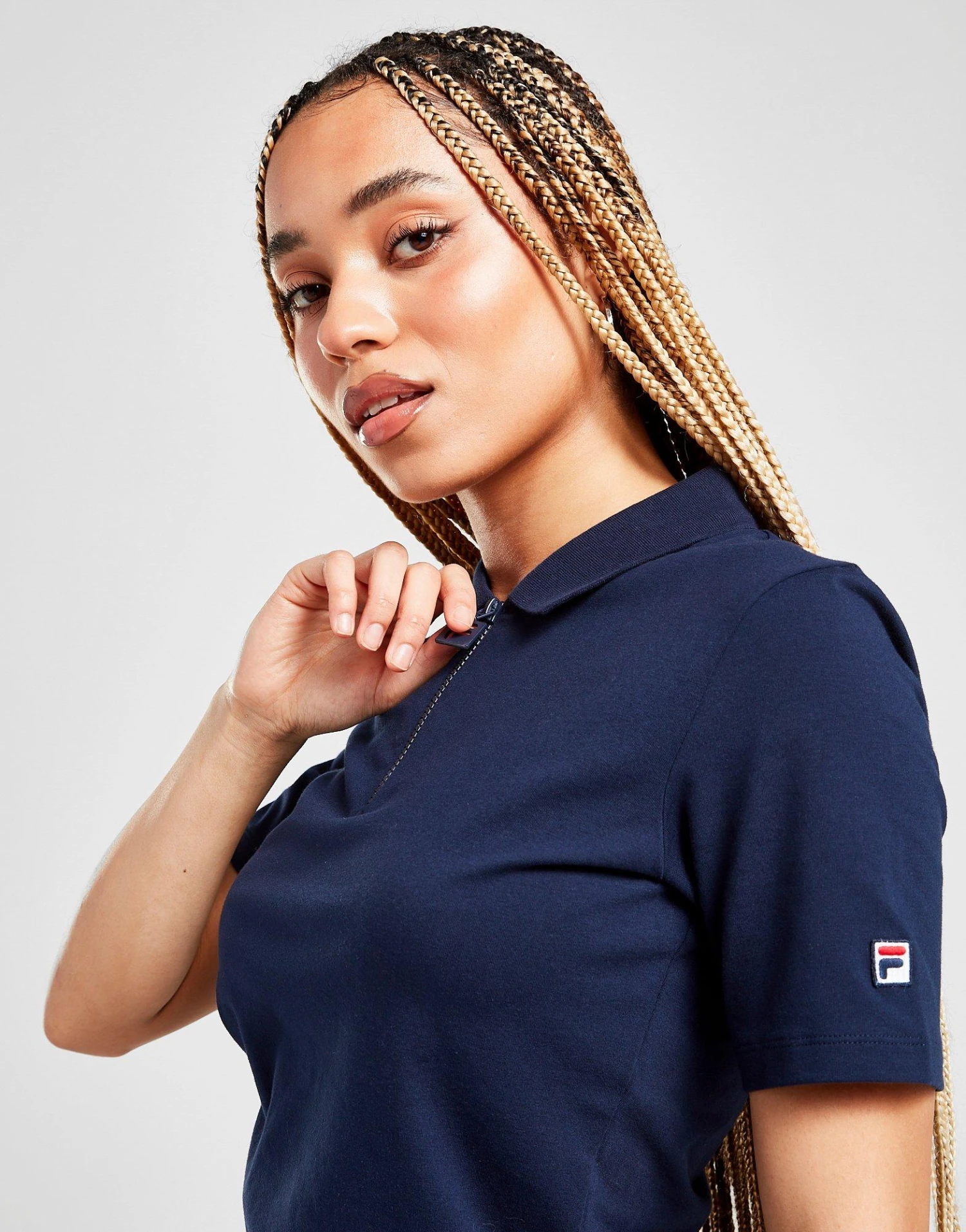 Step out in retro style in this women’s Logo Zip Polo Shirt from Fila. In a navy colourway, this fresh polo comes in a regular-fit and is made from soft cotton fabric for maximum comfort. This look features a 1/4 zip fastening and spread collar for classic court vibes. Finished off with iconic Fila branding to the sleeve and zip. Machine washable. | Our model is 5’8″ and wears a size small.