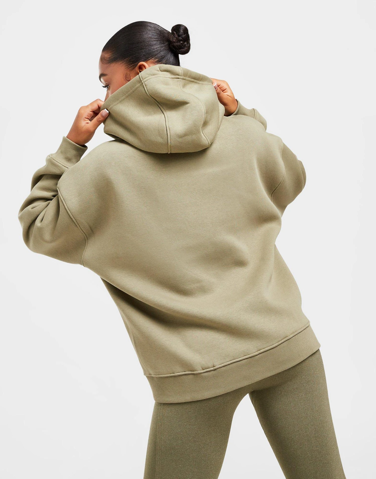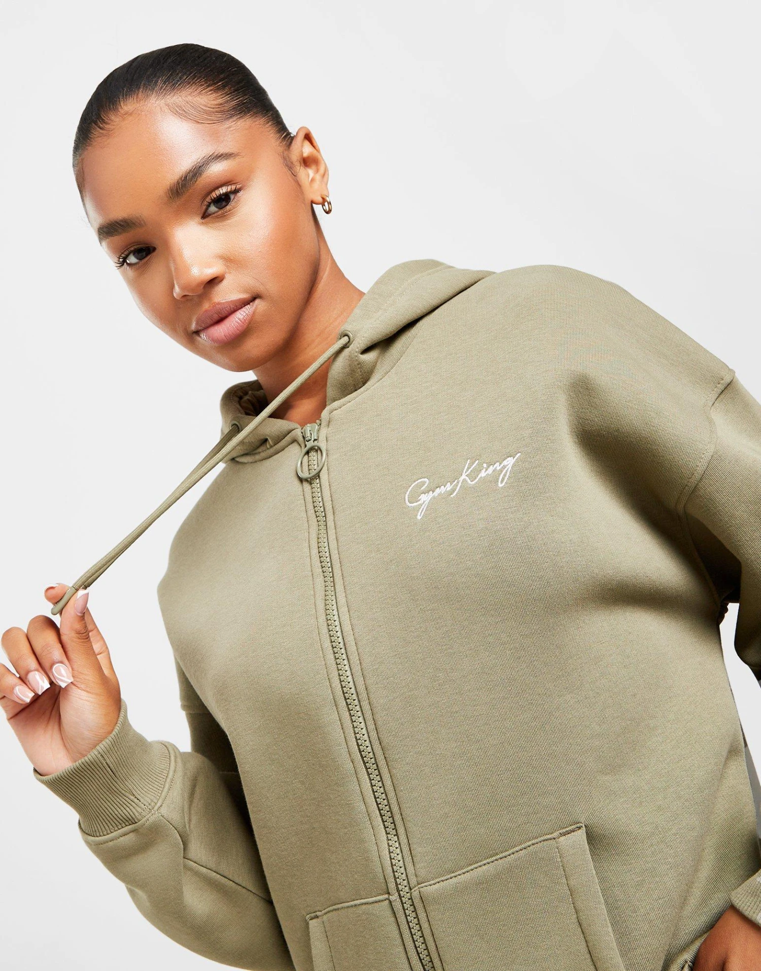 Keep cosy on chill days with this women’s Slouch Full Zip Hoodie from Gym King. In a Khaki colourway, this baggy fitting hoodie is cut from soft, fleecey fabric for total comfort. It features a full-zip fastening and adjustable hood for custom coverage, with ribbed trims for a locked in fit and side pockets for your everyday essentials. Finished up with Gym King branding to the chest. Machine washable | Our model is 5’7″ and wears a size 8.