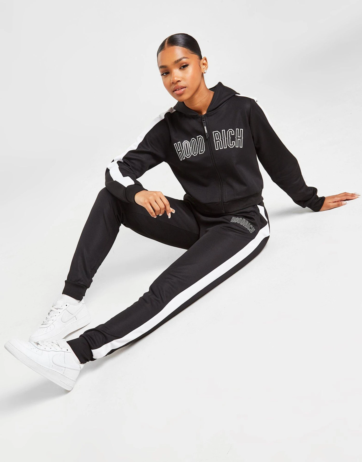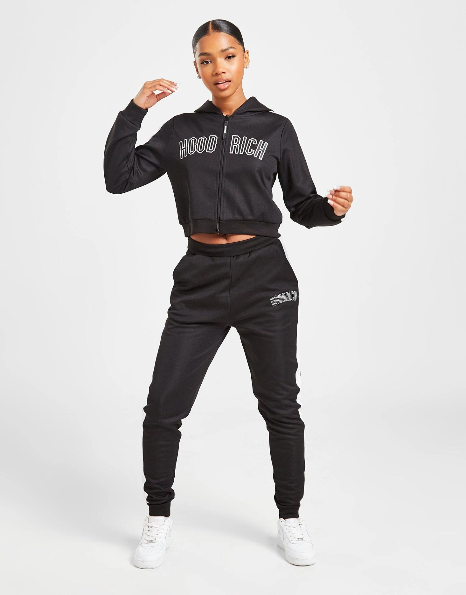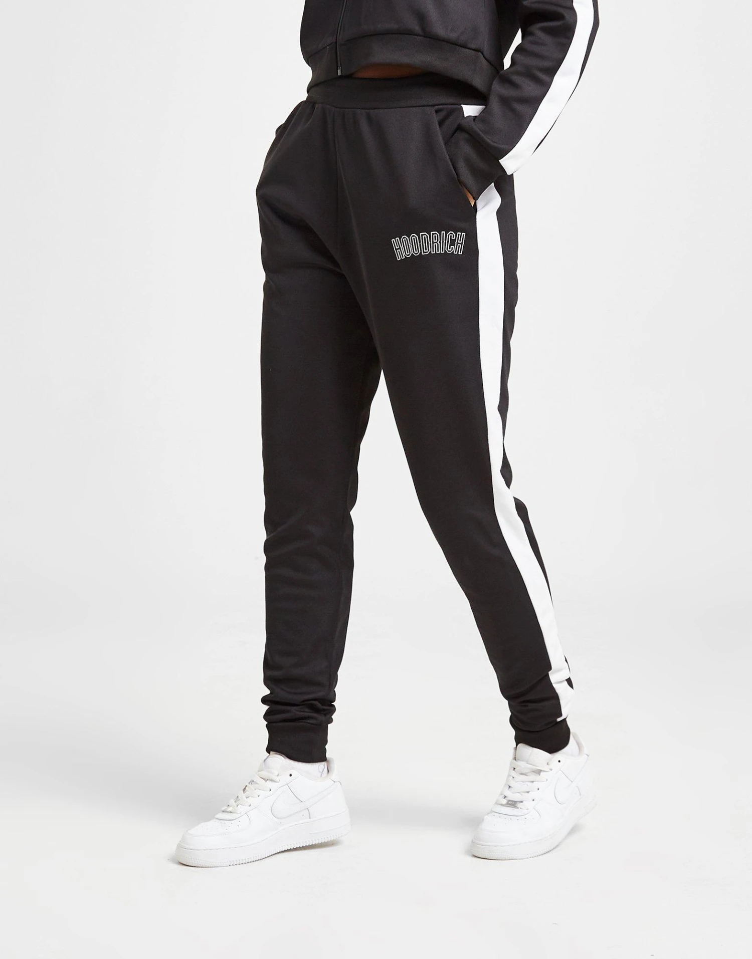Stock up on your street-ready staples with these women’s Felt Poly Track Pants from Hoodrich. In a Black colourway, these JD-exclusive track pants are made with ultra-smooth, lightweight poly fabric for lasting comfort. They have an elasticated waistband with cuffed ankles for a relaxed fit, and side pockets at the waist to stash your stuff. Finished up with contrast White taping down the sides, and signature Hoodrich branding to the thigh. Machine washable. | Our model is 5’7″ and wears a size small.