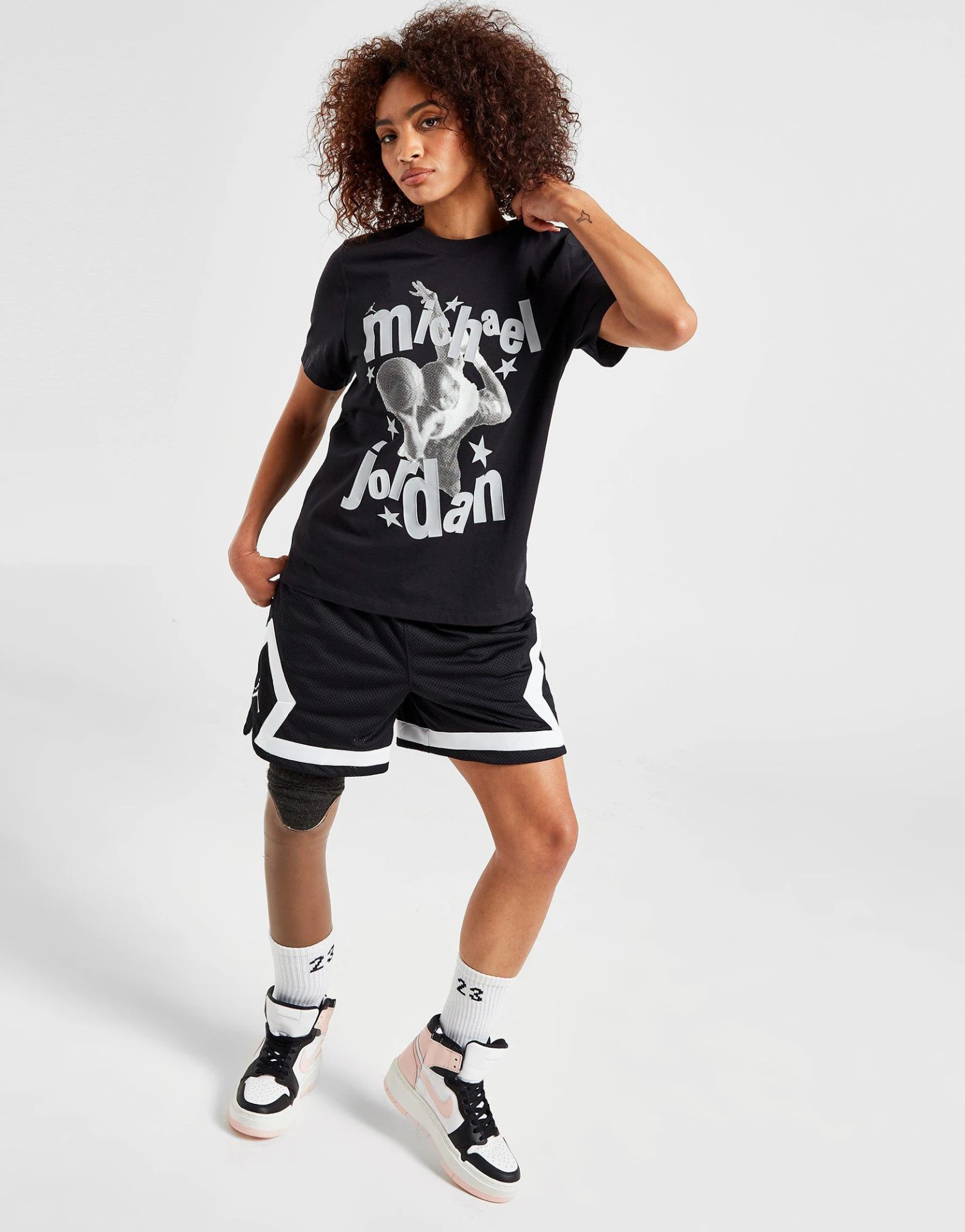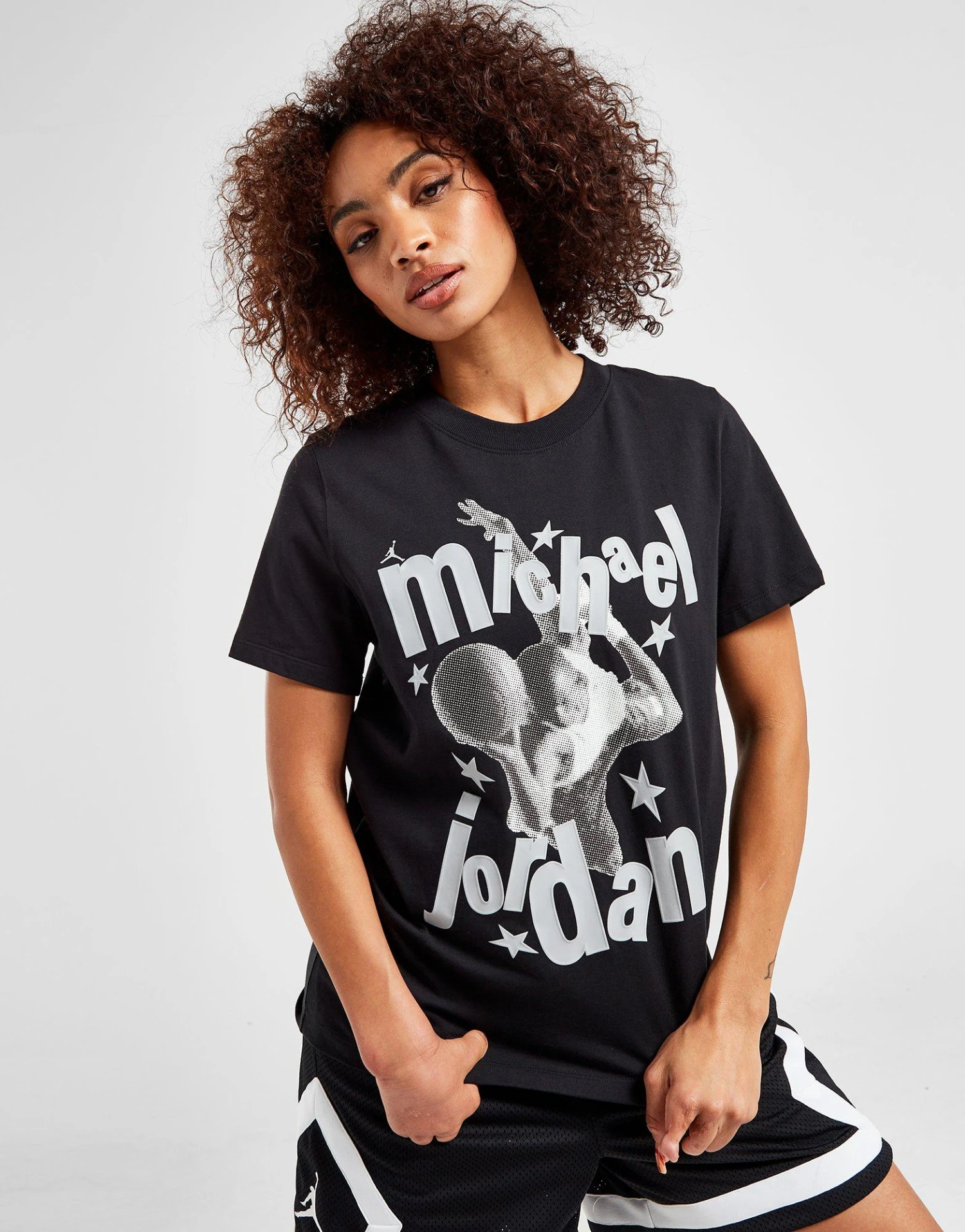 Go bold in a court-inspired look with this women’s MJ Graphic T-Shirt from Jordan. Coming in a Black colourway, this regular-fit tee is made with soft, durable cotton for lasting comfort. It features a ribbed crew neckline and short sleeves for a classic cut, and is finished up with a standout, photorealistic Michael Jordan graphic stamped to the front. Machine washable. | Our model is 5’7″ and wears a size small.