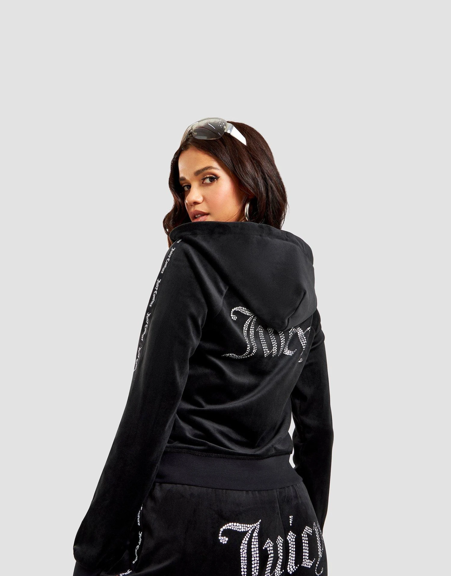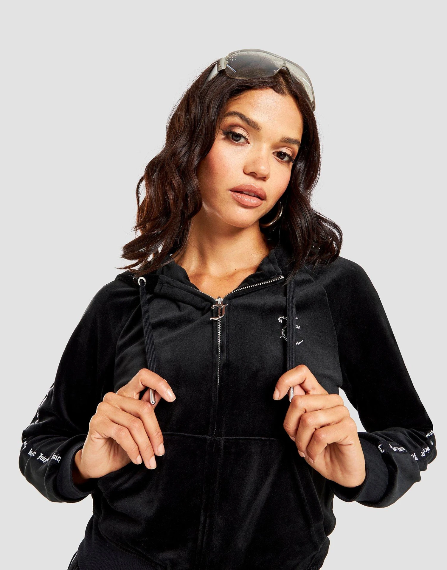 For chilled out, off-duty vibes, check out this women’s Velour Tape Hoodie from Juicy Couture. In a Black colourway, this JD-exclusive hoodie is made from soft, stretchy poly-blended velour for next-level comf’. It features a full zip fastening, an adjustable hood for custom coverage, and side pockets for your essentials. With a branded Juicy zip and tape down the sleeves, this hoodie is finished with signature, silver diamante detailing to the chest, and the iconic “Juicy” across the back.
