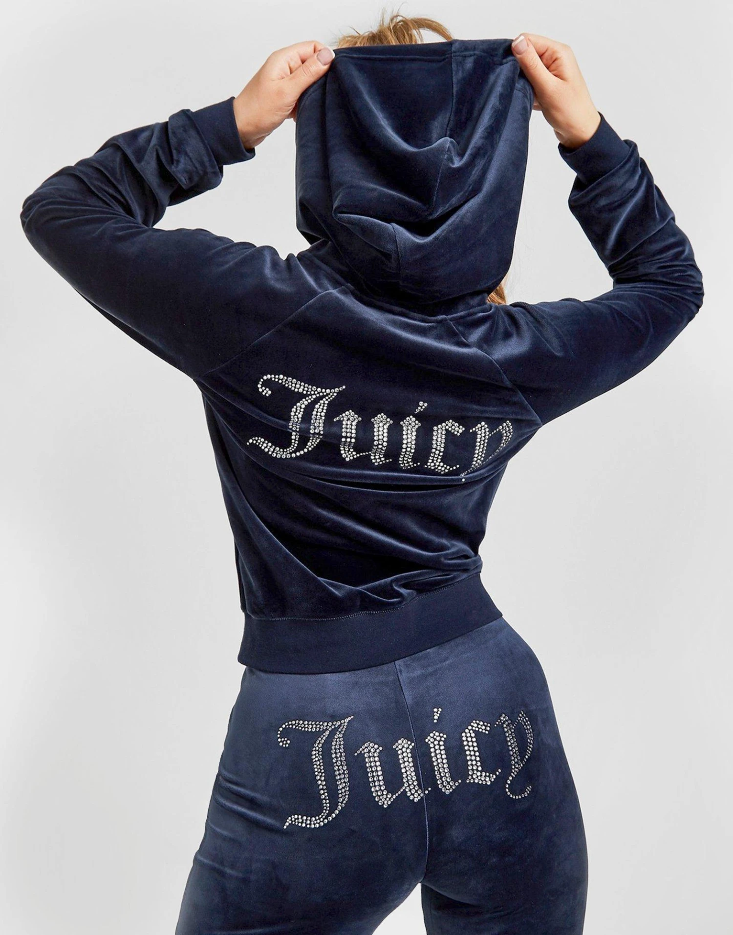 Keep it retro and stay cosy in this women’s Diamante Logo Velour Full Zip Hoodie from Juicy Couture. In a dark Navy colourway, this slightly cropped hoodie is made from super soft velour fabric. It has a full zip design and features long raglan sleeves. With ribbed trims, this hoodie is finished with signature Juicy branding to the rear in a silver diamante finish. Machine washable. | Our model is 5’6″ and wears a size small.