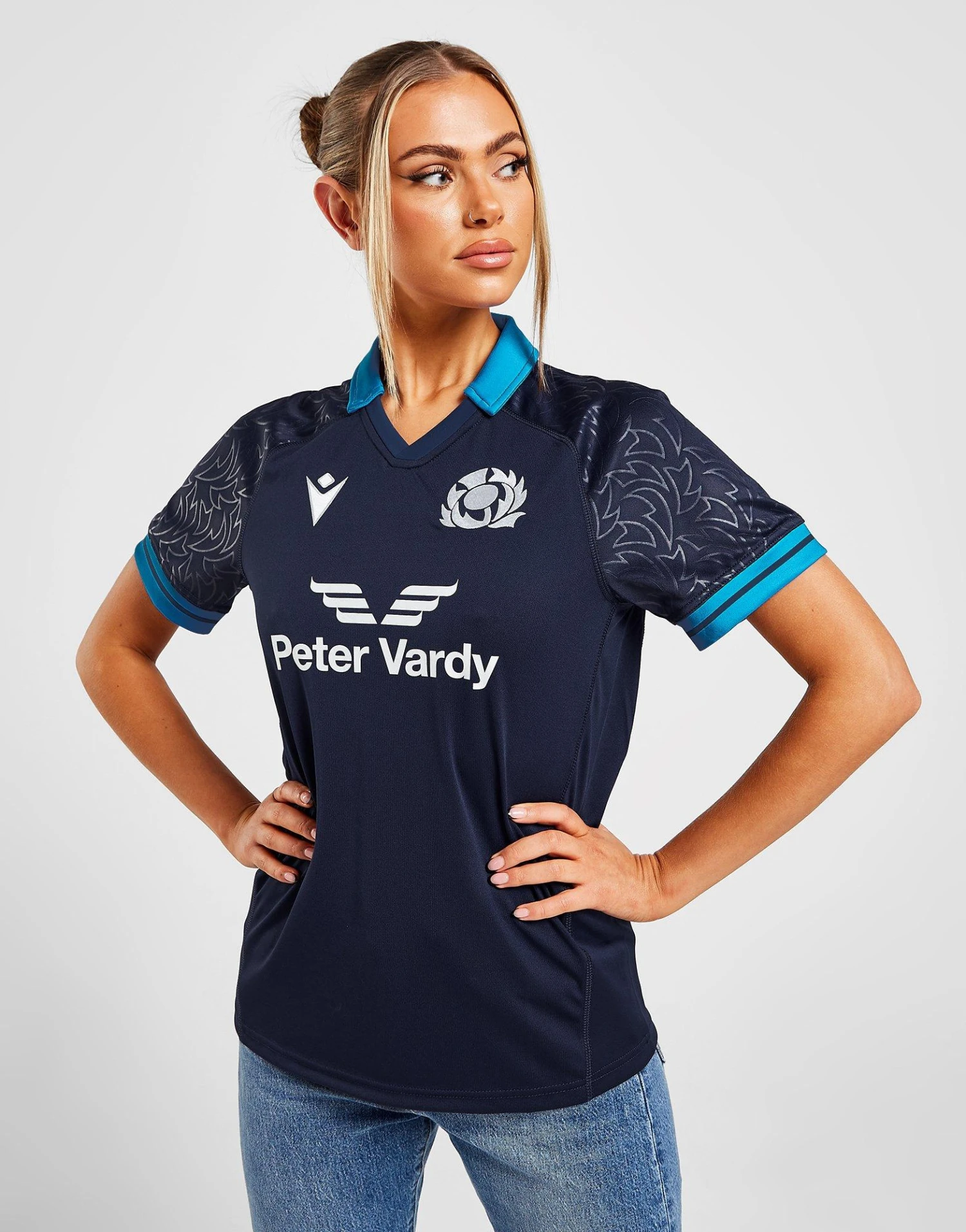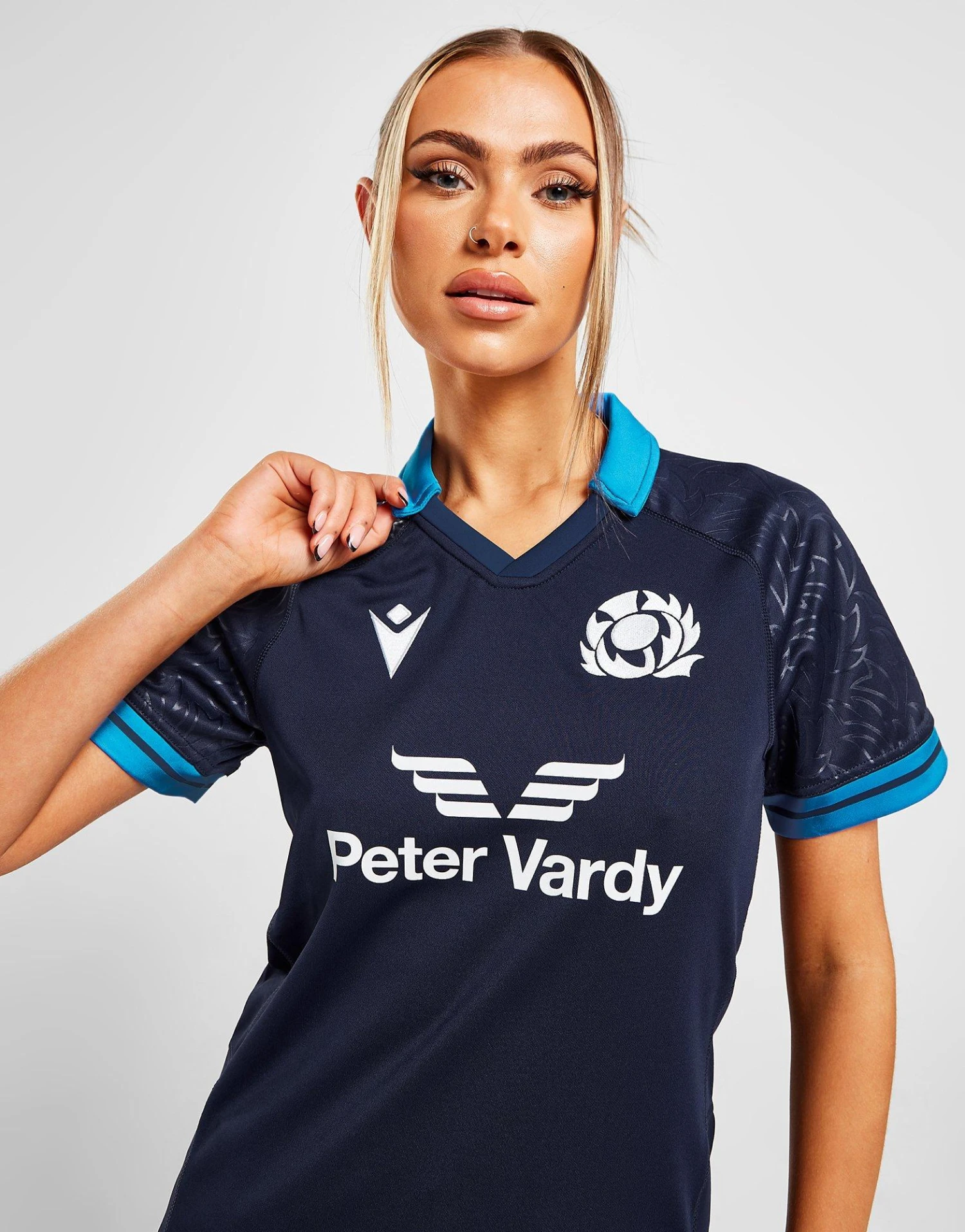 From the pitch to Murrayfield, get behind your nation with this women’s Scotland Rugby 2022/23 Home Shirt from Macron. In a Navy colourway with Royal Blue trims, this regular-fit shirt is made from durable poly-knit fabric, with stretch inserts for essential comfort. It has outlines of the thistle leaves embossed over the shoulders, and features a V-neckline, a classic collar and short sleeves. Finished off with the Scotland flag to the right arm, as well as the Macron logo and Scotland crest to the chest. Machine washable. | Our model is 5’8″ and wears a size 8.