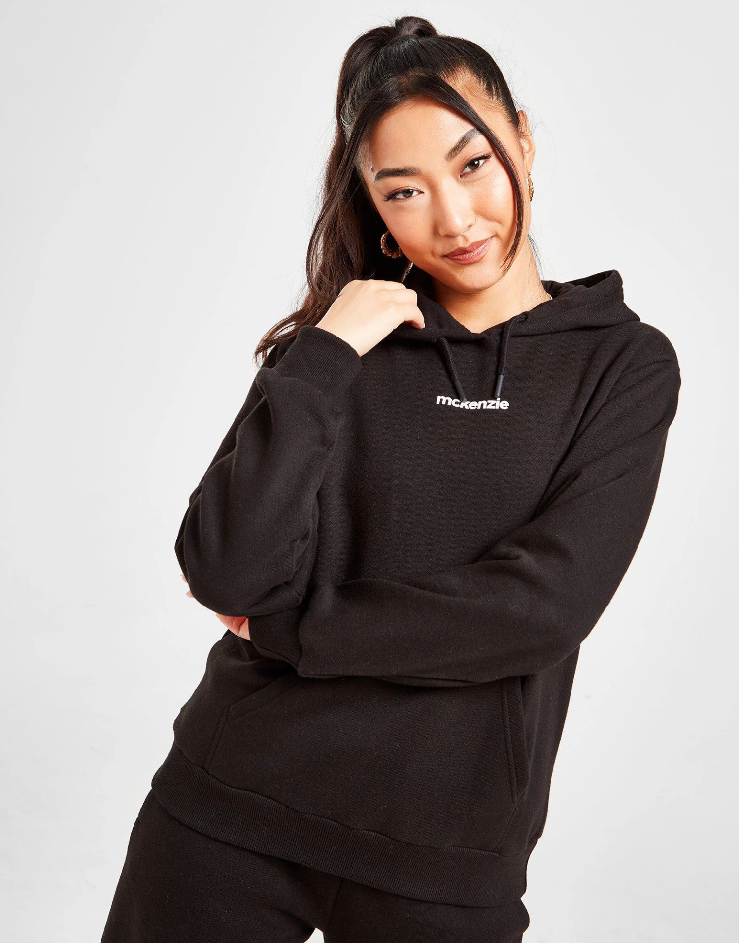 Level up your layers with this women’s Logo Overhead Hoodie from McKenzie. In a Black colourway, this JD-exclusive pullover is made from a soft yet durable cotton and poly mix. It has a drawcord-adjustable hood for custom coverage, as well as stretchy ribbed trims for added comfort. With a central kangaroo pocket for your essentials, this hoodie is finished off with contrasting McKenzie branding printed to the chest. Machine washable. | Our model is 5’8″ and wears a size 8.