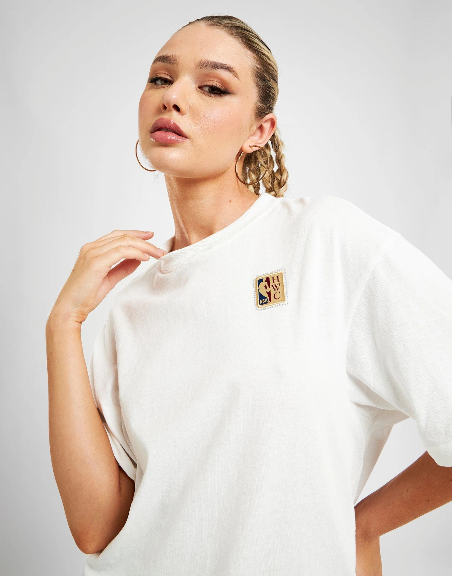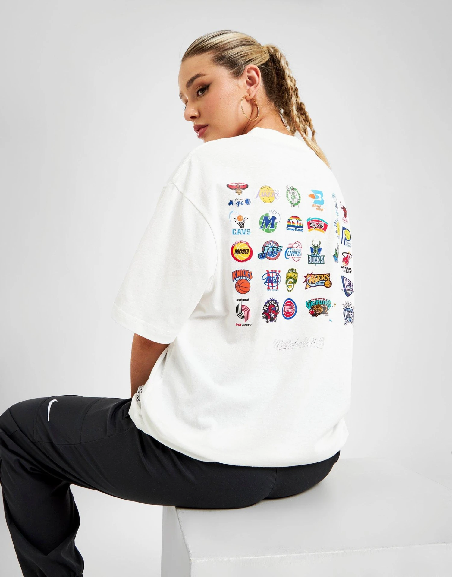 - White colourway with NBA team logos across the back. Finished with rhinestone Mitchell & Ness decal beneath, and embroidered to the sleeve