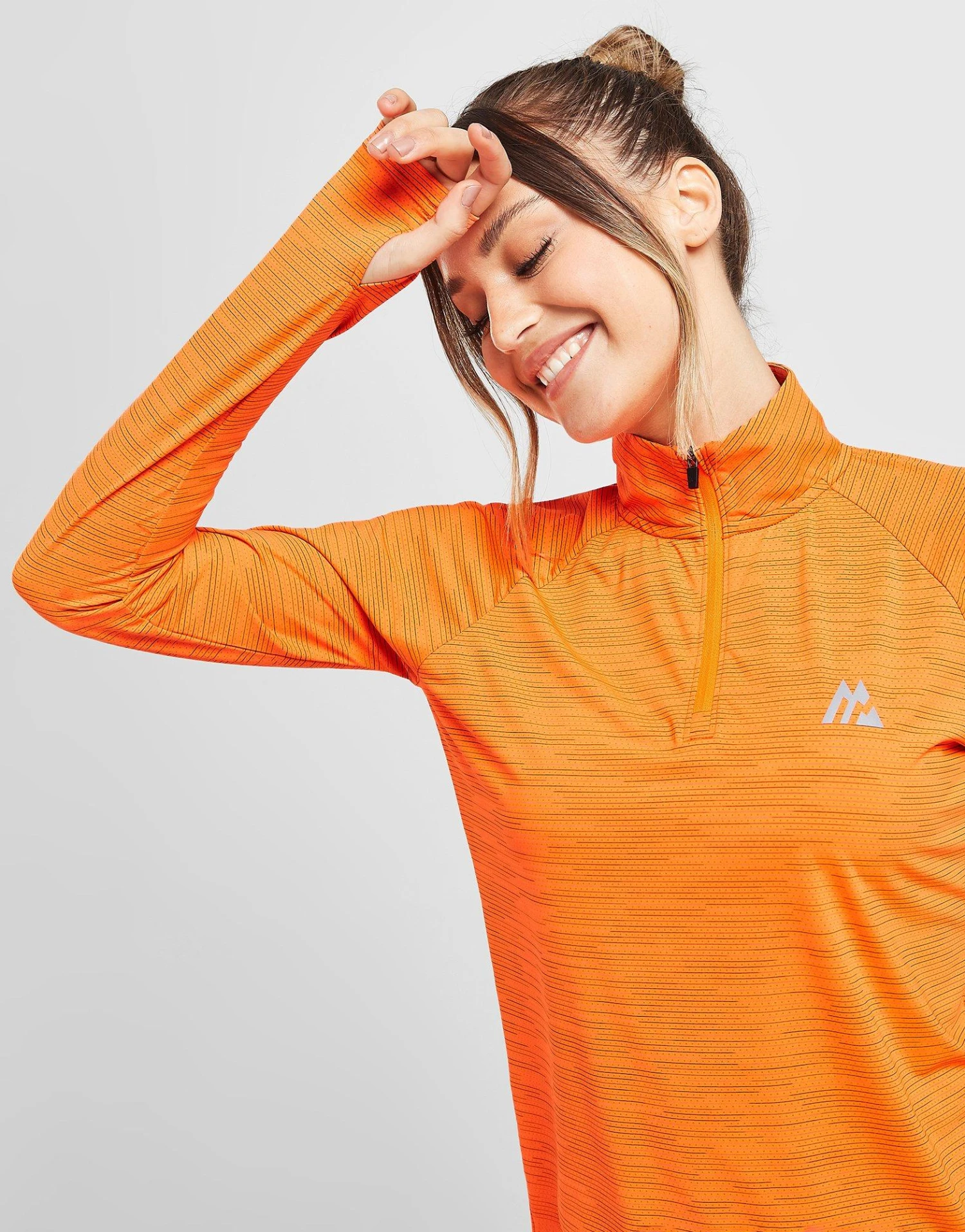 Add a bold look to your fitness ‘fits with this women’s Fly 1/4 Zip Top from Montirex. In a Fiery Orange colourway, this standard-fit top is made from stretchy nylon fabric so you can move free from distraction. It has an overhead design and features a quarter zip fastening, a risen collar and long, raglan sleeves. Finished with a reflective Montirex logo stamped to the chest. Machine washable. | Our model is 5’7″ and wears a size small.