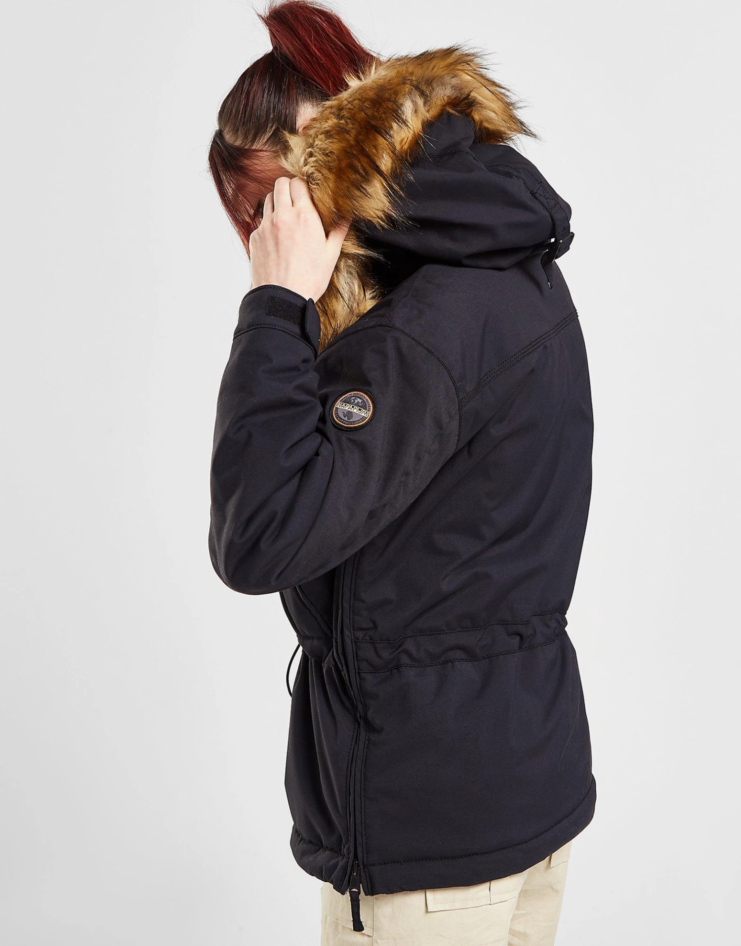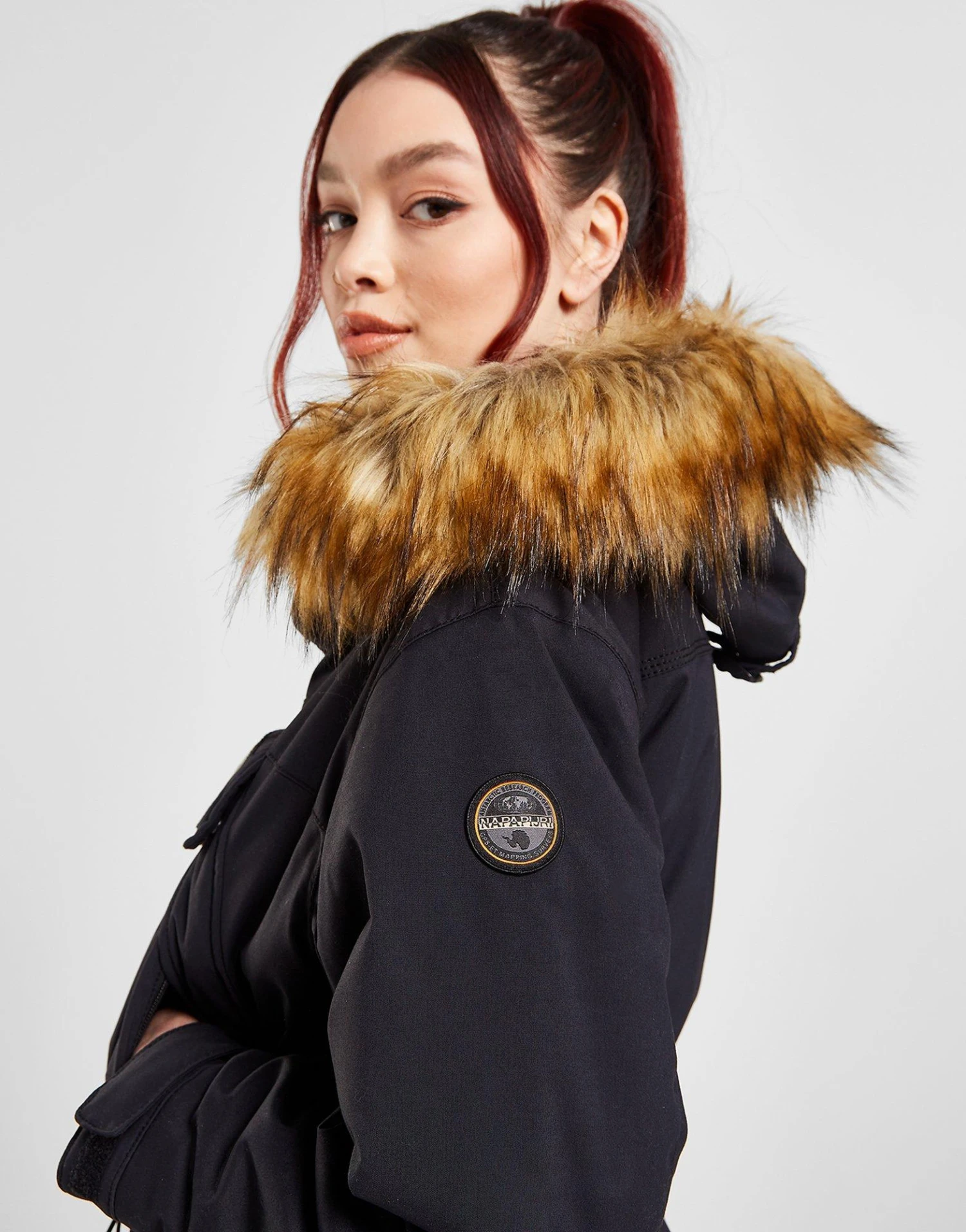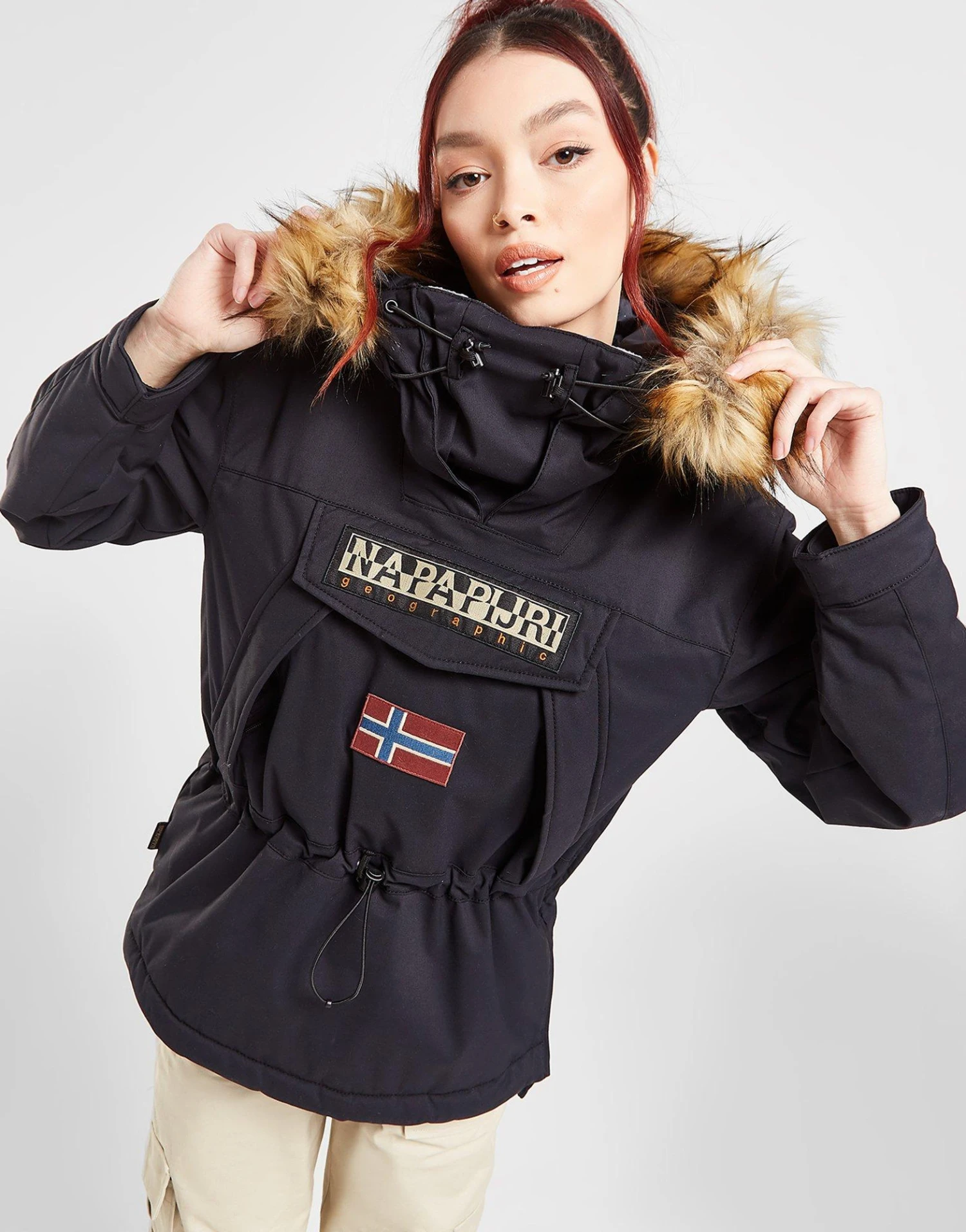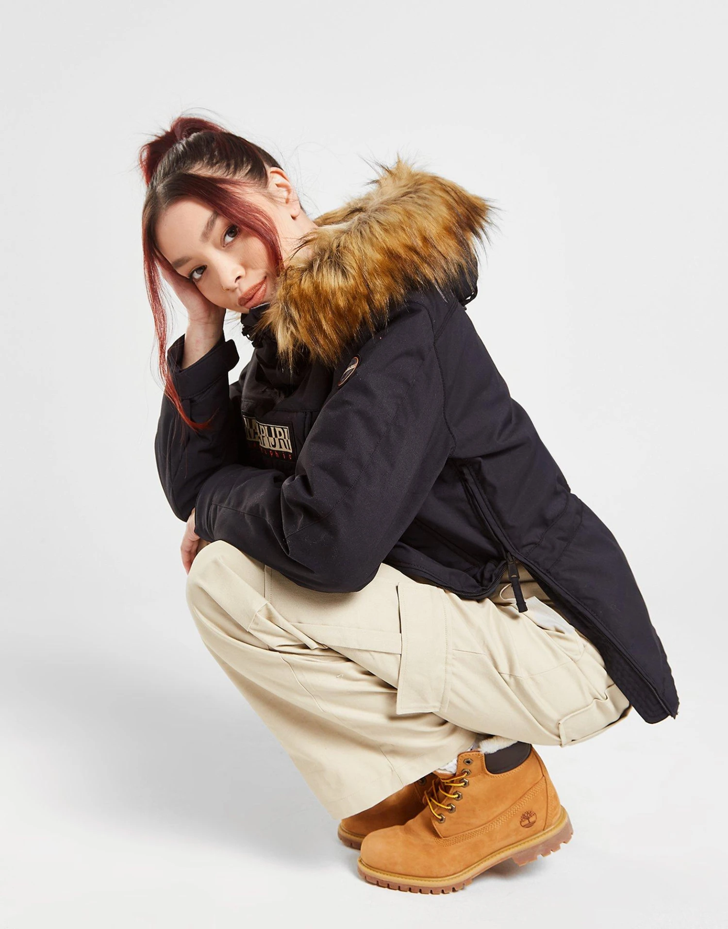 Upgrade your Winter warmers with this women’s Skidoo Ovheread Hooded Jacket from Napapijri. In a Black colourway, this standard-fit coat has a smooth, durable woven outer shell with a water-repellent finish for lasting wear. It has a plus Thermo-Fibre padding to lock in the heat, and it features a pullover design, with an adjustable faux fur-trimmed hood for cosy coverage. It has straps to secure the cuffs, and an adjustable toggle around the waist to customise the fit. With a side hem zipper for easy on-off and added airflow, it has a signature chest pocket with iconic Napapijri branding to sign off. | Our model is 5’10” and wears a size small.