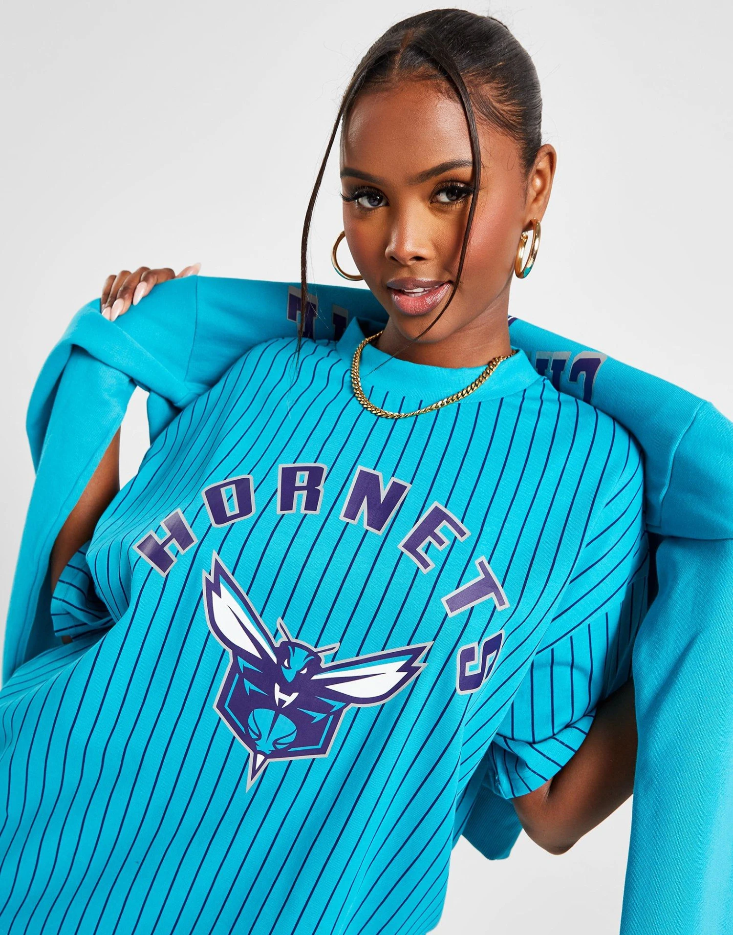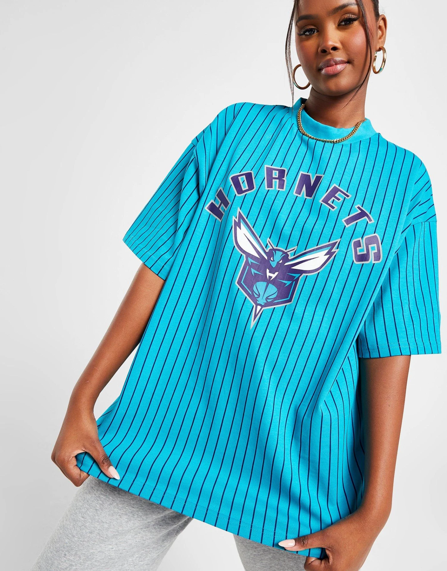 Rep your side with this women’s NBA Charlotte Hornets T-Shirt from New Era. Exclusive to JD, this loose-fit tee is made using a super-soft and lightweight cotton fabric for all-day comfort. In a Blue colourway, it features a crew neckline with short sleeves and a pin stripe design to amp up the look. Signed off with a Hornets graphic to the front. Machine washable. | Our model is 5’8″ and wears a size medium.
