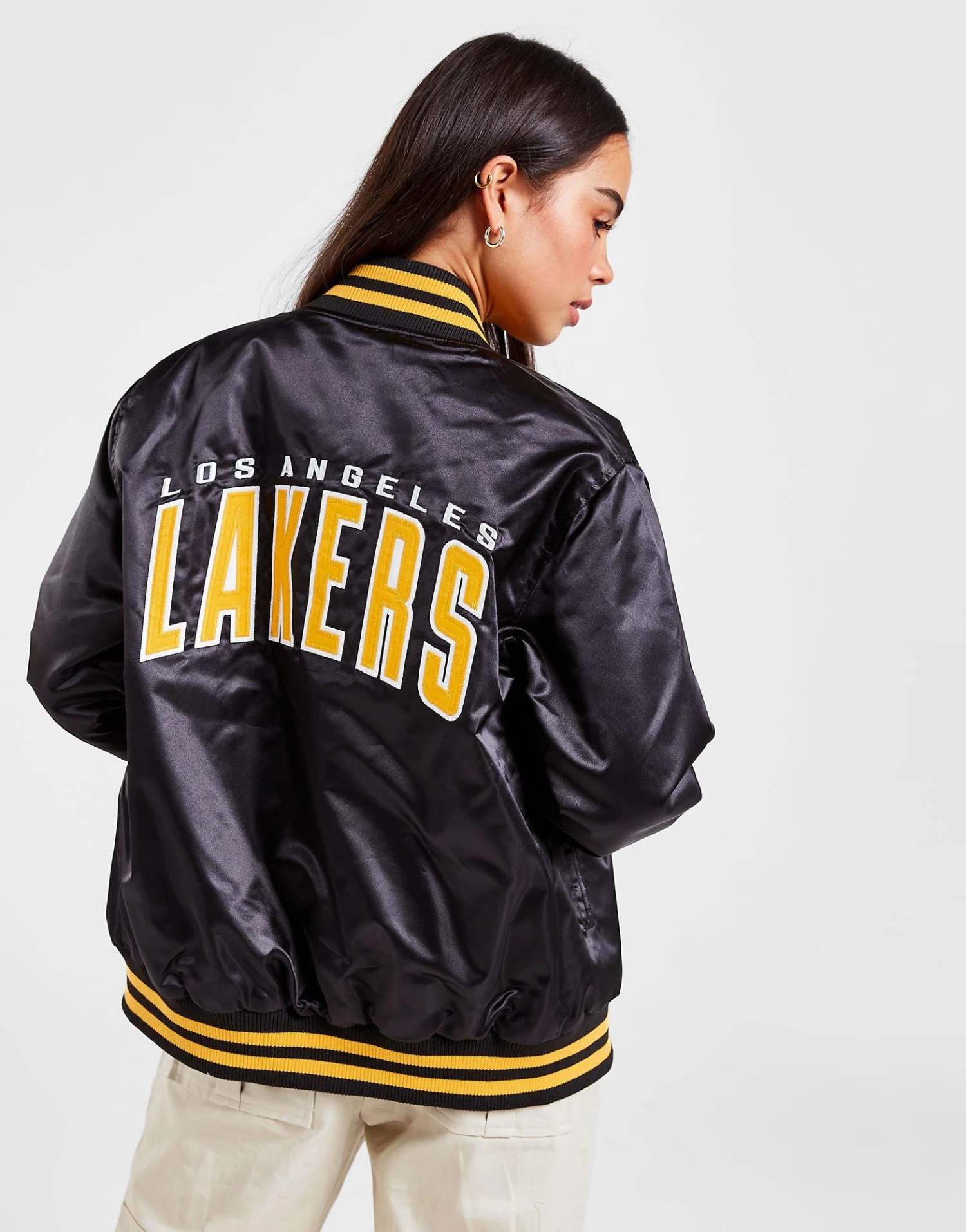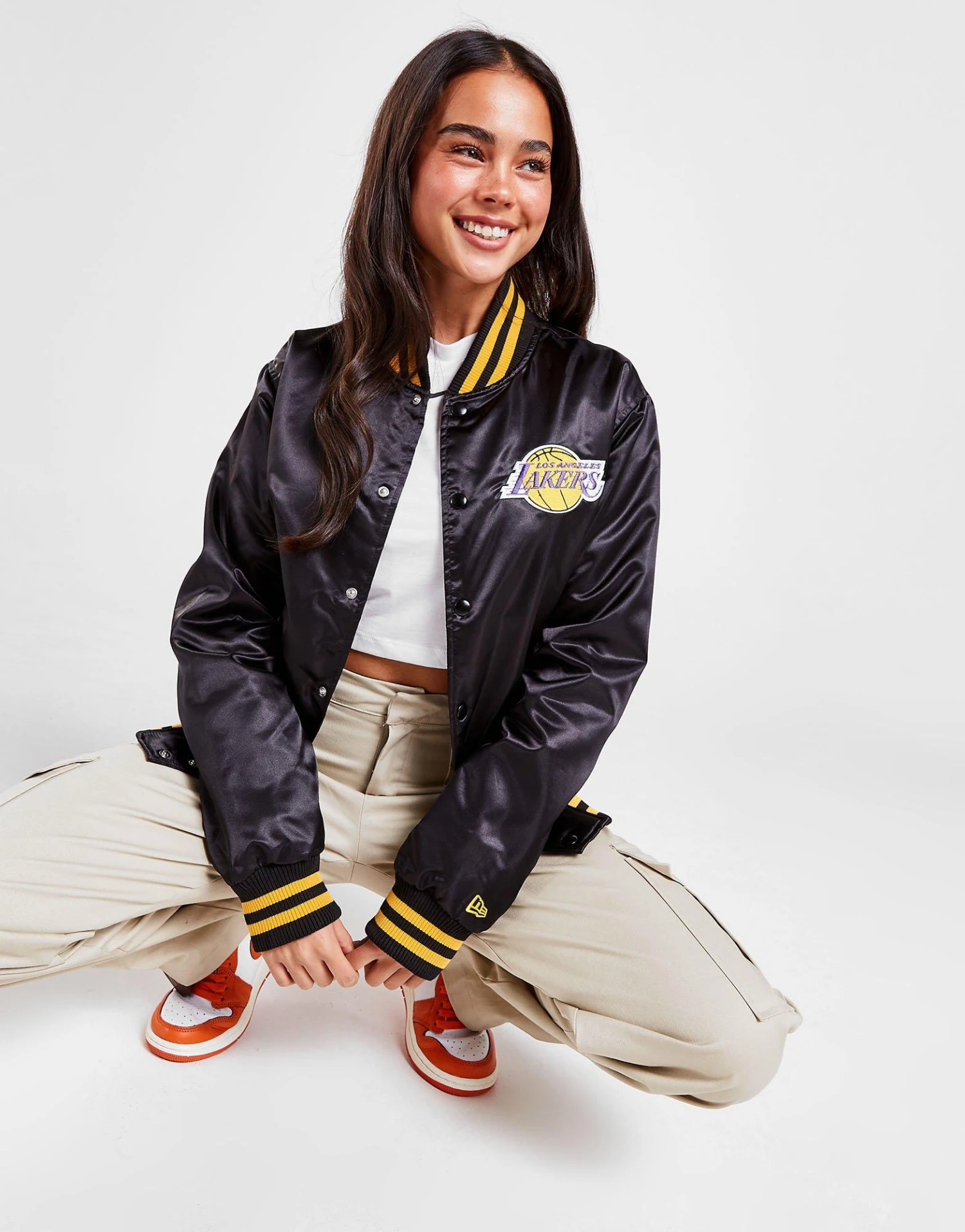 Upgrade your layers with some court-inspired style in this women’s NBA LA Lakers Satin Bomber Jacket from New Era. In a Black colourway, this jacket is made with smooth satin fabric for essential comfort. It features a full-length button placket and a classic bomber collar, with stretchy ribbed trims with Yellow striped detailing to secure the fit. It has front hand pockets for storage, and is finished up with a bold LA Lakers wordmark to the reverse. Signed off with a team logo badge at the chest. | Our model is 5’6″ and wears a size small.