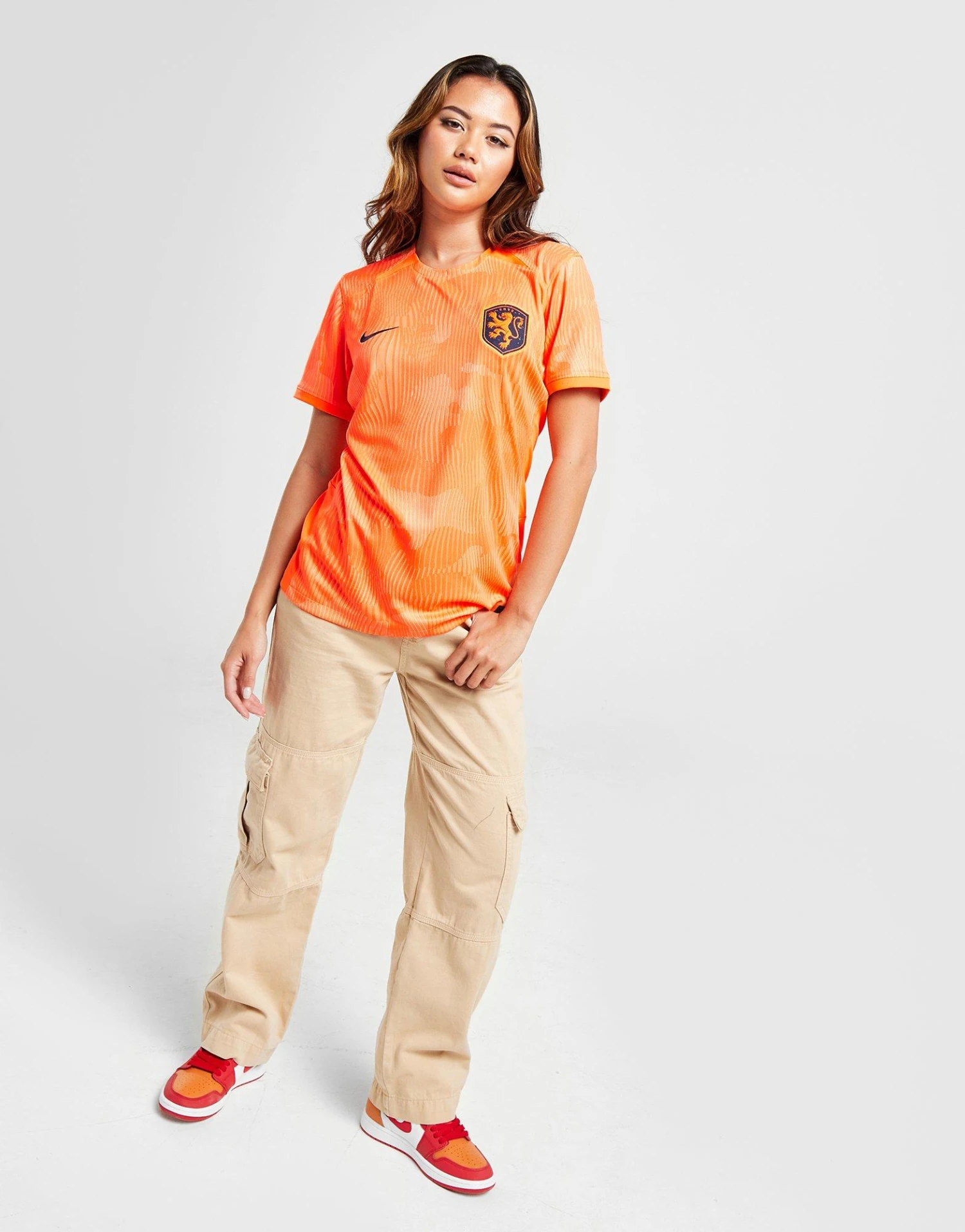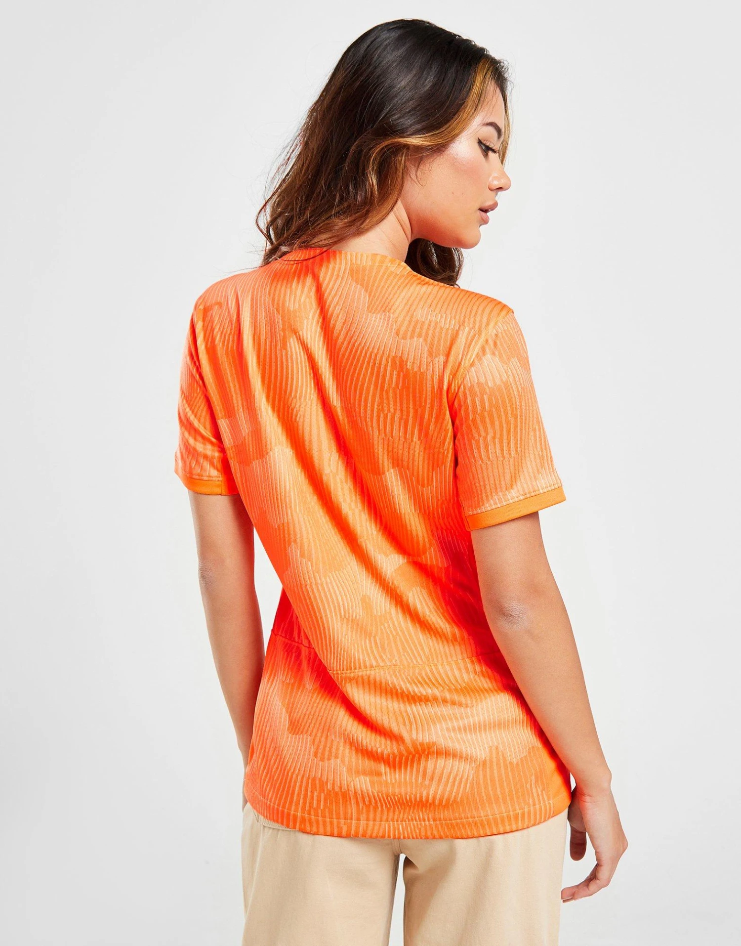 Cheer on the team with this women’s Netherlands Women 2023 Home Shirt from Nike. In the classic Cone Orange home colourway, this shirt is cut from light, breathable poyester fabric for cool comfort. It features short sleeves with a ribbed crew neckline and is equipped with Dri-FIT tech to wick away sweat. Finished up with the Netherlands crest and a Nike Swoosh to the chest. Machine washable.
