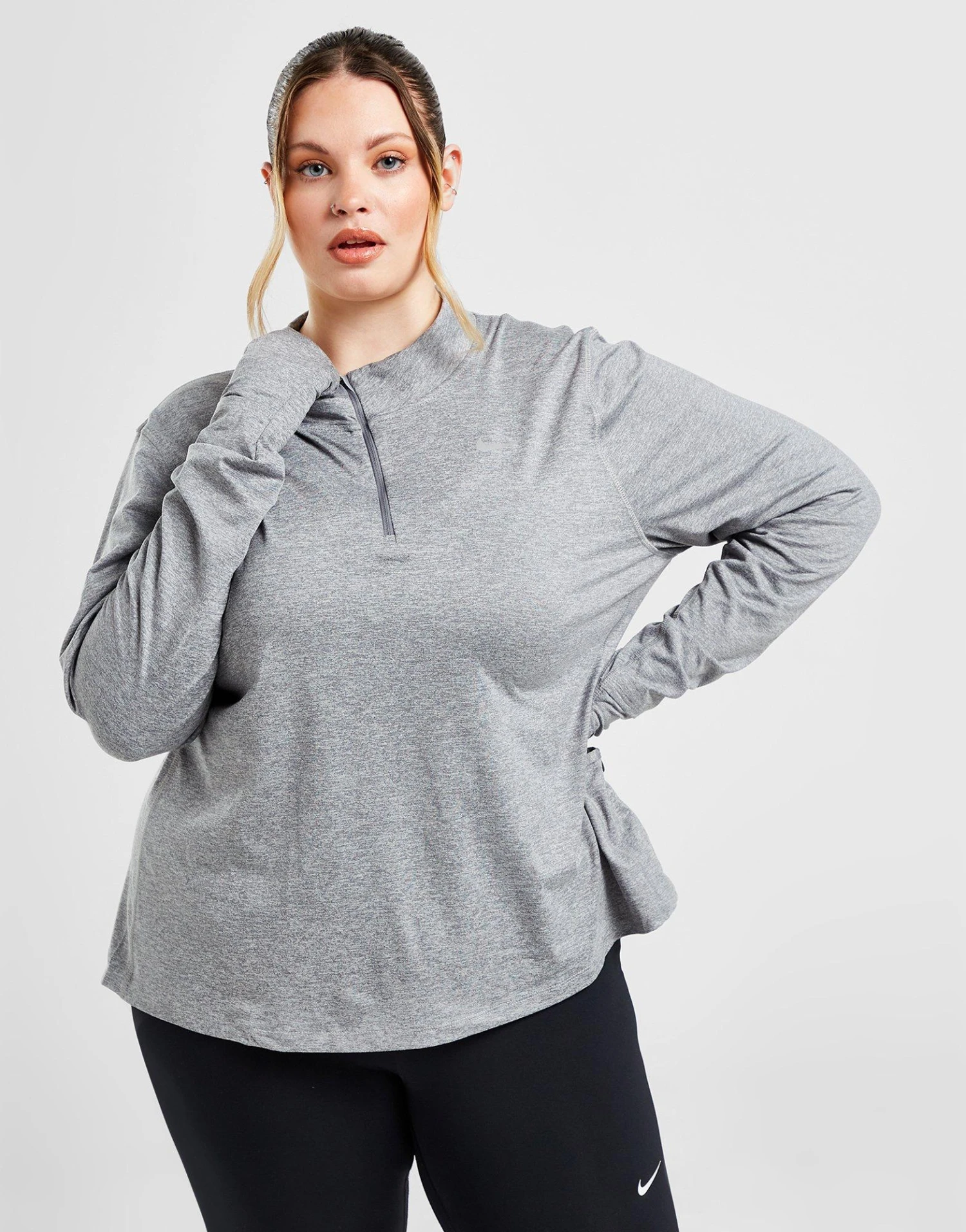 Get workout-ready with this women’s Plus Size Element 1/4 Zip Top from Nike. In a Smoke Grey and Light Smoke Grey colourway, this standard fit top is partly cut from recycled polyester fabric and is light and stretchy for flexible comfort as you train. It features a 1/4-zip fastening for custom coverage and is equipped with Dri-FIT sweat-wicking to keep you dry and fresh. It has thumbholes for a secure fit, a left stash pocket for your essentials and is finished up with reflective Swoosh branding to keep you seen. Machine washable | Our model is 5’8″ and wears a size 1X.