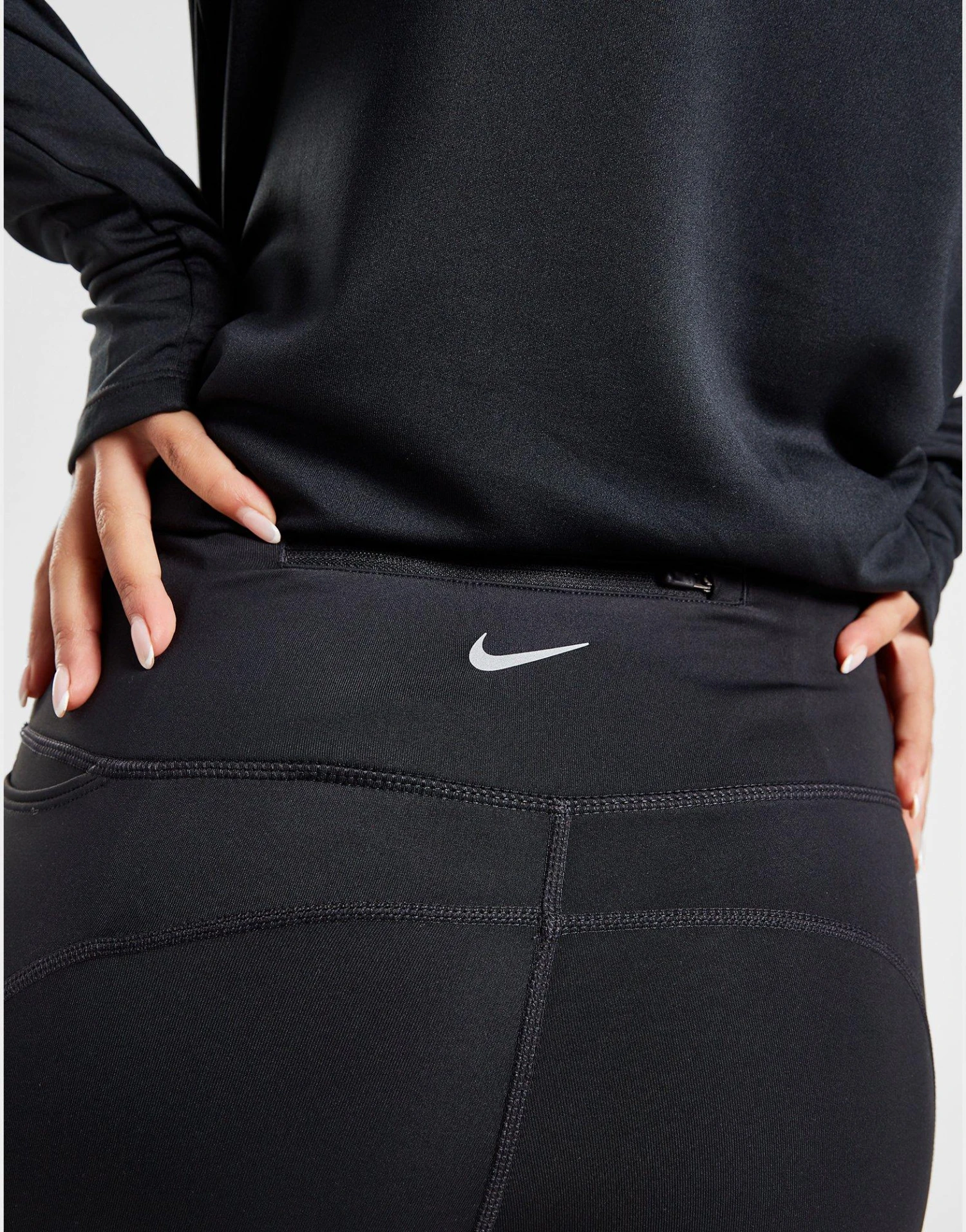 Freshen up your training gear with these women’s Running Fast Swoosh Tights from Nike. Coming in a Black colourway, these body-hugging tights are made with super-smooth, stretch-woven poly fabric for supreme comfort. Crafted with Dri-FIT tech to wick away sweat, they have breathable mesh panels to the back of the knees for ventilated wear. They feature a wide, elasticated waistband for a secure fit, as well as drop-in and zip pockets to store the essentials. Finished with signature Nike branding at the lower leg. Machine washable. | Our model is 5’8″ and wears a size small.