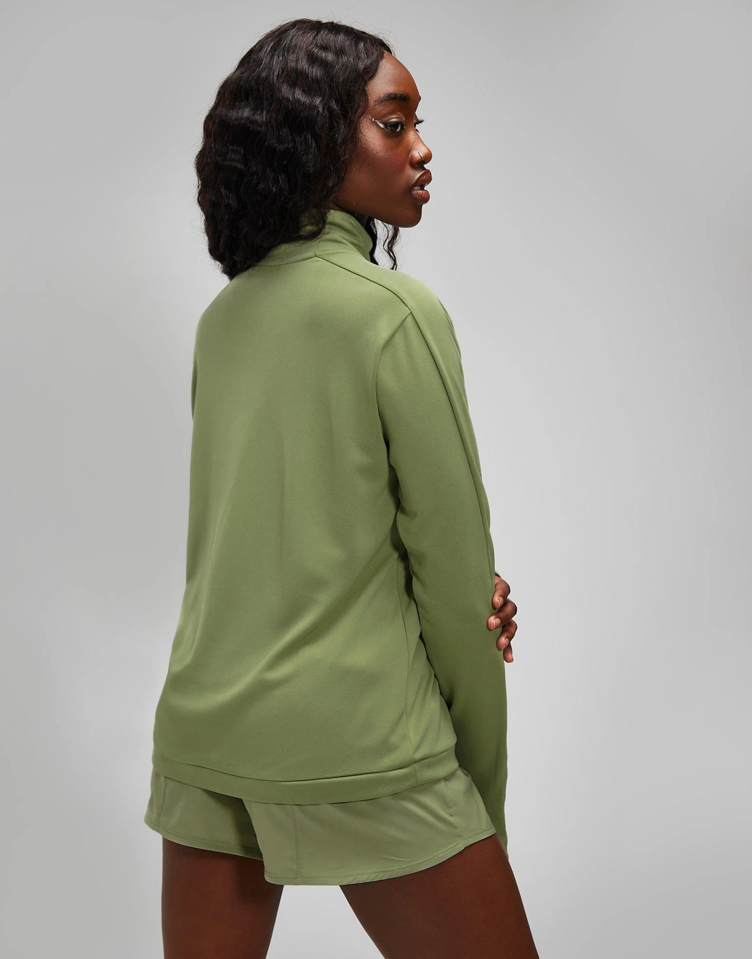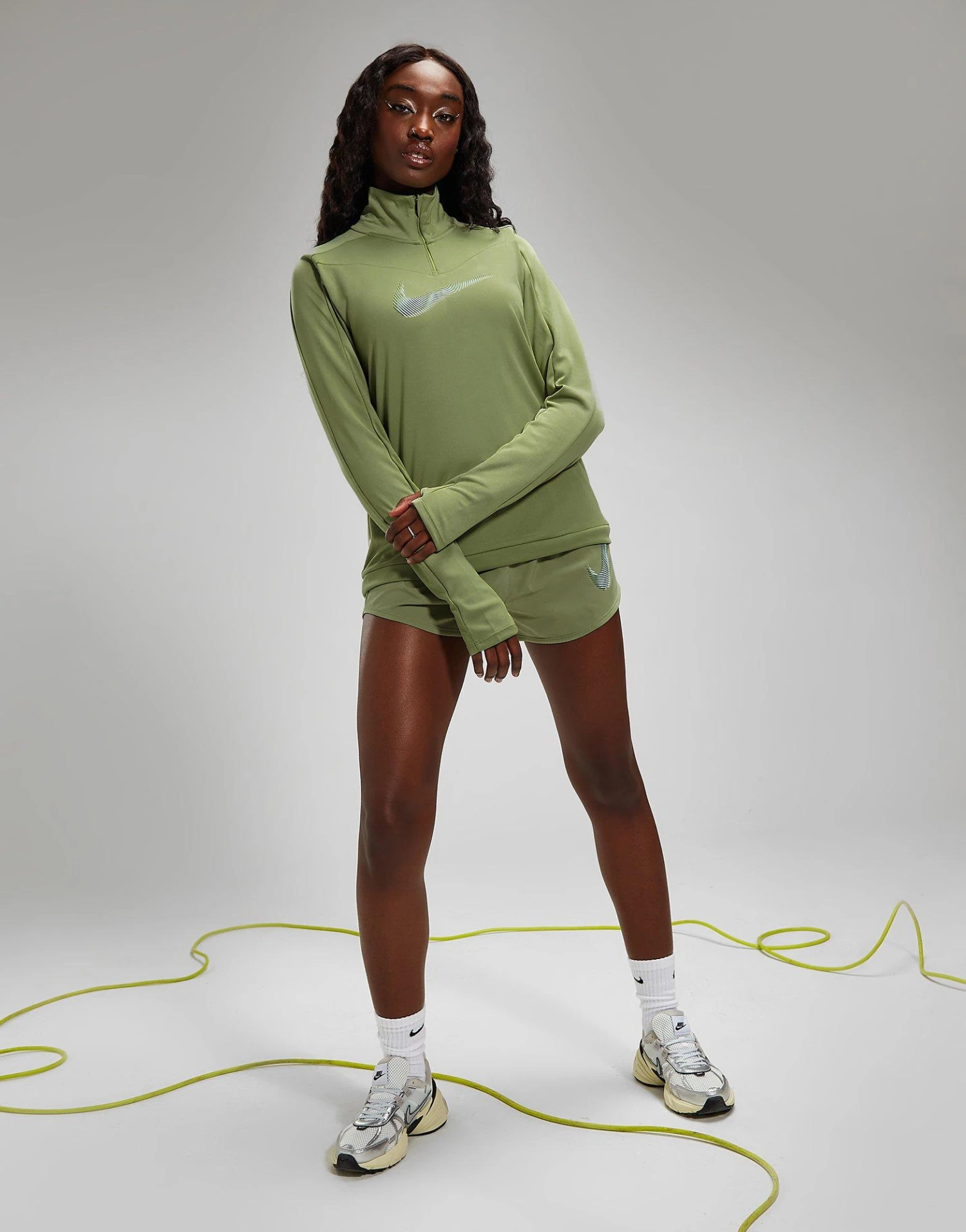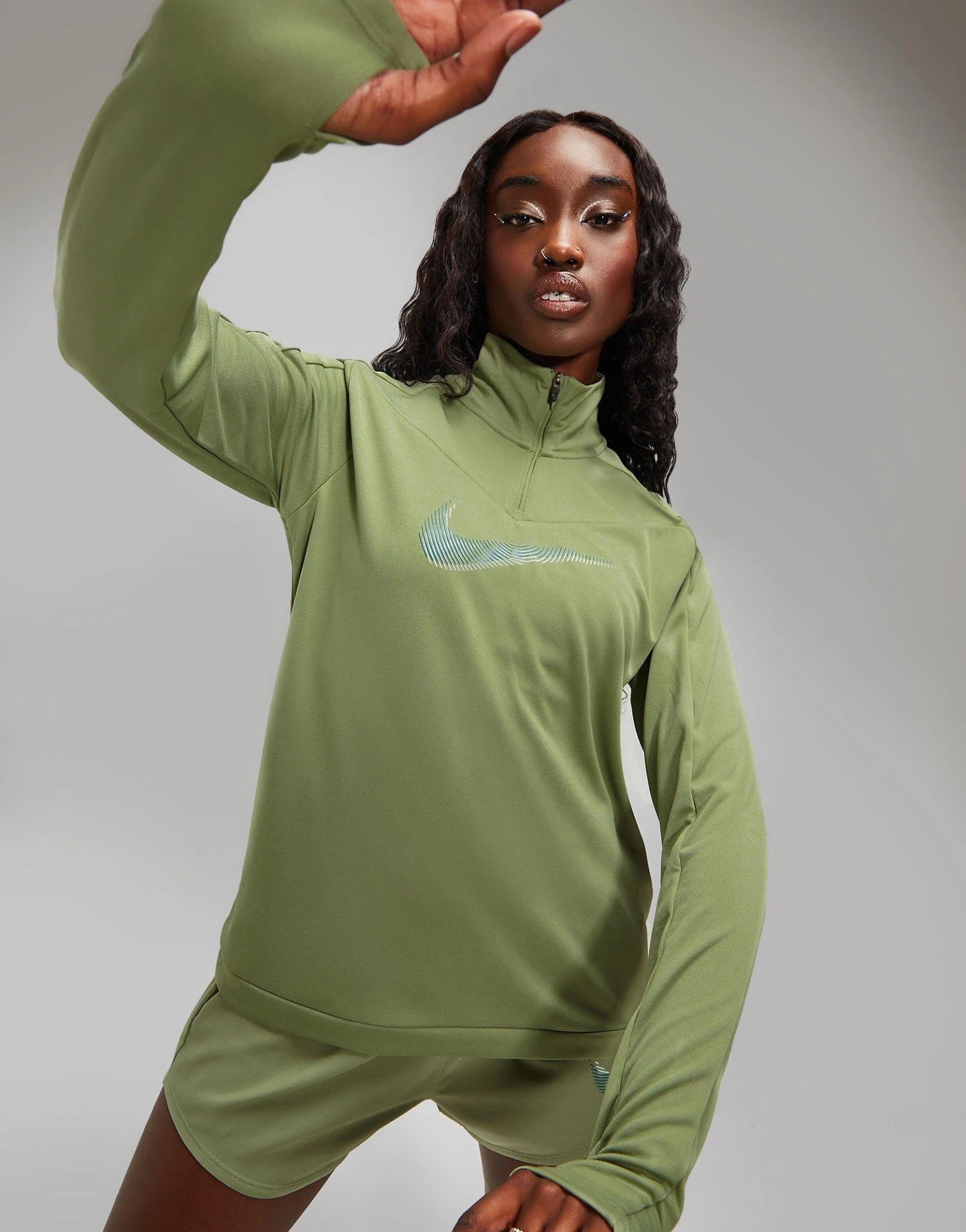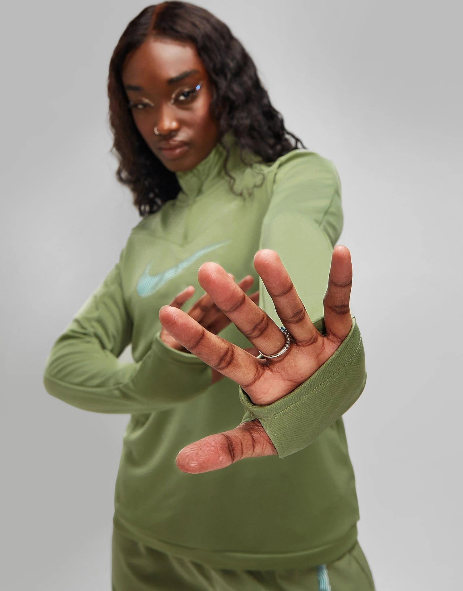 Take your training up a level with this women’s Runninsh Swoosh 1/4 Zip Top from Nike. In a JD-exclusive Oil Green colourway, this top is made with smooth, lightweight poly fabric for lasting comfort. It’s crafted with sweat-wicking Dri-FIT tech to keep you cool and dry, and features a quarter zip fastening with a stand-up collar to switch up your look and your airflow. It has long, streamlined sleeves with thumb loops for a secure fit, and is signed off with the iconic Swoosh logo to the chest. Machine washable. | Our model is 5’7″ and wears a size small.