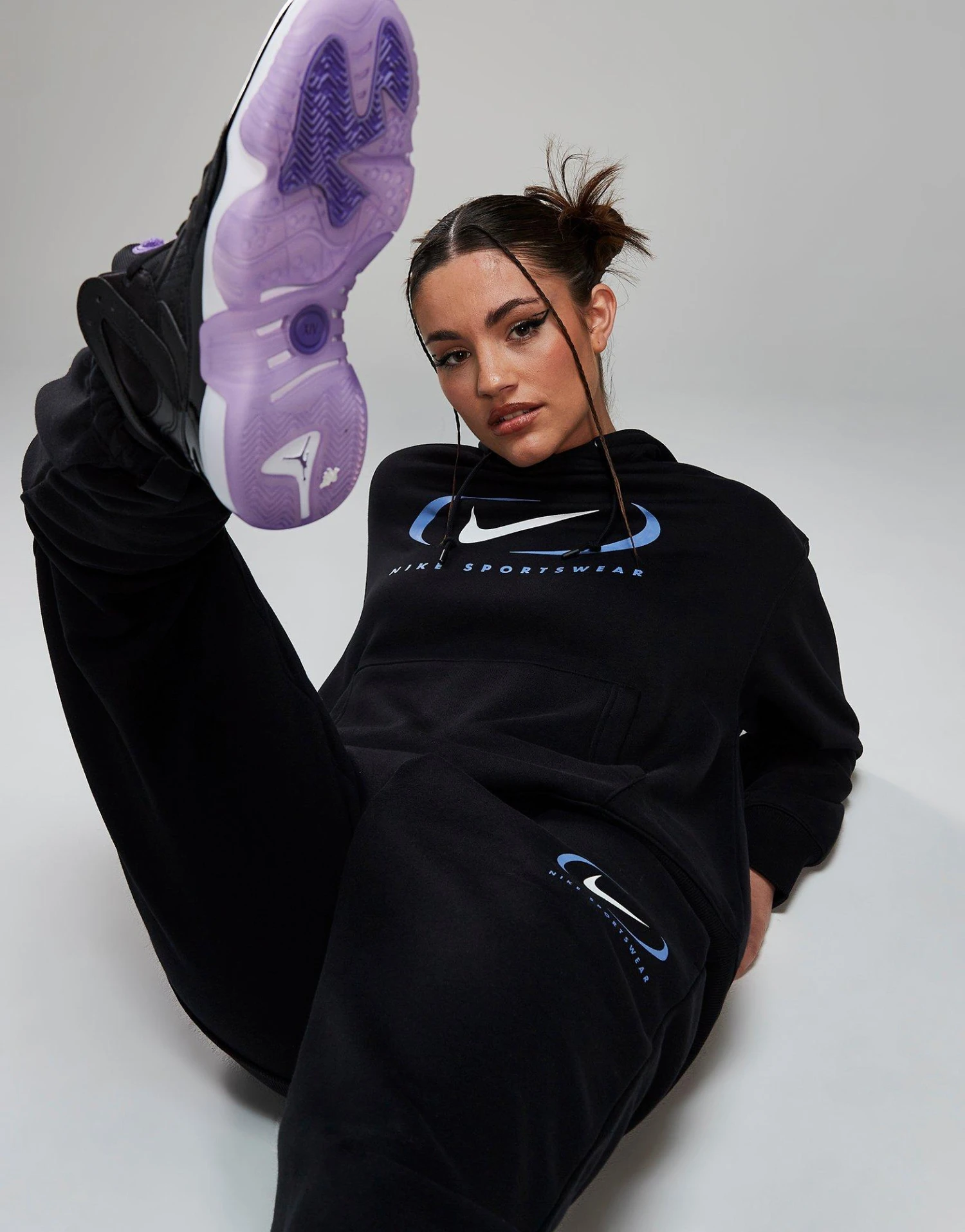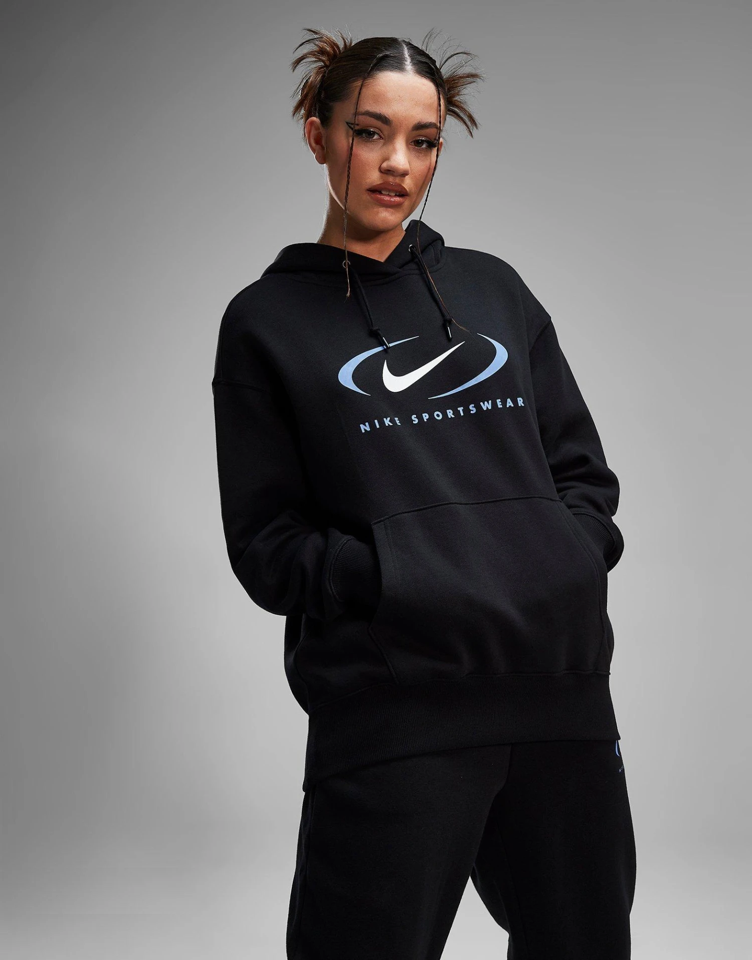 Layer up in retro-inspired style with this women’s Sportswear Swoosh Overhead Hoodie. In a Black colourway, this JD-exclusive pullover is made from midweight brushed-back fleece fabric for lasting comfort. It has dropped shoulders, a kangaroo pocket and ribbed trims for a laidback feel, while the drawcord-adjustable hood offers custom coverage. Finished off with a retro Swoosh print stamped to the chest. Machine washable. | Our model is 5’8.5″ and wears a size small.
