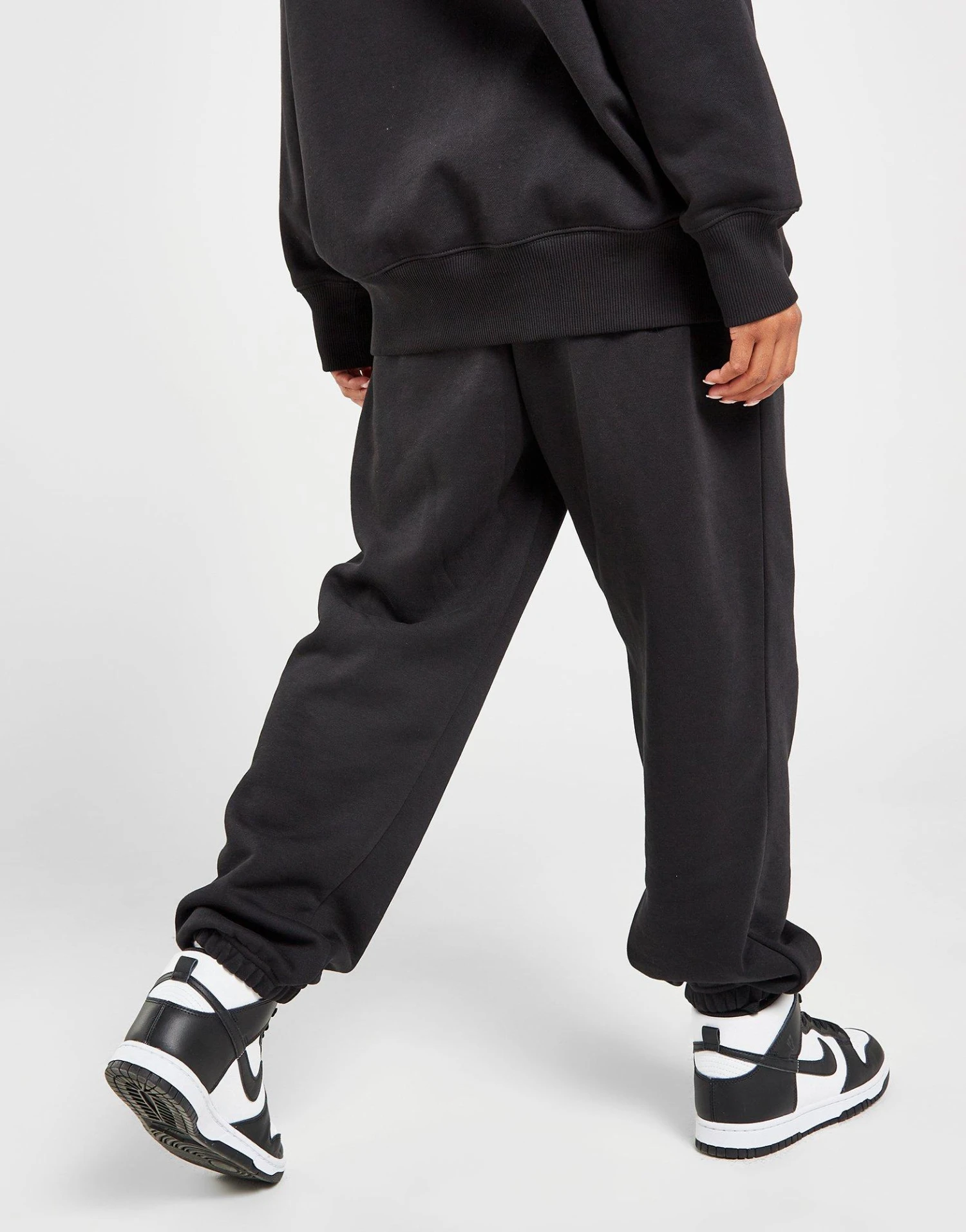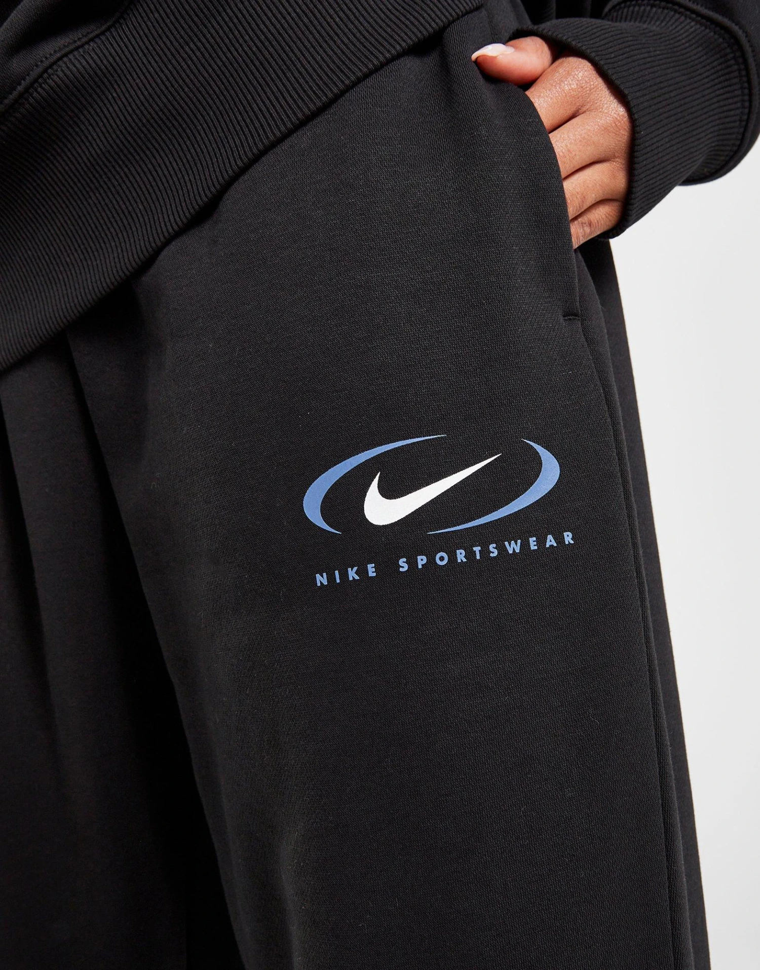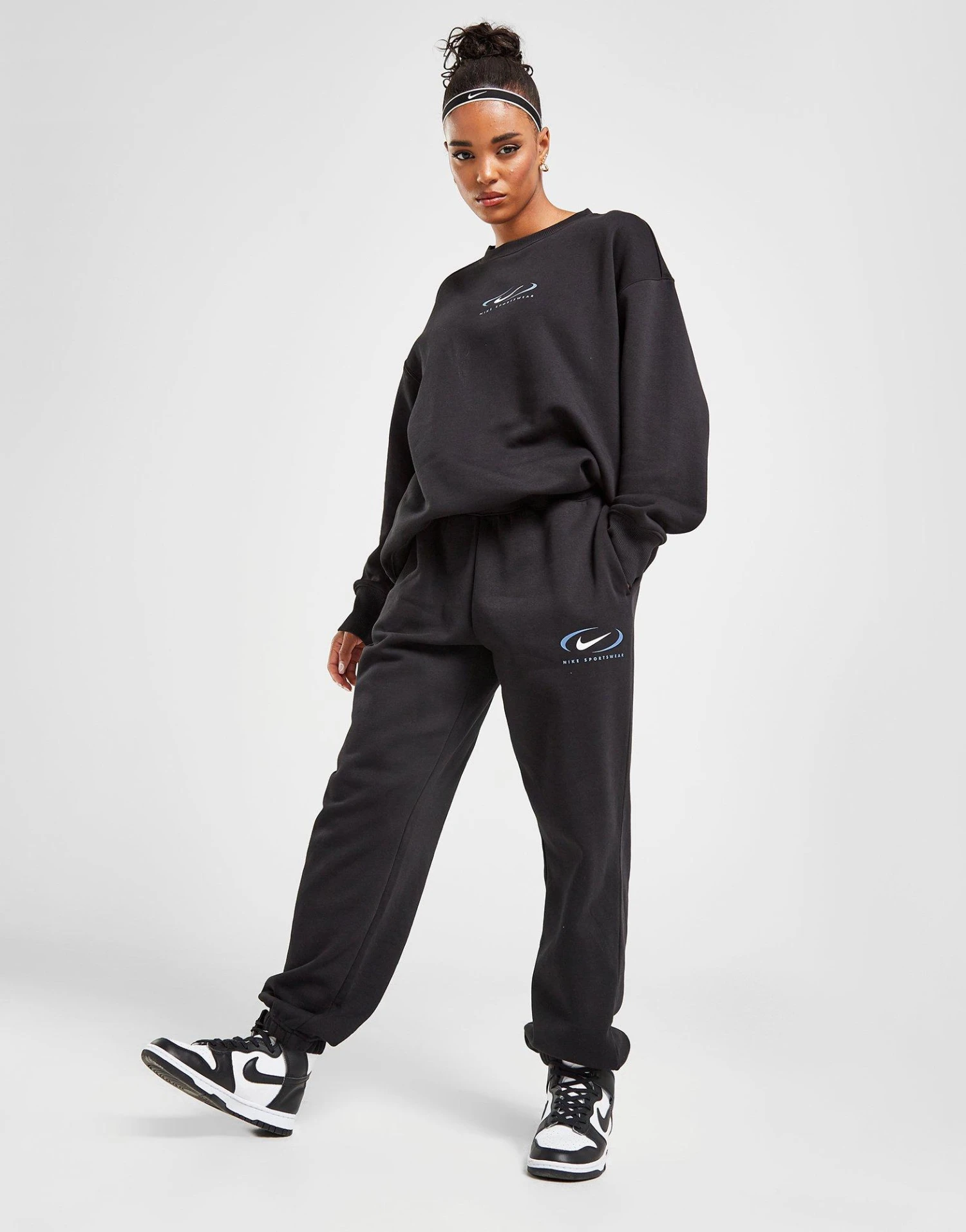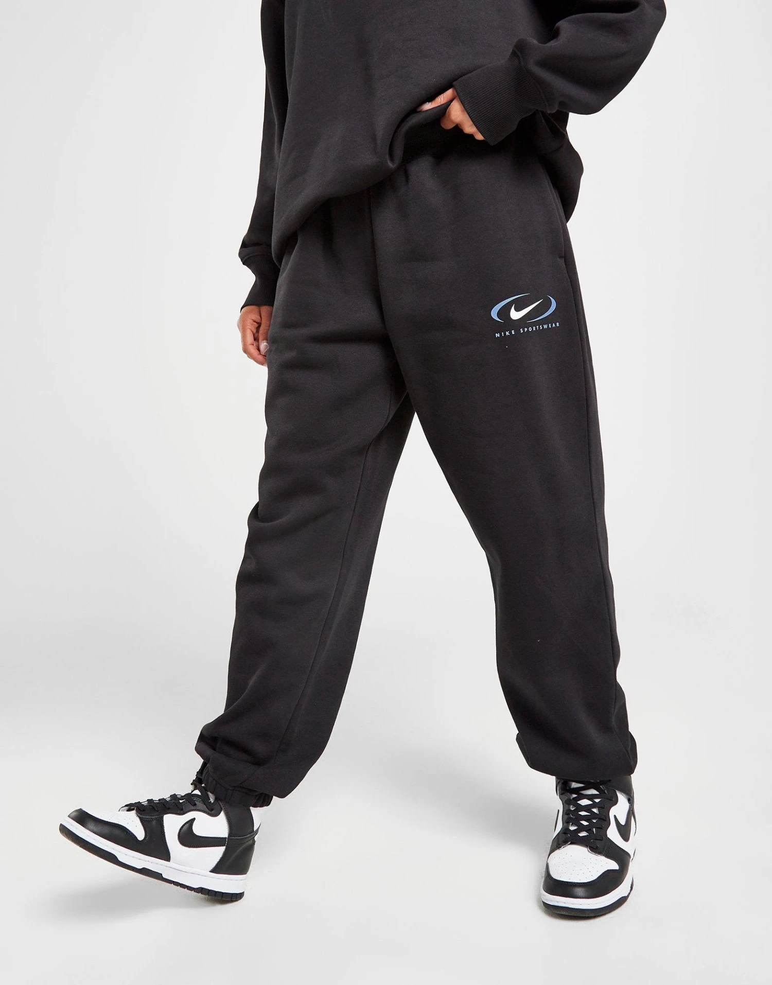 Refresh your off-duty look with a ’90s vibe in these women’s Sportswear Swoosh Oversized Joggers from Nike. In a Black colourway, these JD-exclusive sweats are cut from brushed-fleece fabric for laidback comfort. They have a drawcord-adjustable waistband for a custom fit, while the roomy legs are tapered with cuffed ankles. With open-hand side pockets for your essentials, these joggers are finished off with a heritage-inspired Swoosh graphic to the left thigh. Machine washable. | Our model is 5’8.5″ and wears a size small.