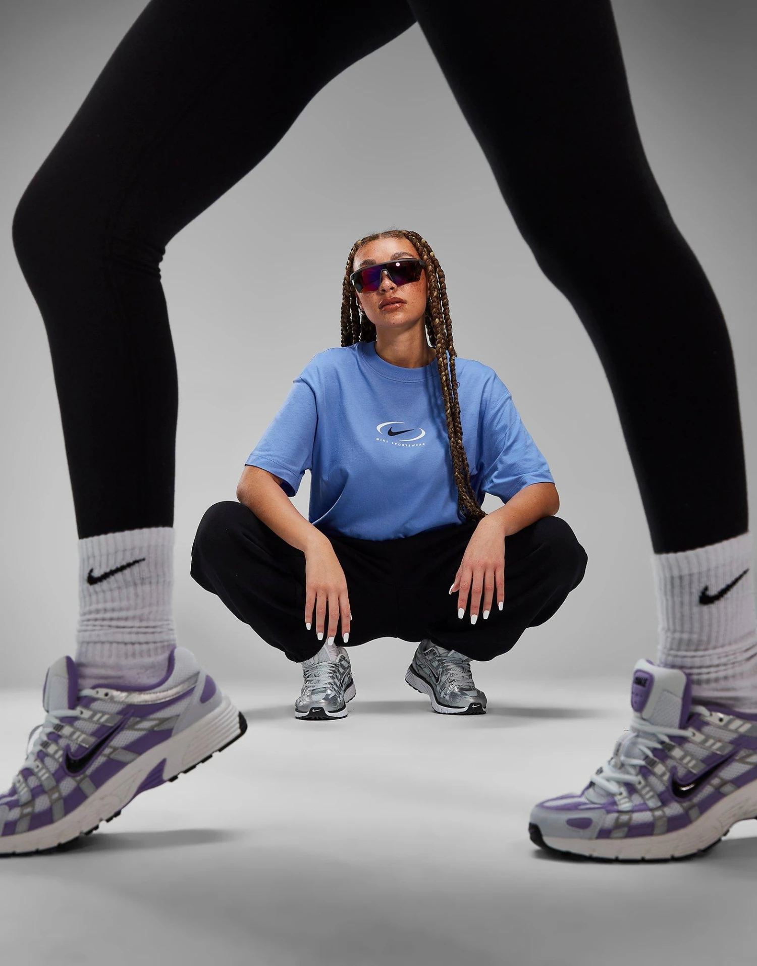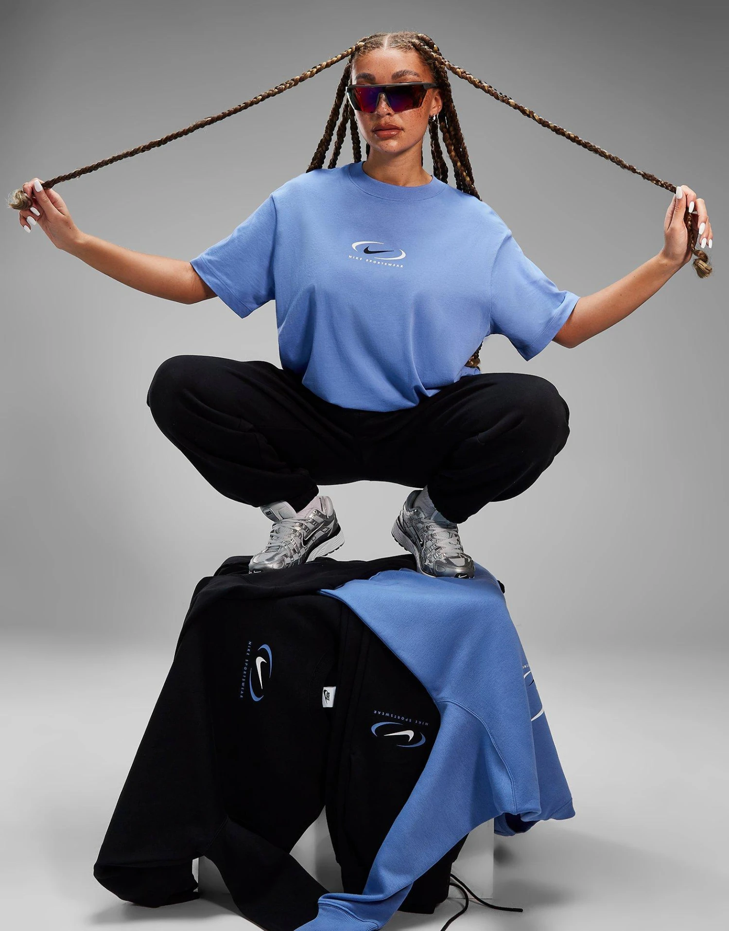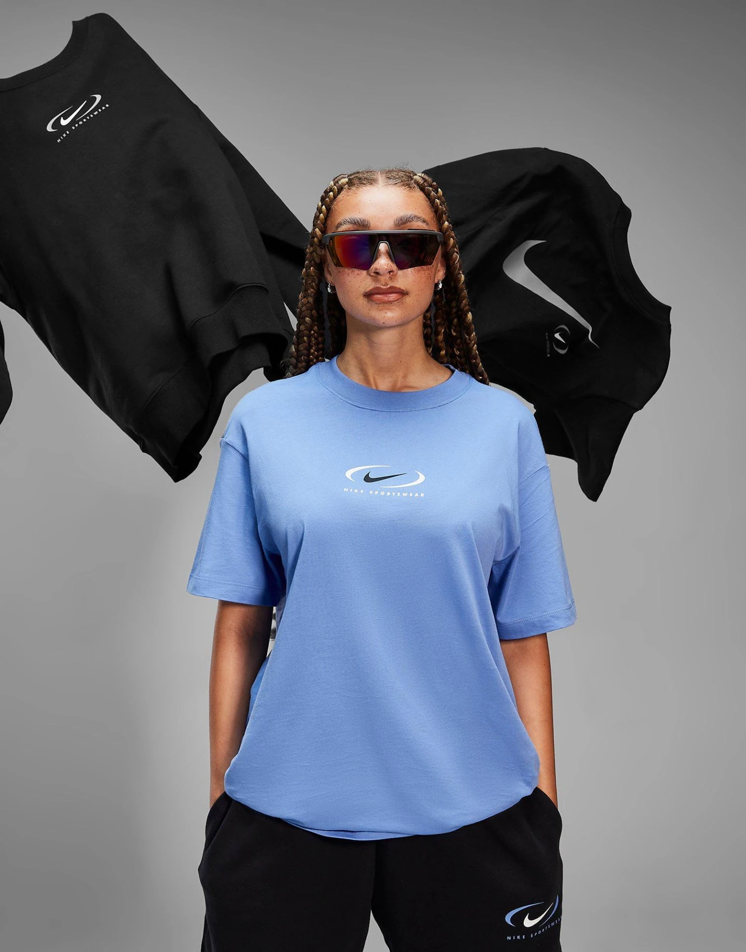 Take it easy with this women’s Sportswear Swoosh Short-Sleeve T-Shirt from Nike. In a Polar Blue colourway, this baggy-fitting, JD-exclusive tee is cut from soft, lightweight cotton fabric for total comfort. It features short sleeves with a ribbed crew neckline and is finished up with Nike branding to the chest. Machine washable | Our model is 5’6.5″ and wears a size small.