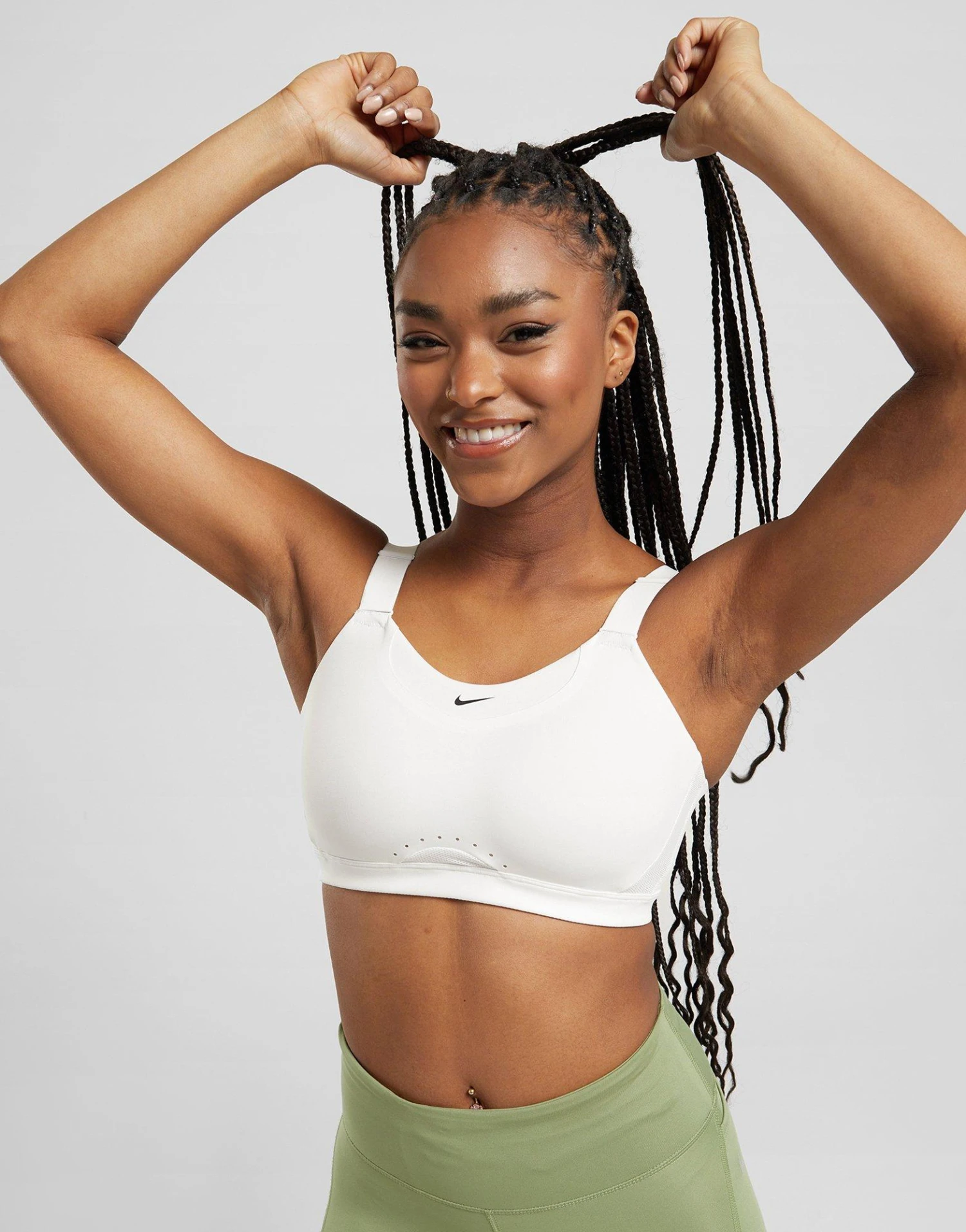 If you’re after high-level, compressive support as you train, this Training Alpha Bra from Nike has you covered. Coming in a White colourway, this tight-fit sports bra is cut from a smooth, stretchy poly fabric for lasting comfort. It’s equipped with sweat-wicking Dri-FIT tech and breathable perforations to keep you cool, as well as an open back design for added airflow. It has wide, adjustable straps for the perfect fit that feels secure, and a hook-and-loop back clasp for easy on-off. The molded cups deliver body-hugging support with a compressive feel. Finished with signature Nike branding at the chest. Machine washable. | Our model is 5’7″ and wears a size small.