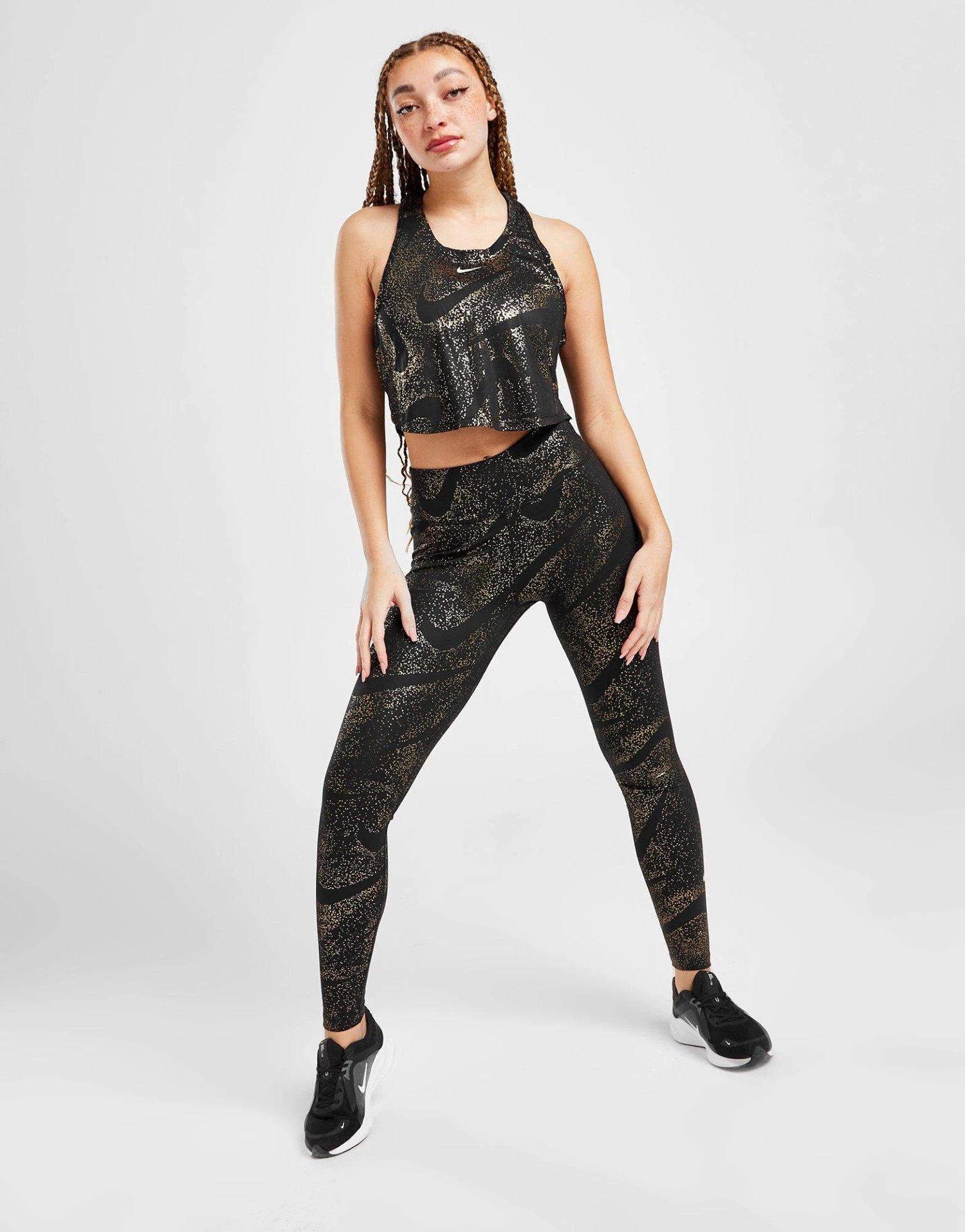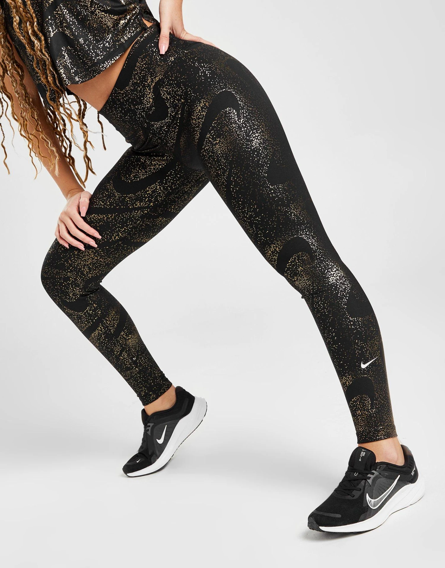 Step up your workout wear with these women’s Training Galaxy All Over Print Tights from Nike. In a Black colourway with a metallic gold, galaxy-inspired print, these tight-fit leggings are made from smooth and stretchy, non-sheer fabric, which passes the squat test to keep you covered. They have seamless sides and Nike’s Dri-FIT tech to wick away sweat. With a high-rise, contoured waistband with a V shape to the back to give you a smooth silhouette, these tights are finished up with hidden pockets for your essentials and signature Nike branding. | Our model is 5’7″ and wears a size small._