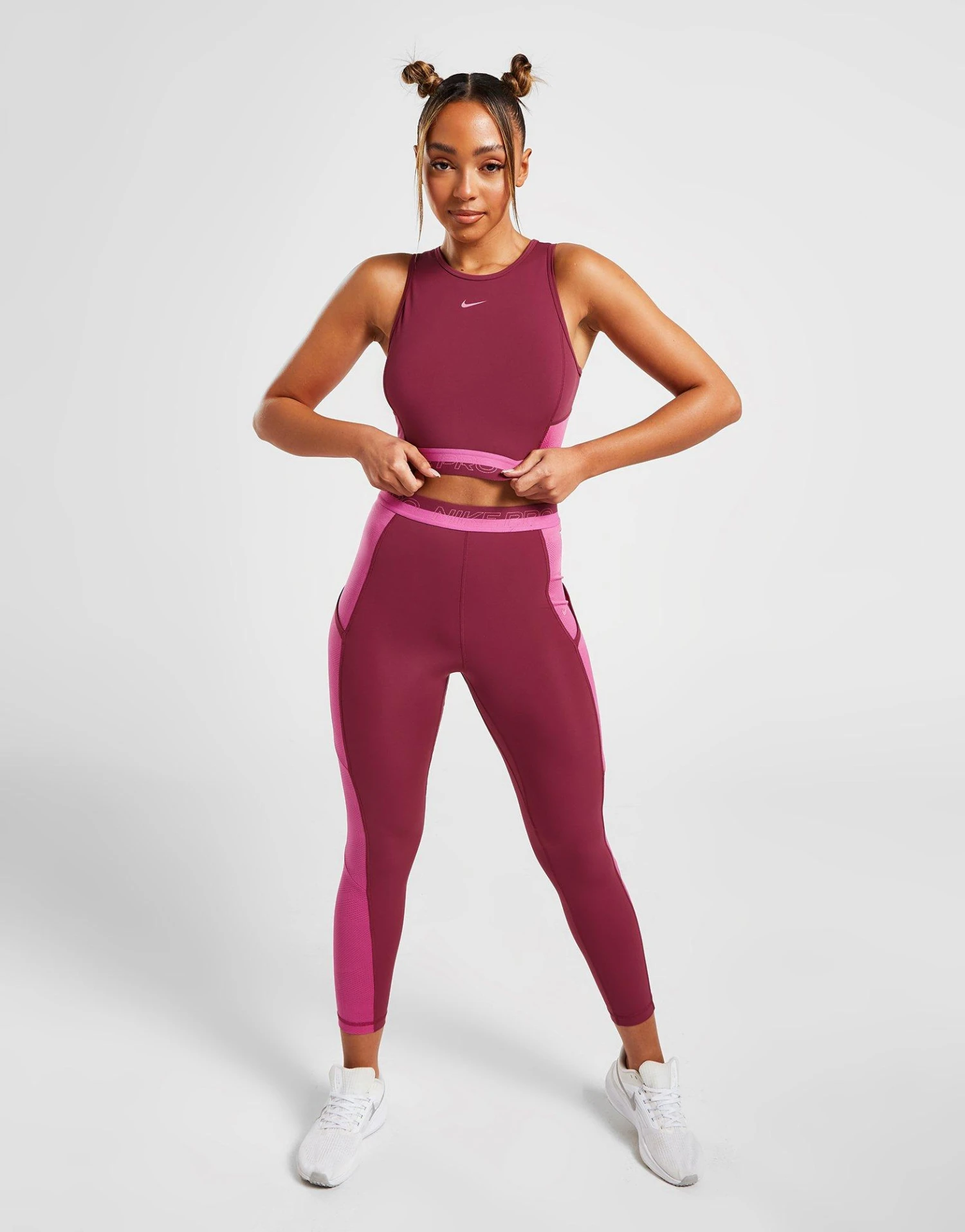 Power through your workout in this women’s Training Pro Femme Tank Top from Nike. In a Rosewood colourway, this slim-fit tank is made from smooth and stretchy poly fabric with a cropped design. It has Dri-FIT tech to wick away sweat, and features mesh panels to the back to keep you cool. With a round neckline and an elasticated hem, this fitness top is finished up with signature Nike Pro branding. Machine washable. | Our model is 5’8″ and wears a size small.