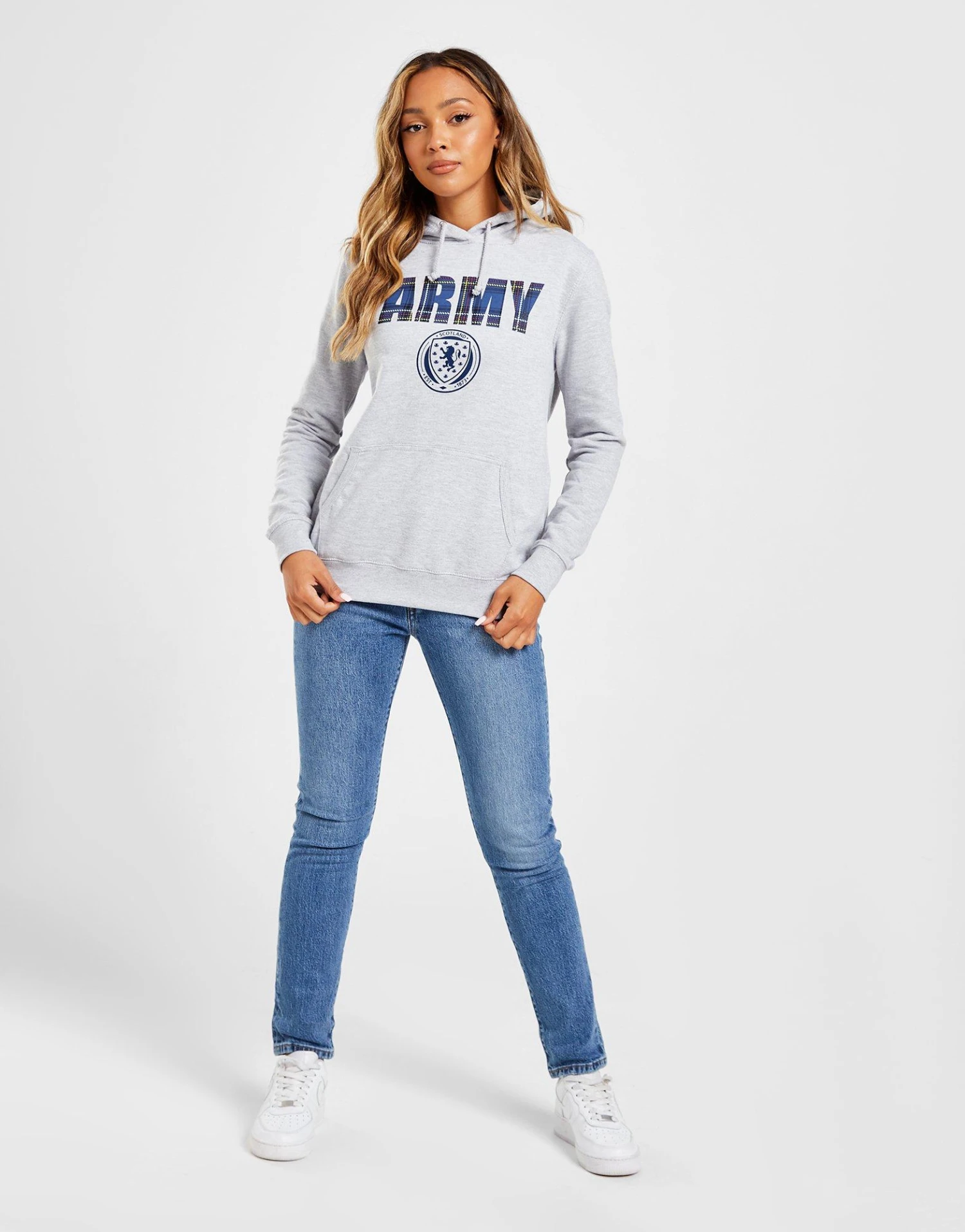 Get behind your side in this women’s Scotland Army Hoodie from Official Team. In a Grey colourway, this standard-fit hoodie is made from soft cotton fleece fabric. It has an overhead design and features a central kangaroo pocket, as well as an adjustable hood for extra coverage. With ribbed trims for a custom fit, this hoodie is finished up with an ‘ARMY’ wordmark to the chest in a tartan print, as well as the iconic Scotland crest. Machine washable. | Our model is 5’8″ and wears a size 8.