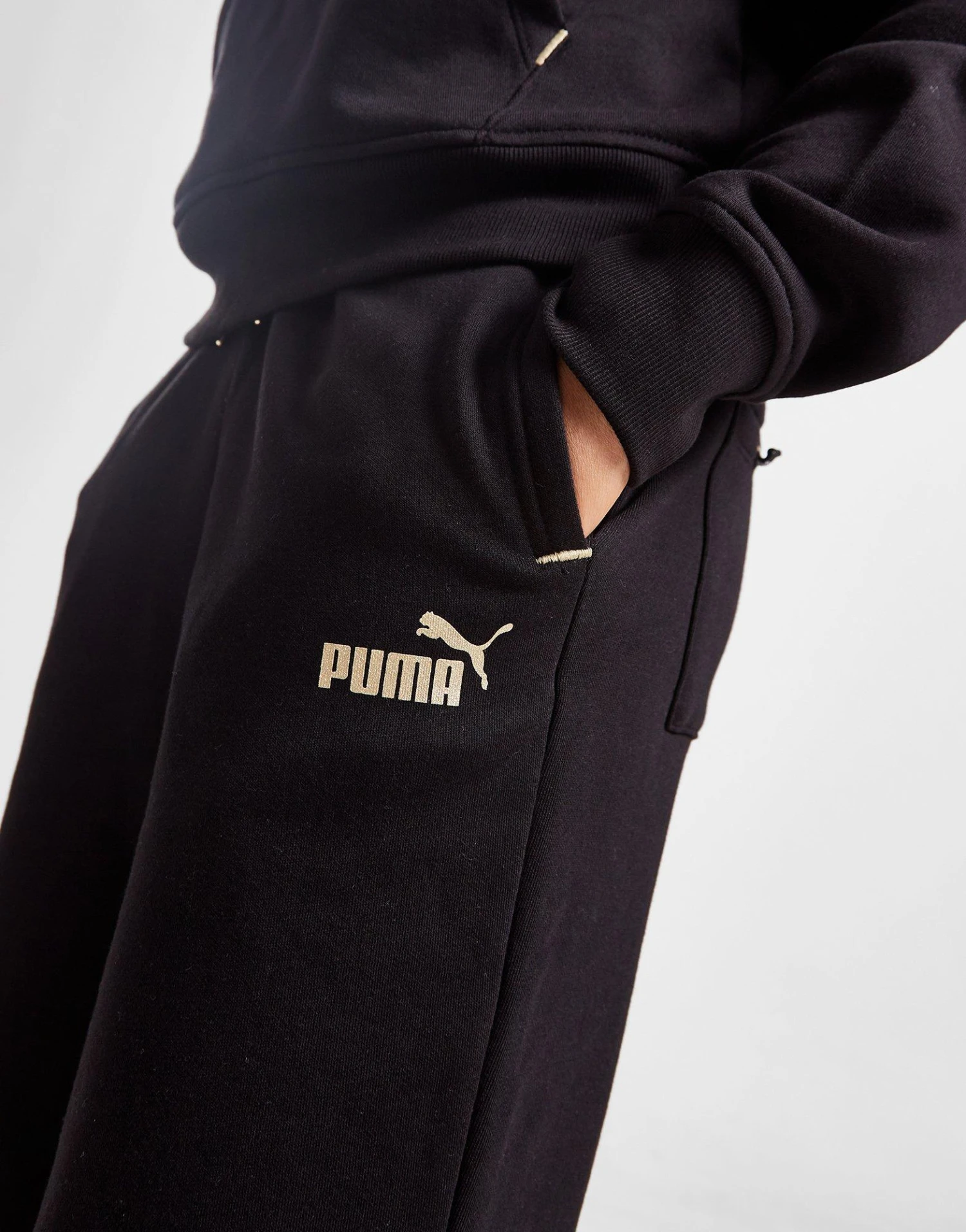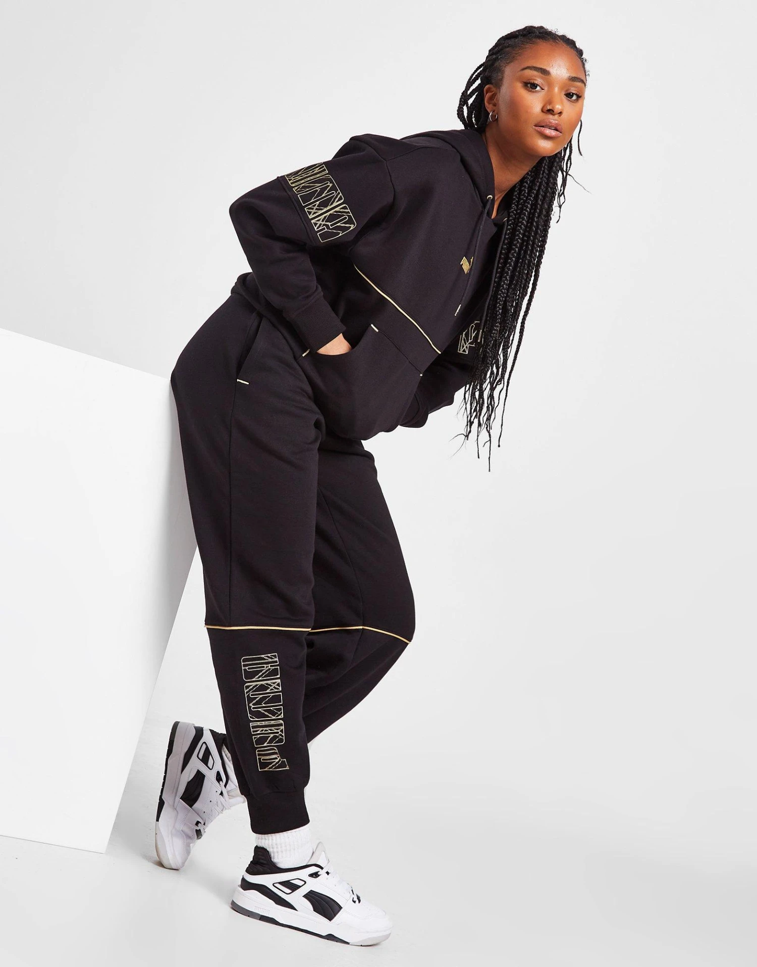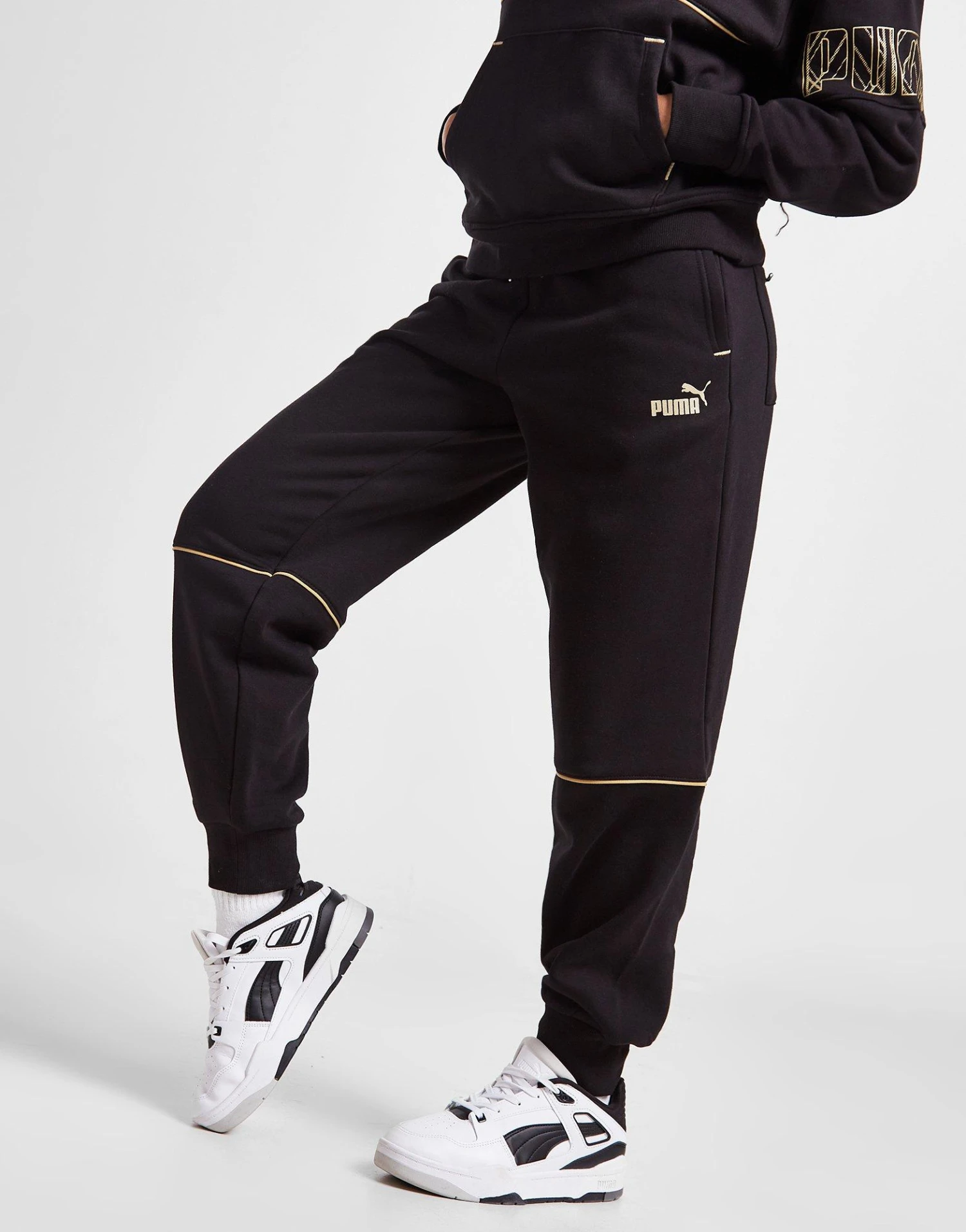 Level up your off-duty essentials with these women’s Power Deco Joggers from PUMA. In a Black colourway, these standard-fit sweats are made with a super-soft cotton-blend fabric for lasting comfort. Featuring an elasticated waistband with a drawcord to adjust the fit, they have ribbed ankle cuffs to secure the shape and side pockets for storage. Finished up with a contrasting PUMA wordmark graphic at the lower leg, and signature branding to the thigh. Machine washable.