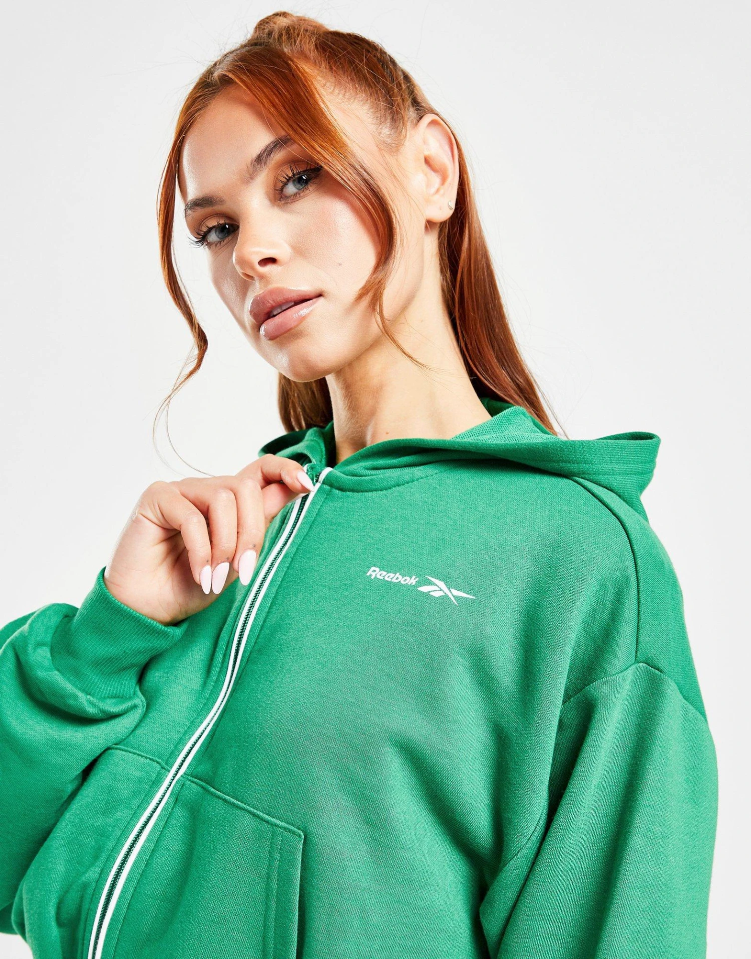 Make your weekend chills extra comfy with this women’s Classic Full Zip Hoodie from Reebok. In a Glen Green colourway, this retro-sport hoodie has a cropped hem and stretchy ribbed trims for a boxy fit. It features a full zip fastening, a roomy hood and side pockets. Made from a cotton and recycled poly blend for a super-soft feel, this hoodie is finished off with White Reebok branding to the chest. Machine washable. | Our model is 5’7″ and wears a size small.