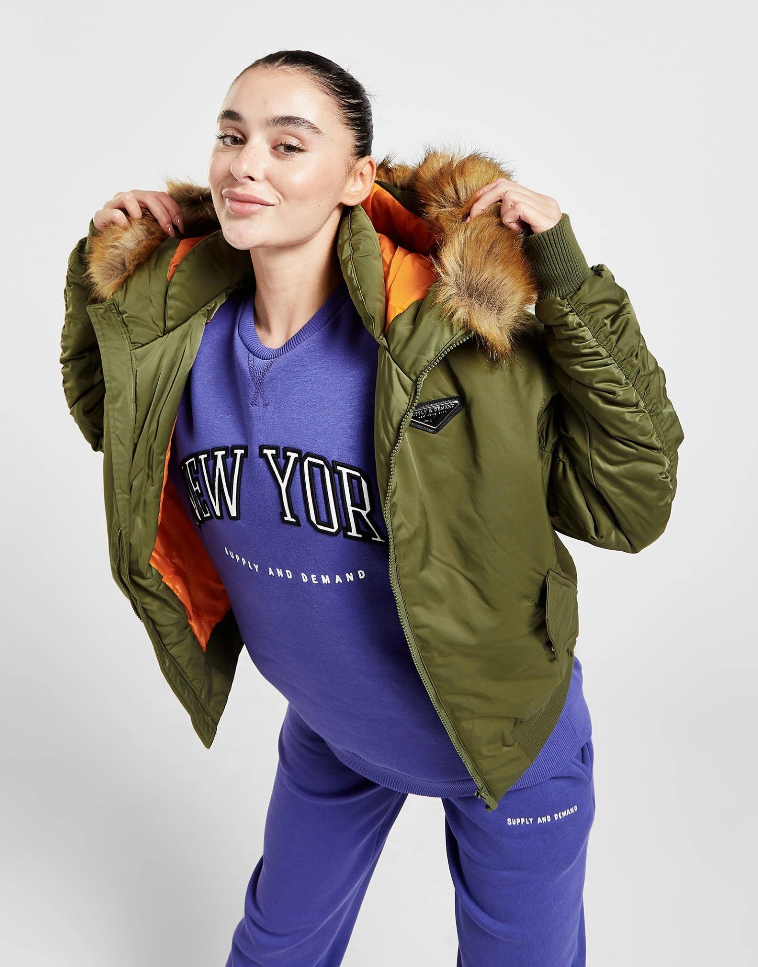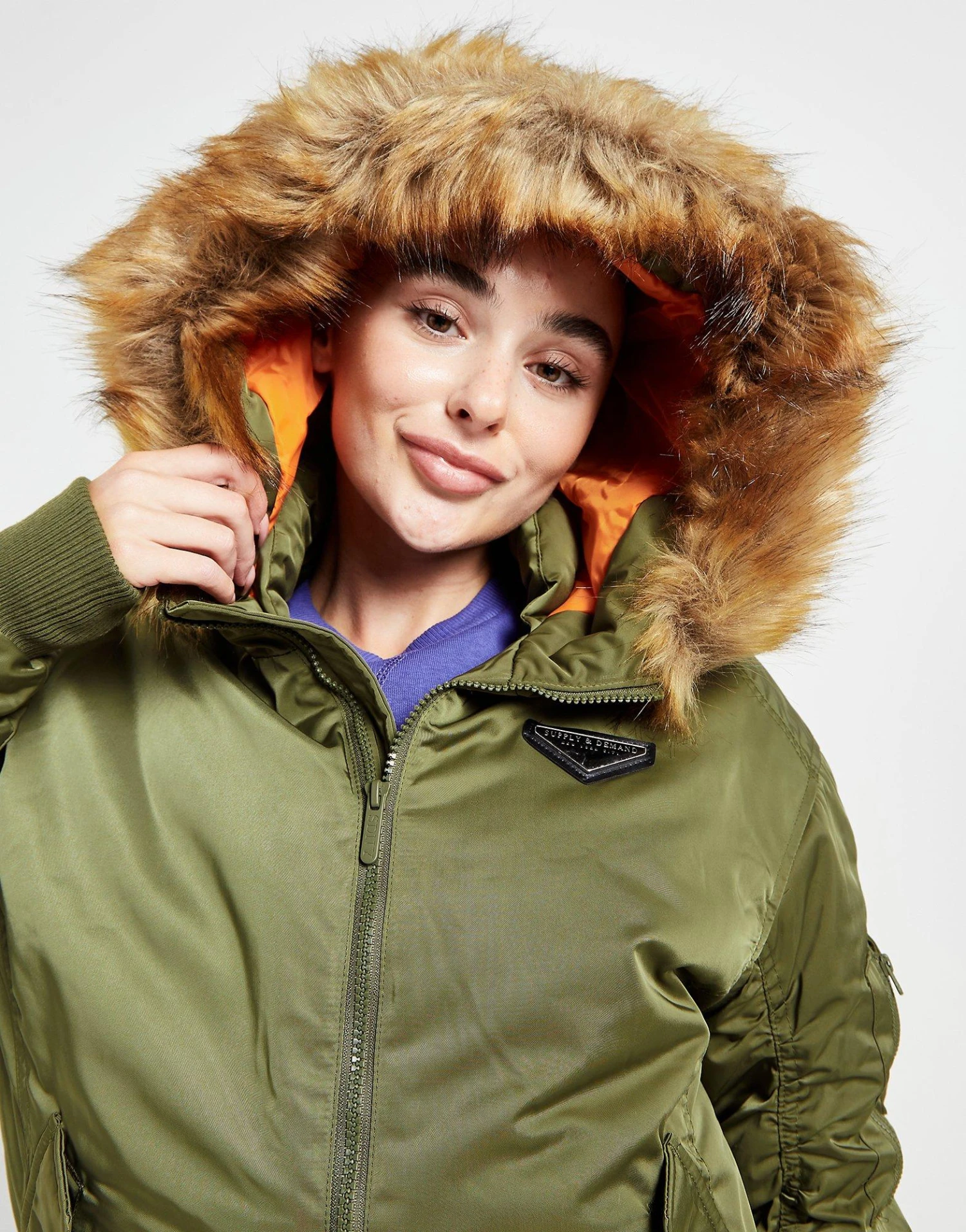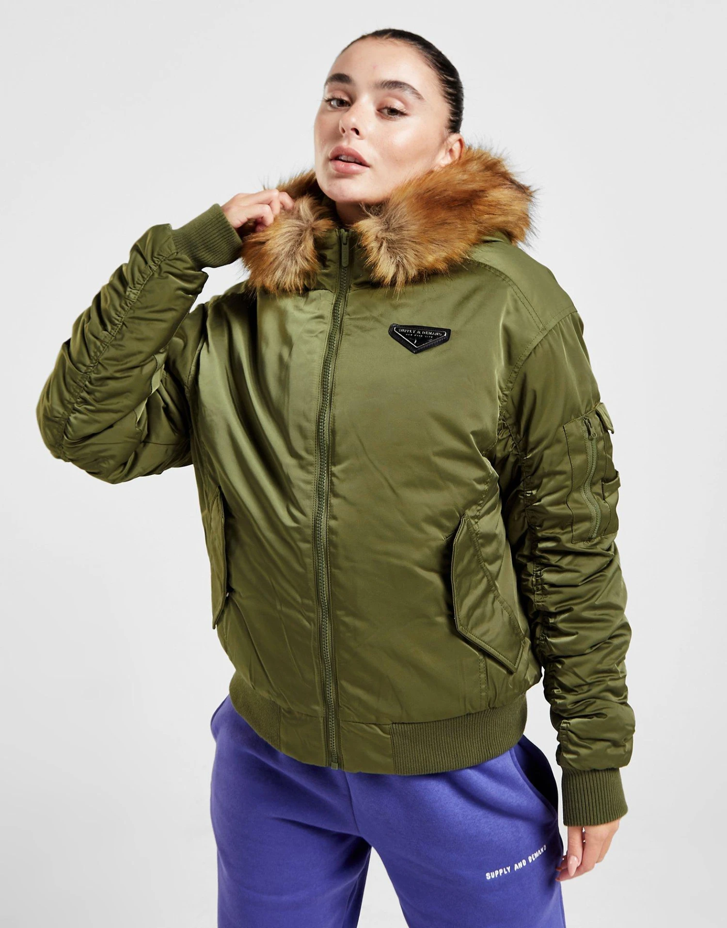 Layer up in this women’s Coney Bomber Jacket from Supply & Demand. In a Khaki colourway, this jacket is made with smooth, durable woven recycled poly fabric for lasting wear. The lining and plush padding is made with recycled poly for cosy warmth, with a full-length zipper to amp up the coverage. It has a fixed hood with a fluffy faux fur trim, as well as stretchy ribbed trims to secure the fit. With front hand pockets for storage, it’s finished up with Supply & Demand branded hardware to the chest. | Our model is 5’6″ and wears a size small.