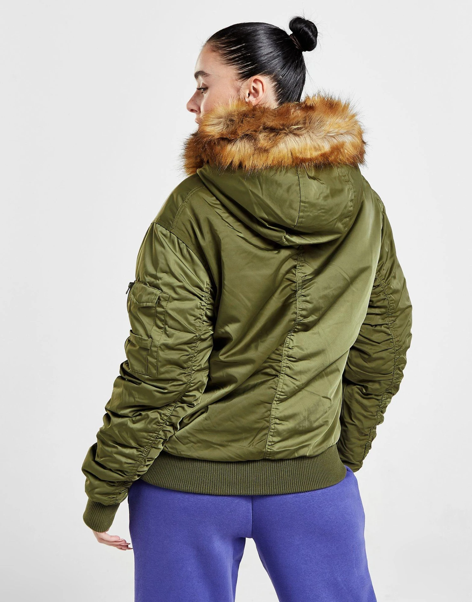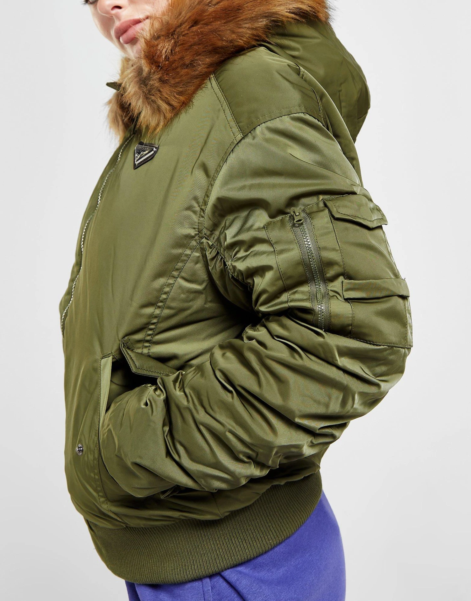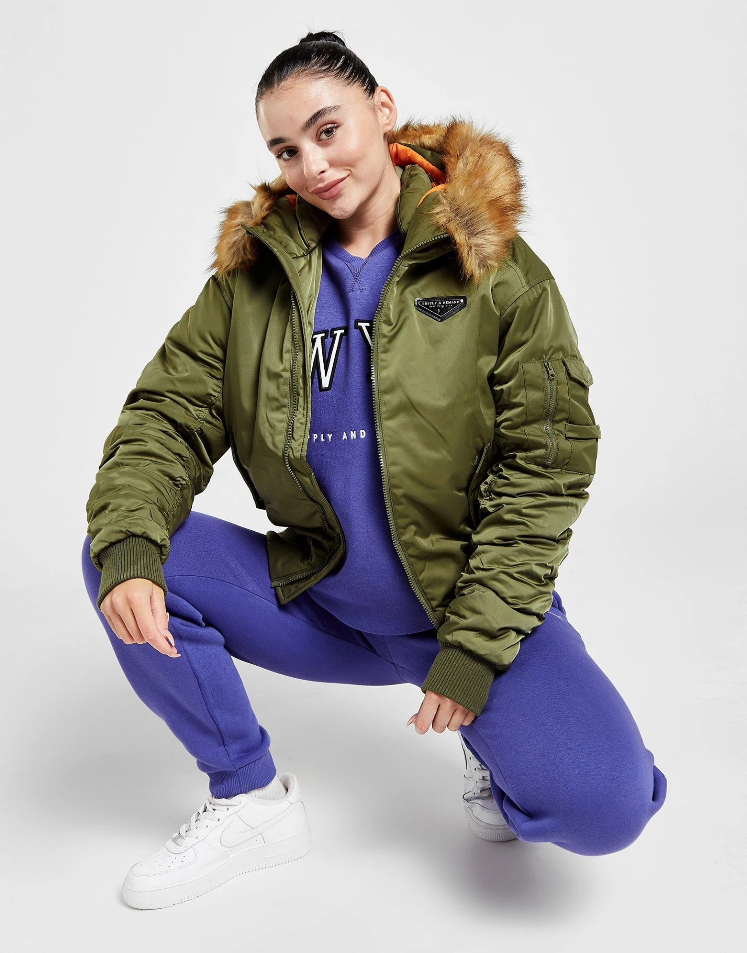 Layer up in this women’s Coney Bomber Jacket from Supply & Demand. In a Khaki colourway, this jacket is made with smooth, durable woven recycled poly fabric for lasting wear. The lining and plush padding is made with recycled poly for cosy warmth, with a full-length zipper to amp up the coverage. It has a fixed hood with a fluffy faux fur trim, as well as stretchy ribbed trims to secure the fit. With front hand pockets for storage, it’s finished up with Supply & Demand branded hardware to the chest. | Our model is 5’6″ and wears a size small.
