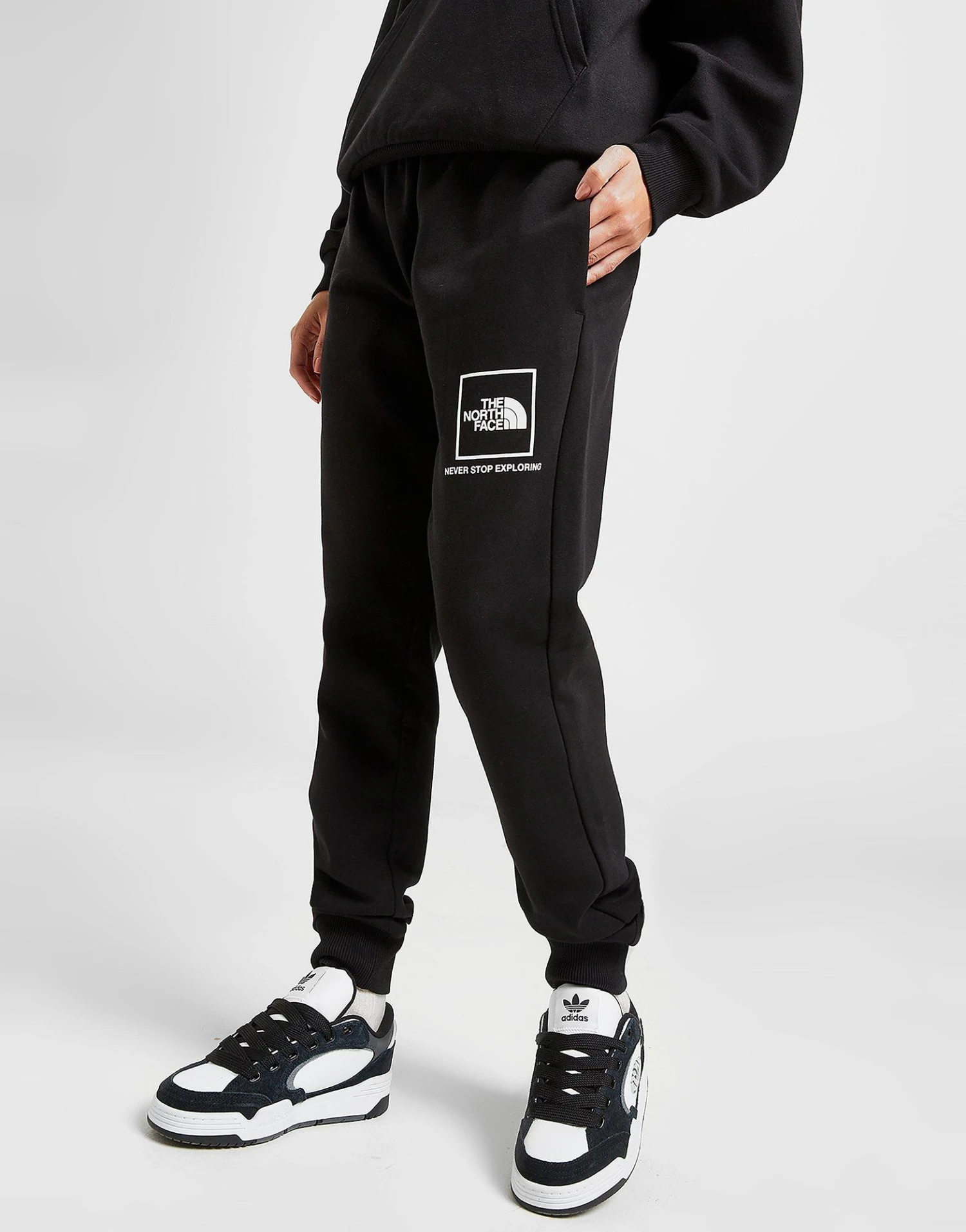 From sofa chills to city hangouts, go casual in these women’s Box Logo Joggers from The North Face. Exclusive to JD, these regular-fit sweats come in a Black colourway, and have a drawcord-adjustable waistband for custom comfort. They feature cuffed ankles to taper the legs and side pockets for your essentials. Made from soft, fleecy cotton fabric, these joggers are finished off with a White Simple Dome box logo printed to the left thigh. Machine washable. | Our model is 5’7″ and wears a size small.