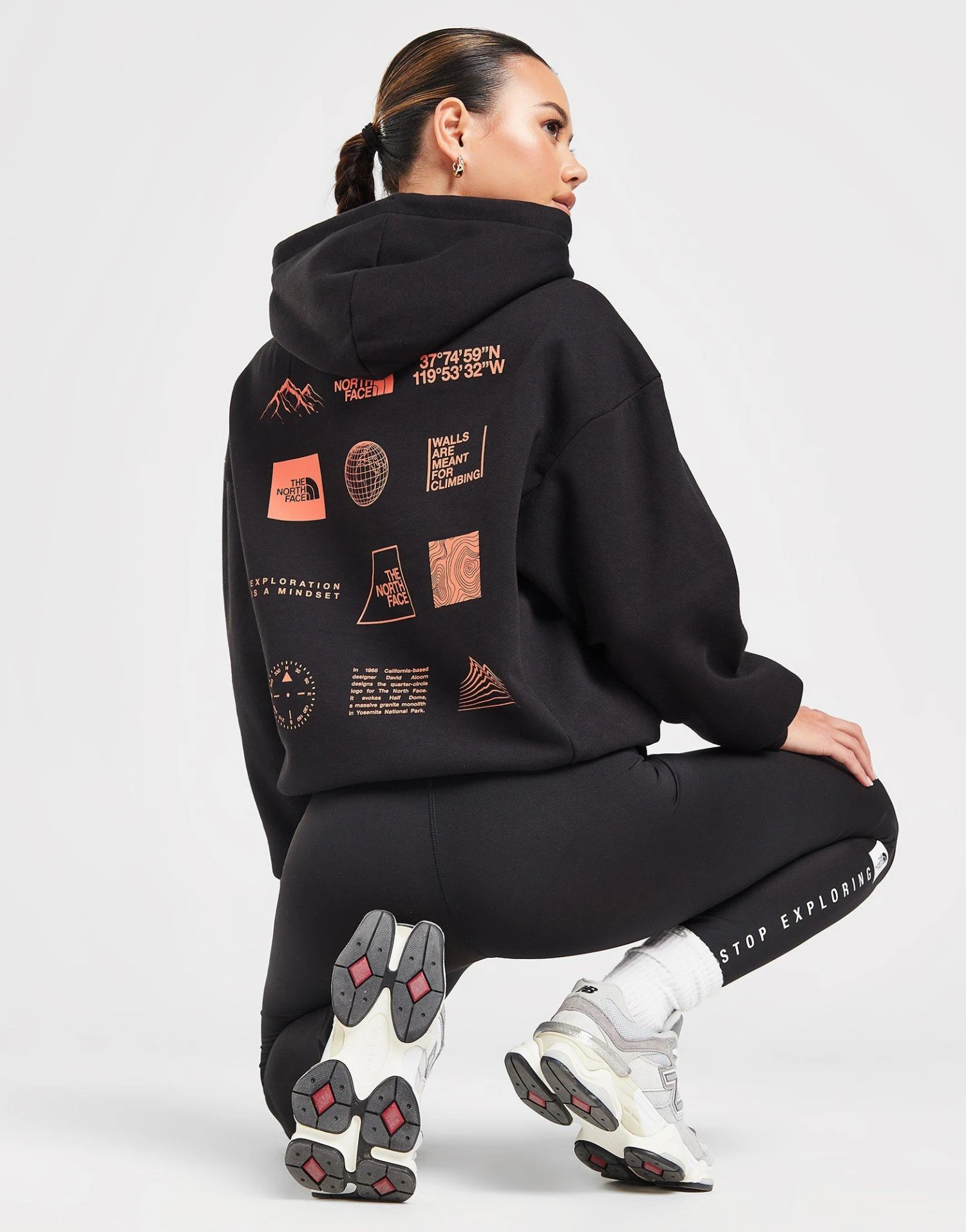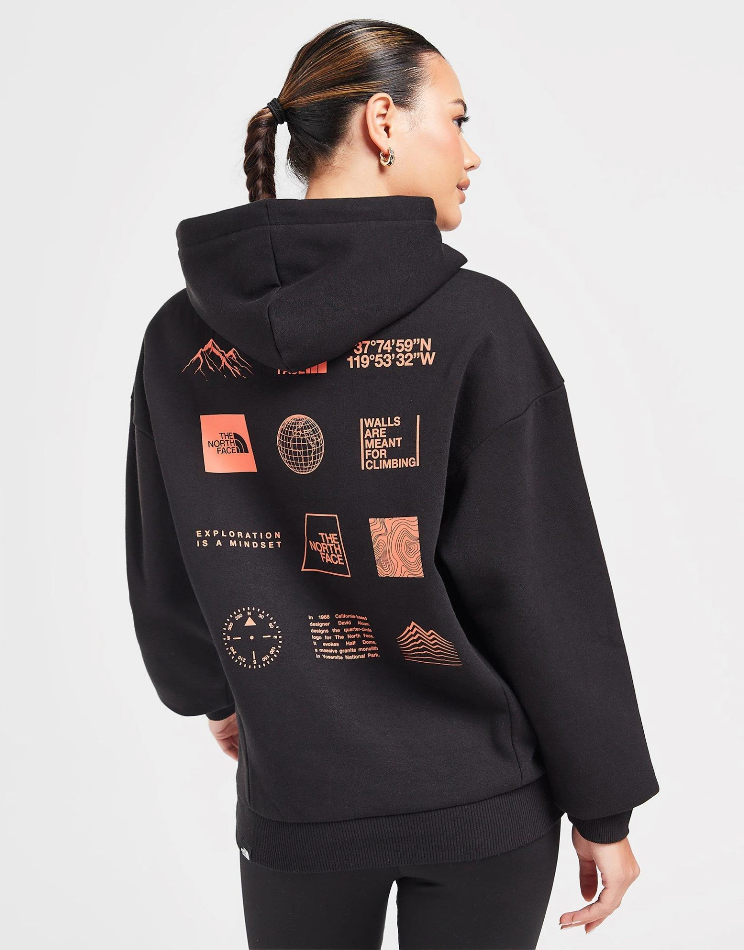 Upgrade your layers with this women’s Multi Graphic Hoodie from The North Face. In a Black colourway, this relaxed-fit hoodie is made from super soft fleece fabric for a cosy feel. It has an overhead design, and features a central kangaroo pocket and an adjustable hood for extra coverage. With ribbed trims, this hoodie is finished up with branding to the chest and TNF graphics stamped to the reverse. Machine washable. | Our model is 5’6″ and wears a size small.
