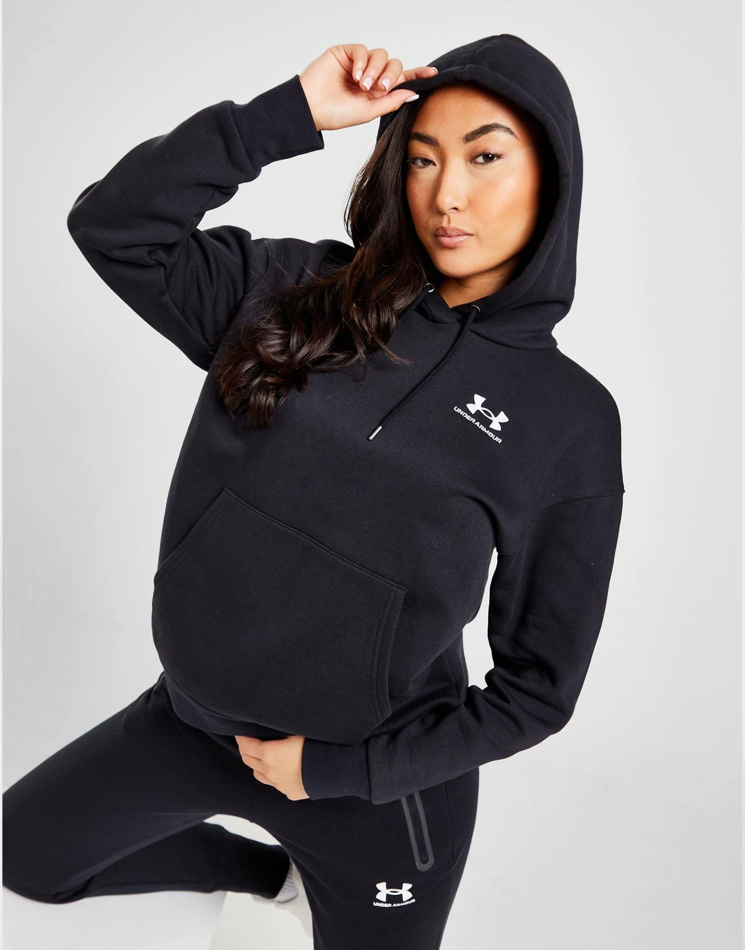 Refresh your training layers with this women’s Essential Fleece Overhead Hoodie. In a Black colourway, this cosy pullover has a drawcord-adjustable hood for custom coverage, as well as ribbed trims and a central kangaroo pocket for your workout staples. Made from a soft cotton mix for durable comfort, this hoodie is finished off with contrasting UA branding to the chest. Machine washable. | Our model is 5’8″ and wears a size small.