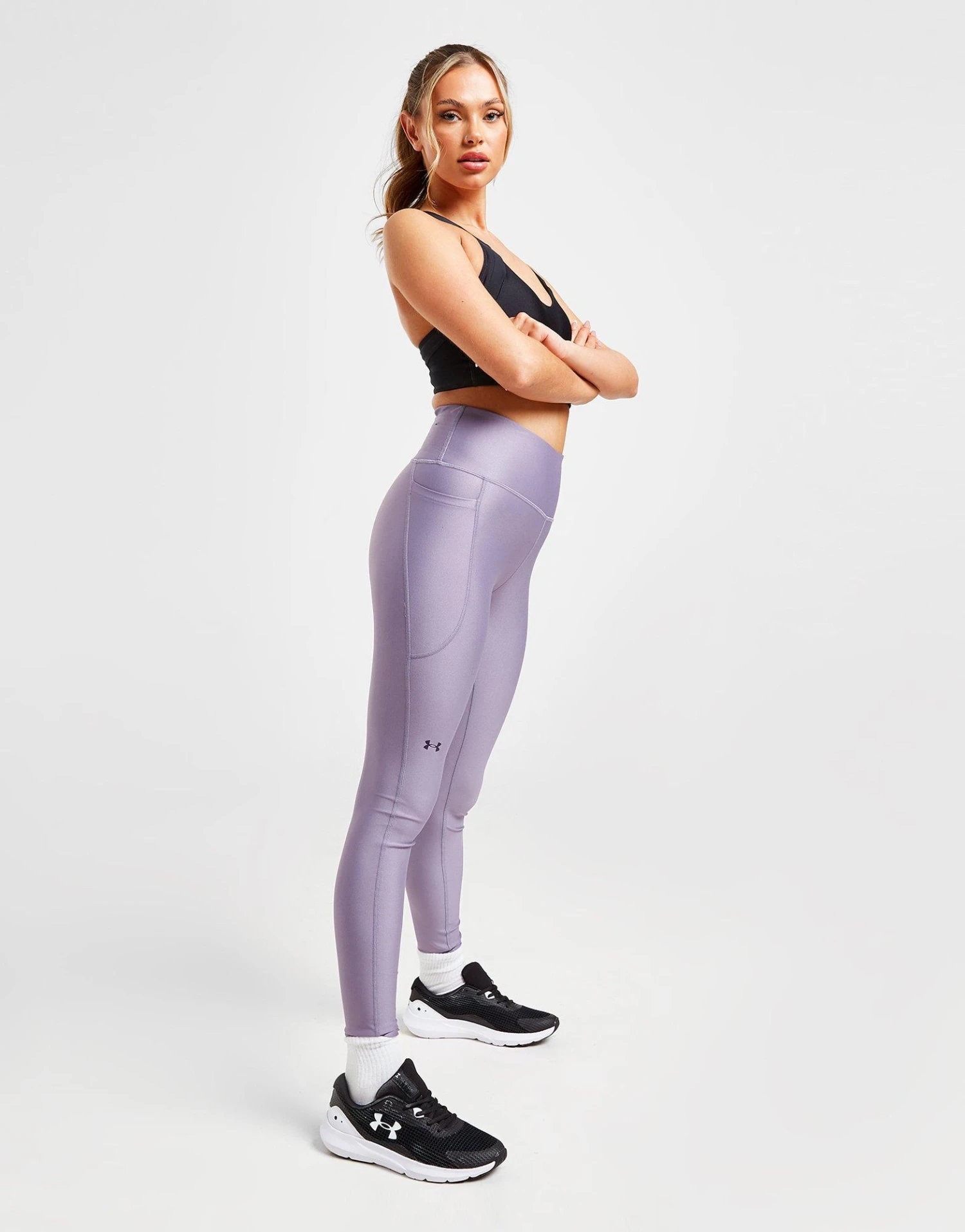 Gear up for your workouts in these women’s HeatGear Ankle Tights from Under Armour. Landing in a Purple colourway, these tight-fit leggings are made with ultra-smooth, lightweight HeatGear poly, with a four-way stretch construction for supreme comfort. Crafted with sweat-wicking tech, they feature ergonomic flatlock seams for a chafe-free feel, and a high-rise, no-slip waistband for secure wear. With a side drop-in pocket, they’re finished up with a signature UA logo at the thigh. Machine washable. | Our model is 5’7″ and wears a size small.