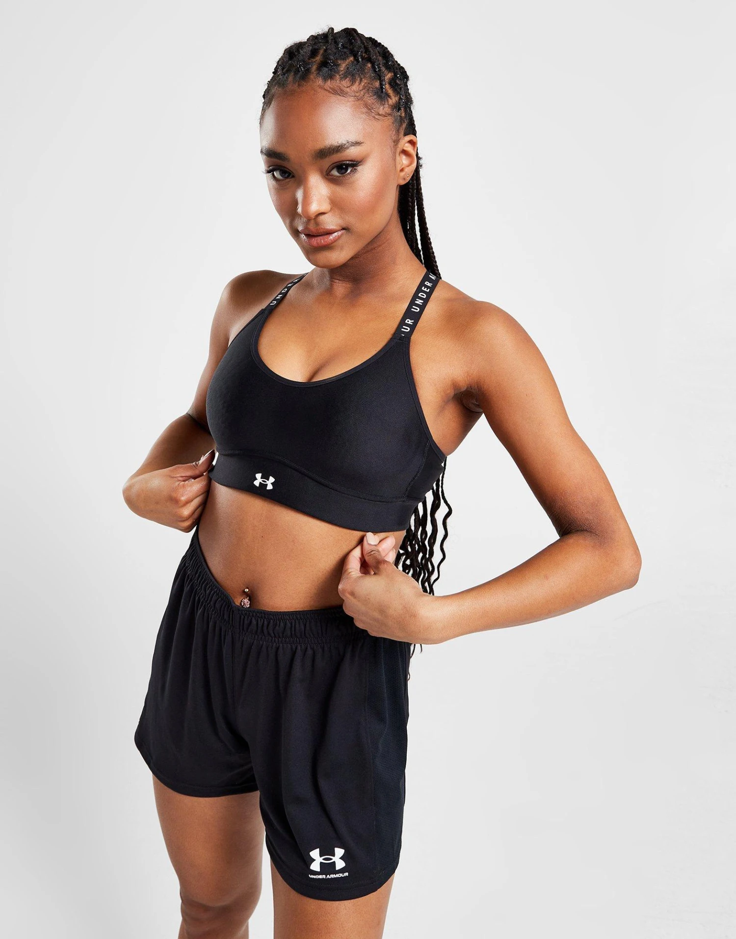 Cop a workout essential with this women’s Infinity Bra from Under Armour. Coming in a Black colourway, this slim-fit sports bra is made with a super-smooth, lightweight HeatGear fabric with added stretch so you can move easily. Equipped with sweat-wicking tech and breathable mesh to keep you cool, it features adjustable crossover straps and a hook-and-loop back clasp for a secure fit. The molded, PU-injected one-piece pad delivers strategic support to your workouts, designed for miedium-level activities like boxing, cycling and weight training. Finished up with signature Under Armour branding. Machine washable. | Our model is 5’7″ and wears a size small.