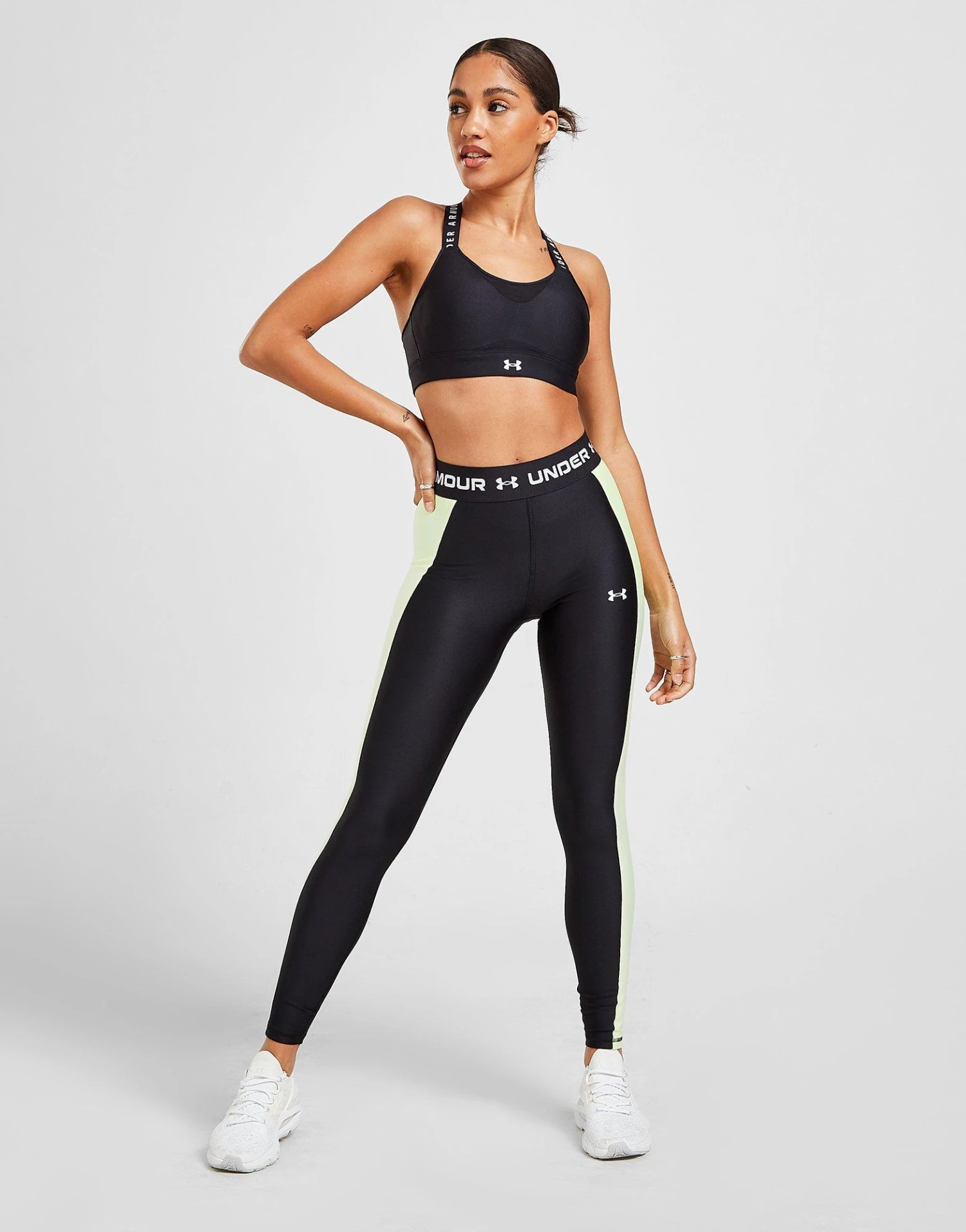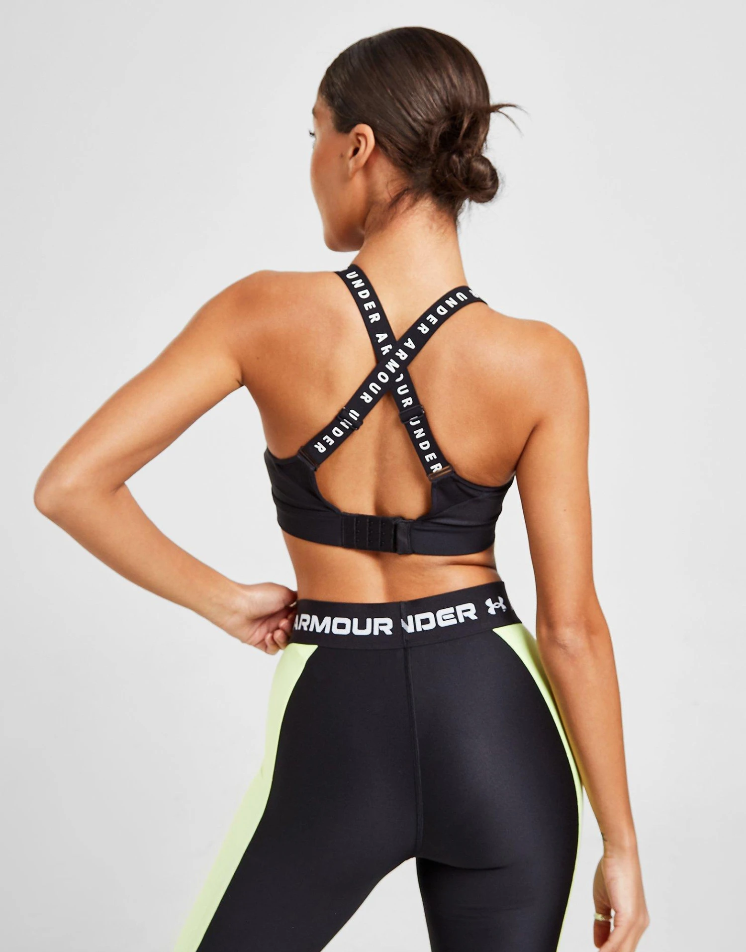Made for high-intensity activities like running, aerobics and more, this women’s Infinity High Sports Bra from Under Armour is a fitness essential. In a Black colourway, this tight-fit bra is made from smooth and stretchy fabric with mesh panels for breathability. It’s equipped with HeatGear tech to wick away sweat, and features moulded, PU injected one-piece padding for coverage and natural definition. Offering maximum support, this sports bra is finished with cross-over straps, a hook and eye fastening and signature Under Armour branding. Machine washable. | Our model is 5’8″ and wears a size small.__