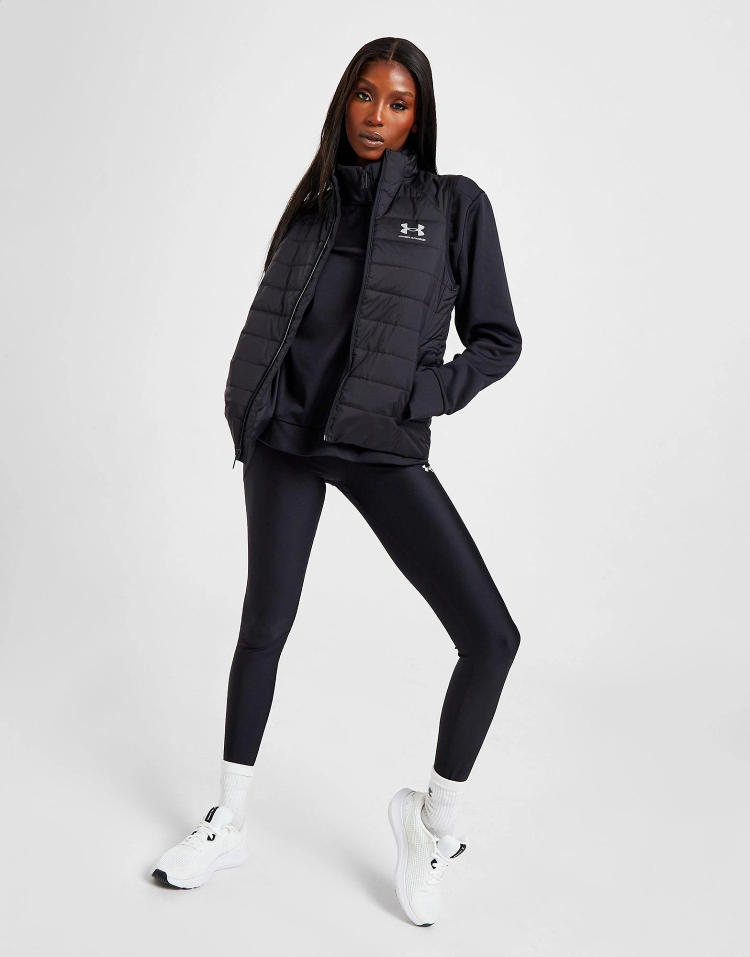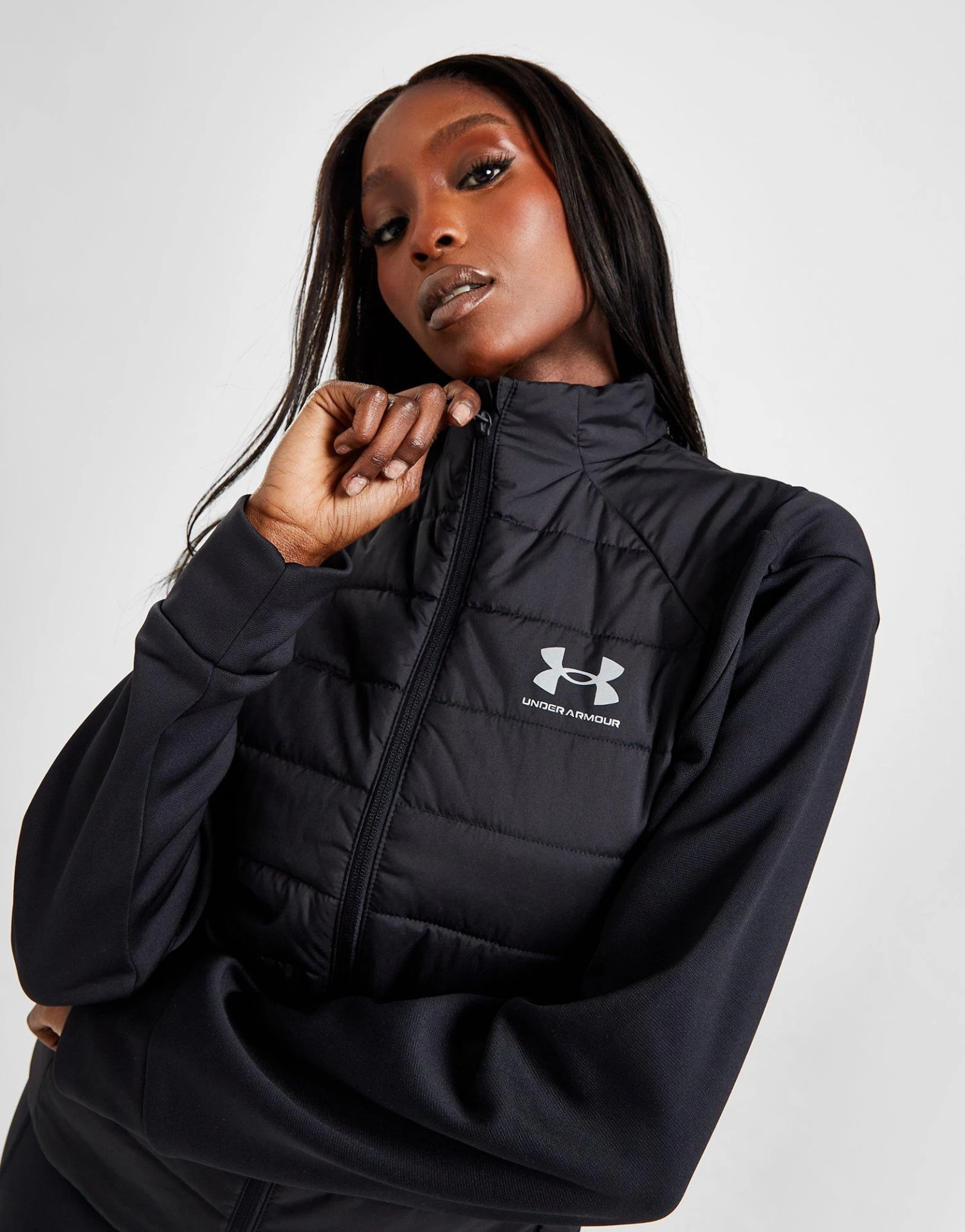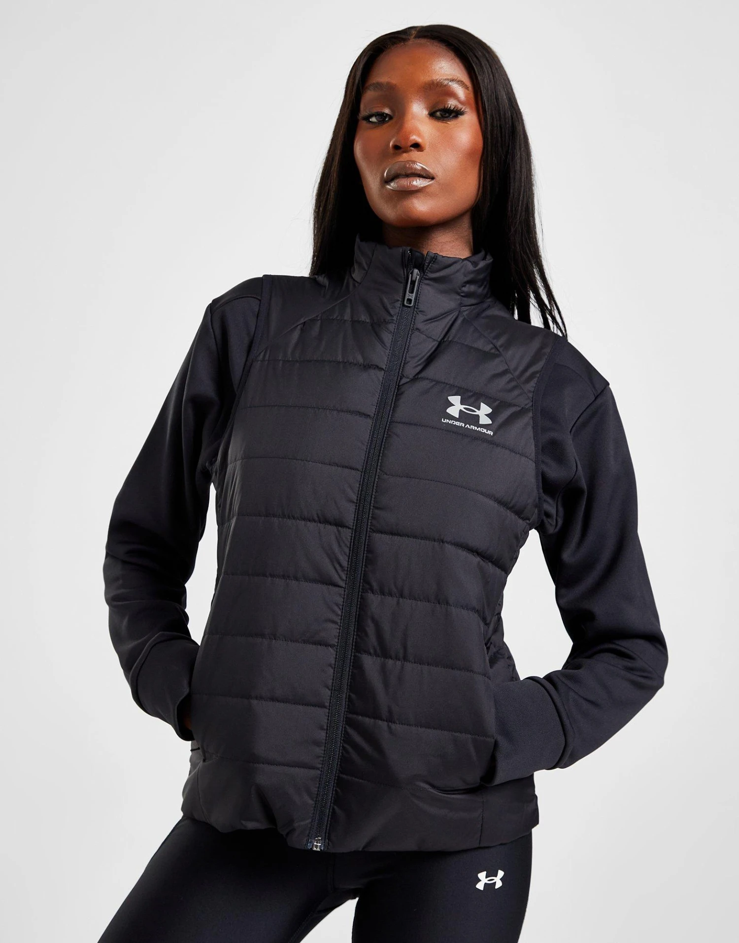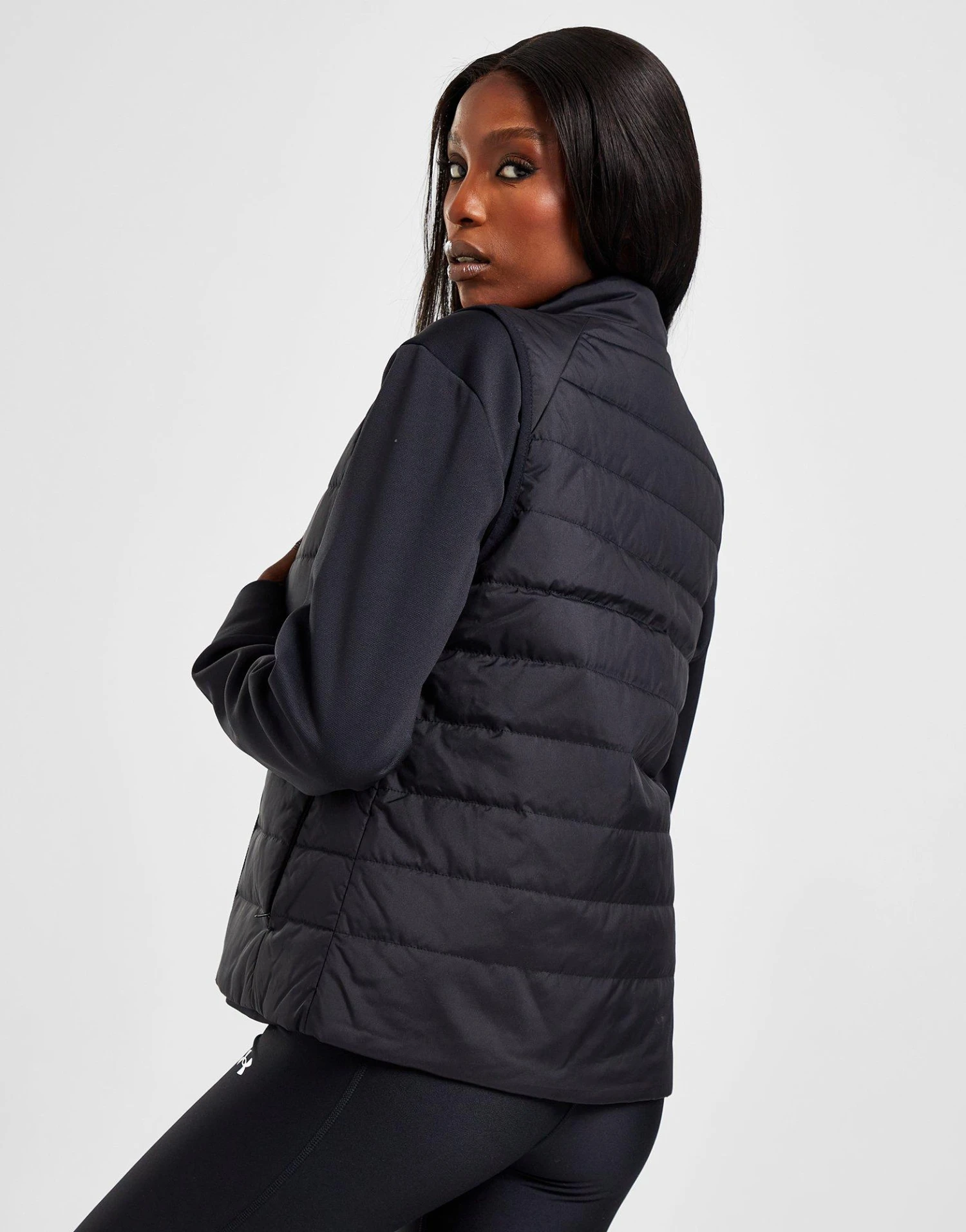 Block out the cold when you step out in this women’s Insulate Gilet from Under Armour. In a Black colourway, this JD-exclusive gilet is cut from light, durable nylon with built-in UA Storm tech for a water-proof finish. It features a full-zip fastening and funnel collar for custom coverage, with side pockets for your everyday essentials. Finished up with signature Under Armour branding to the chest. Machine washable.