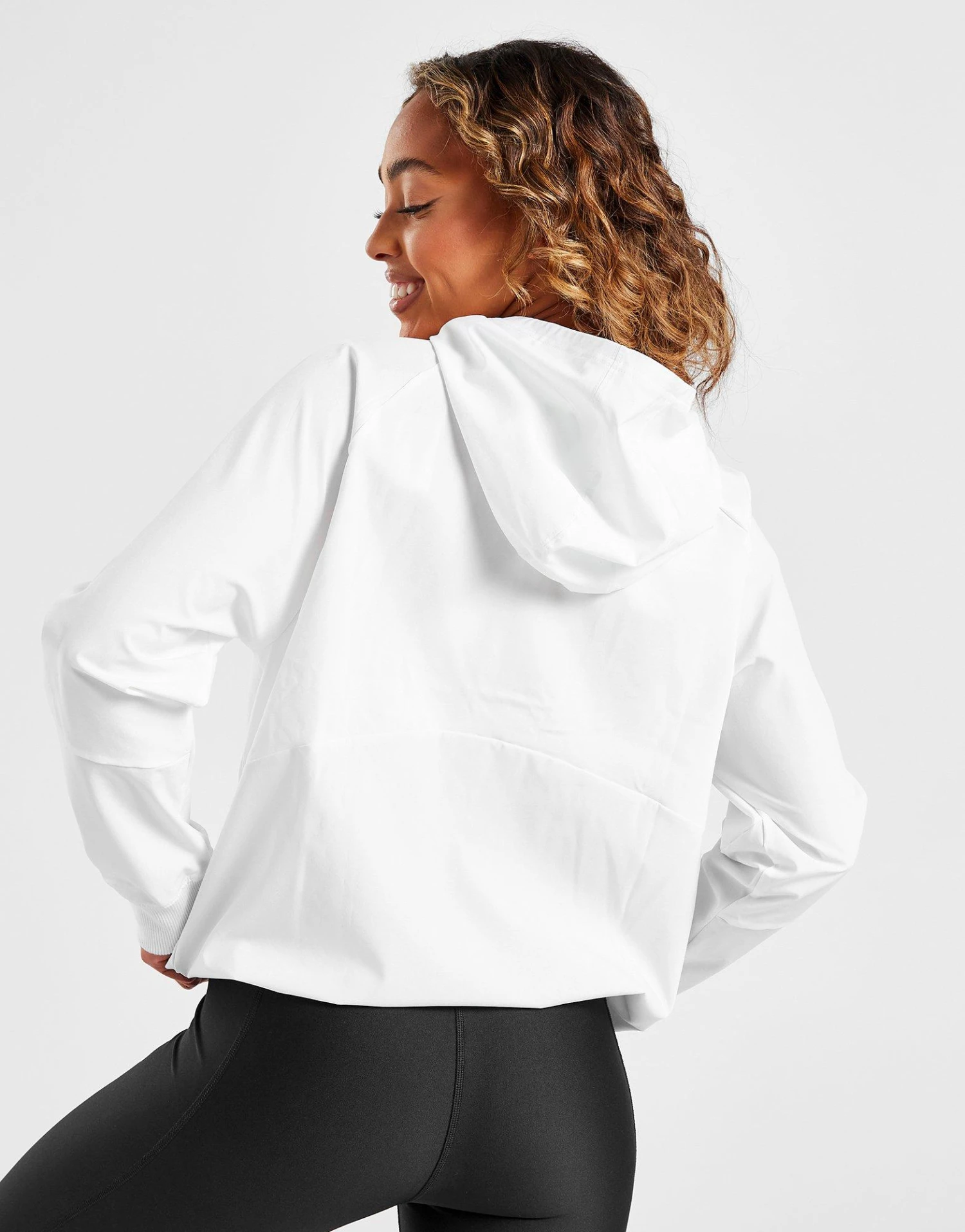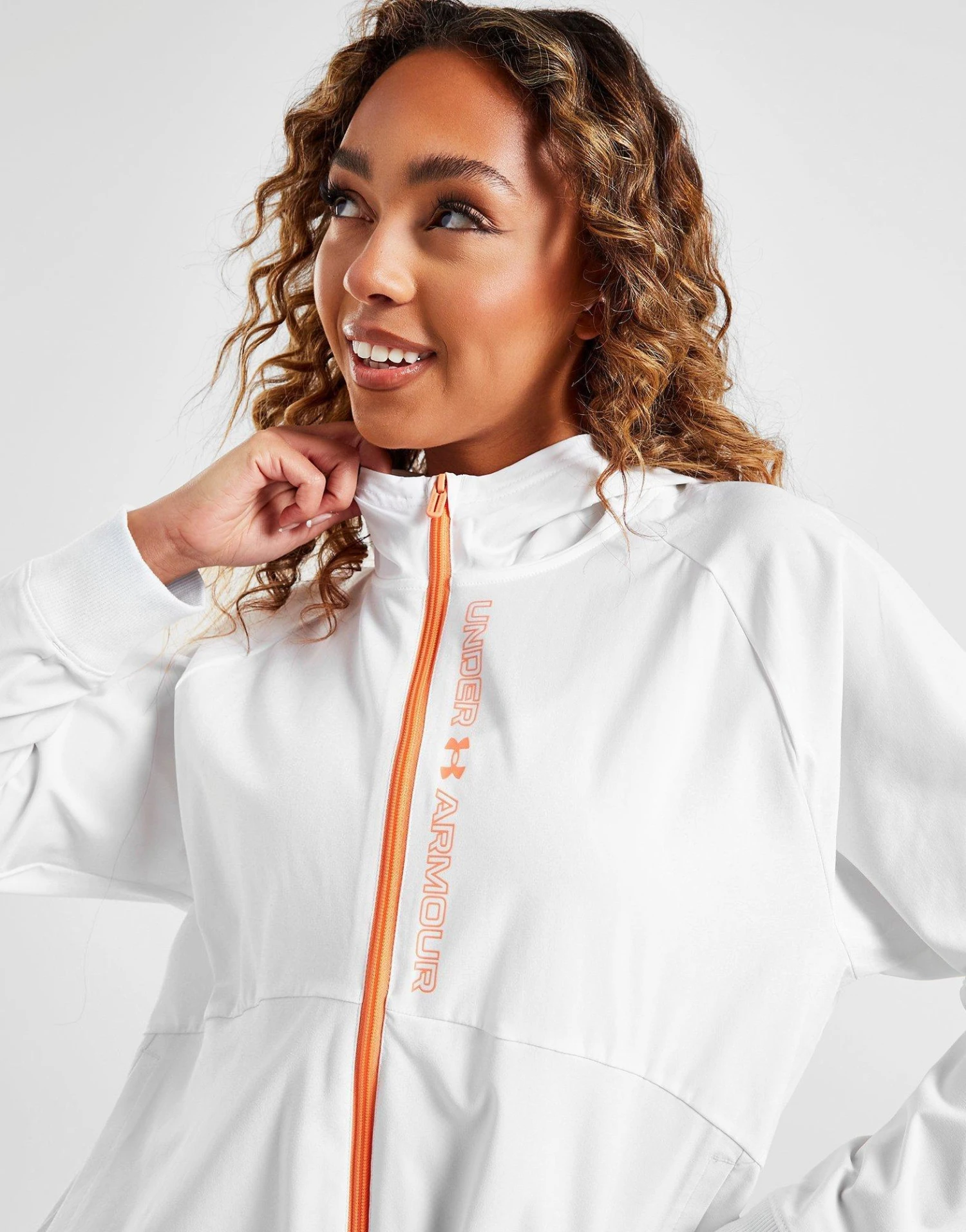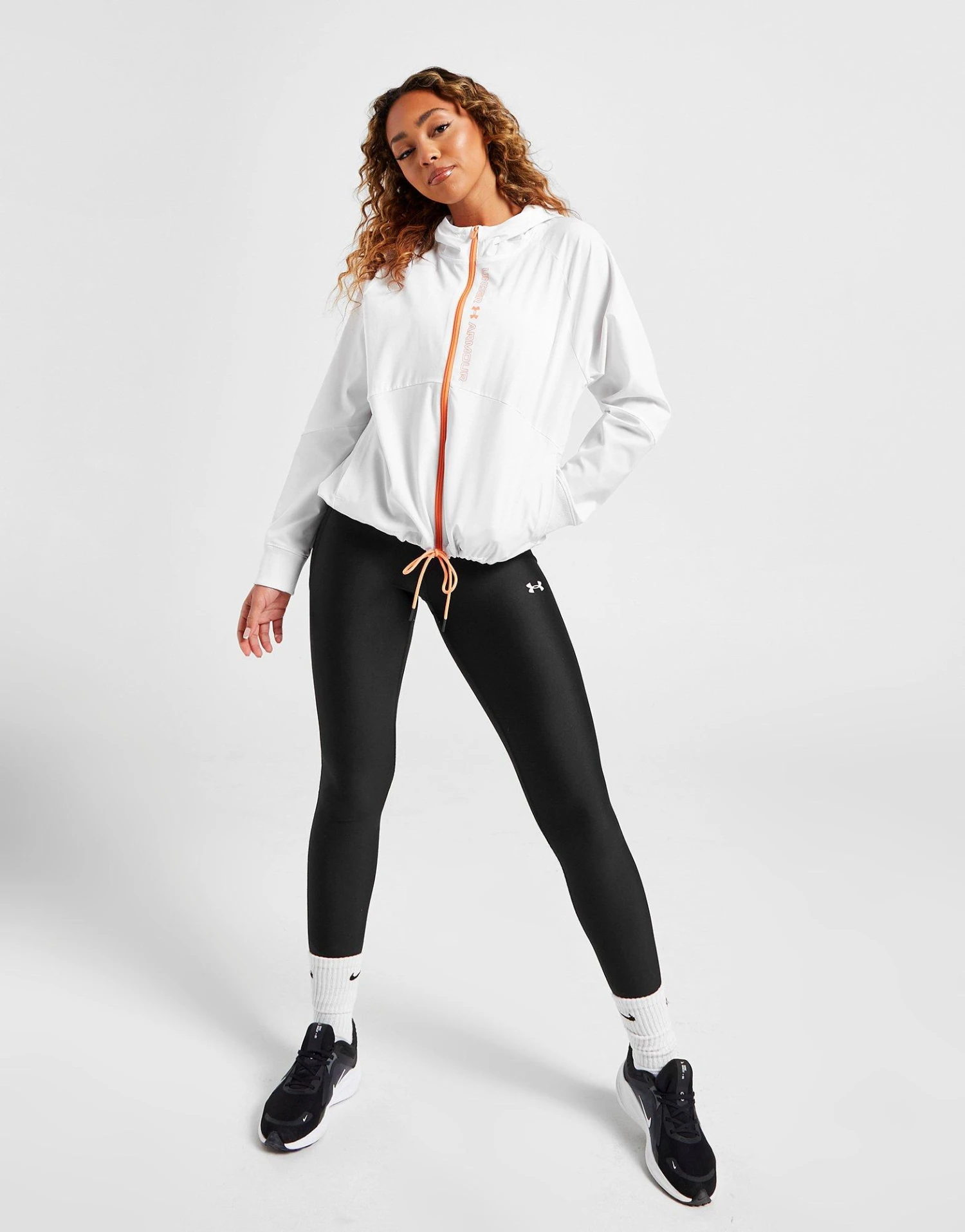 Layer up between sessions in this women’s Woven Full Zip Jacket from Under Armour. Coming in a White colourway, this standard-fit jacket is made with smooth, lightweight woven poly for lasting wear. It features a full-length zipper with long, raglan-cut sleeves and a hood to amp up the coverage. With ribbed cuffs and a drawcord hem for a sleek, secure fit, and front pockets for storage, it’s finished up with signature Under Armour branding throughout. Machine washable. | Our model is 5’8″ and wears a size small.