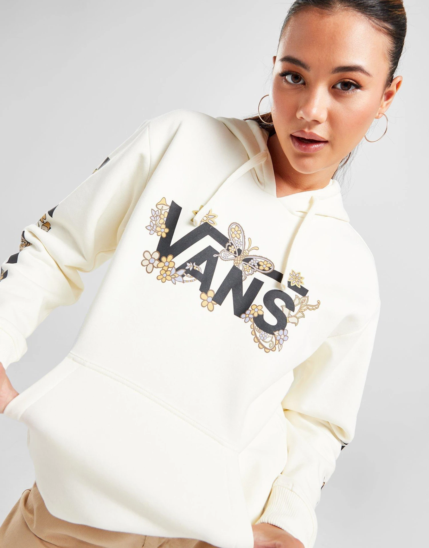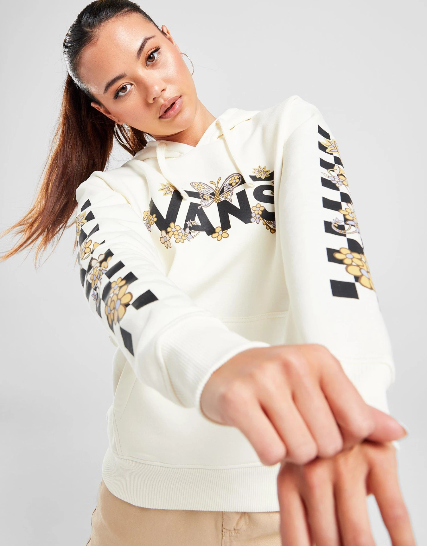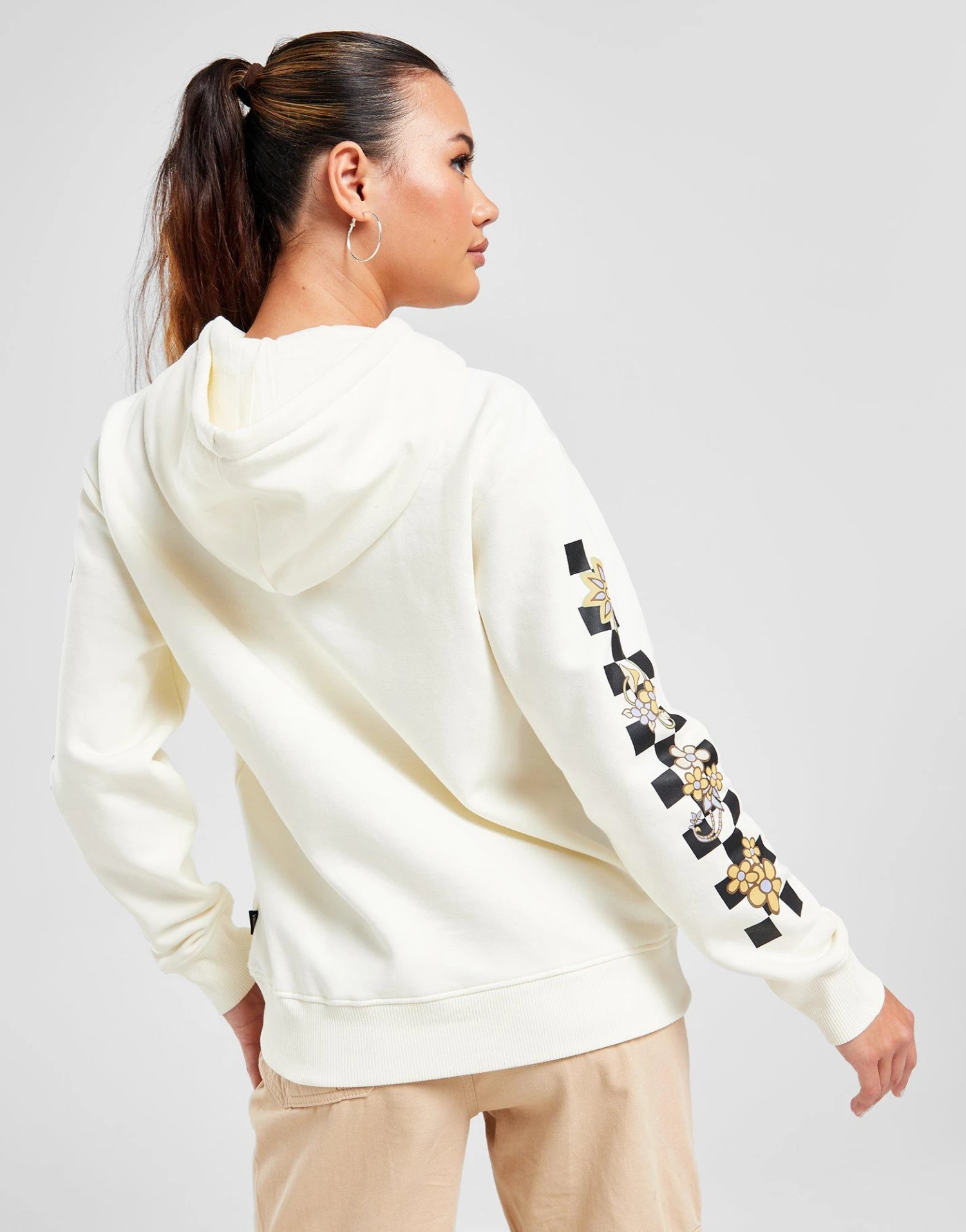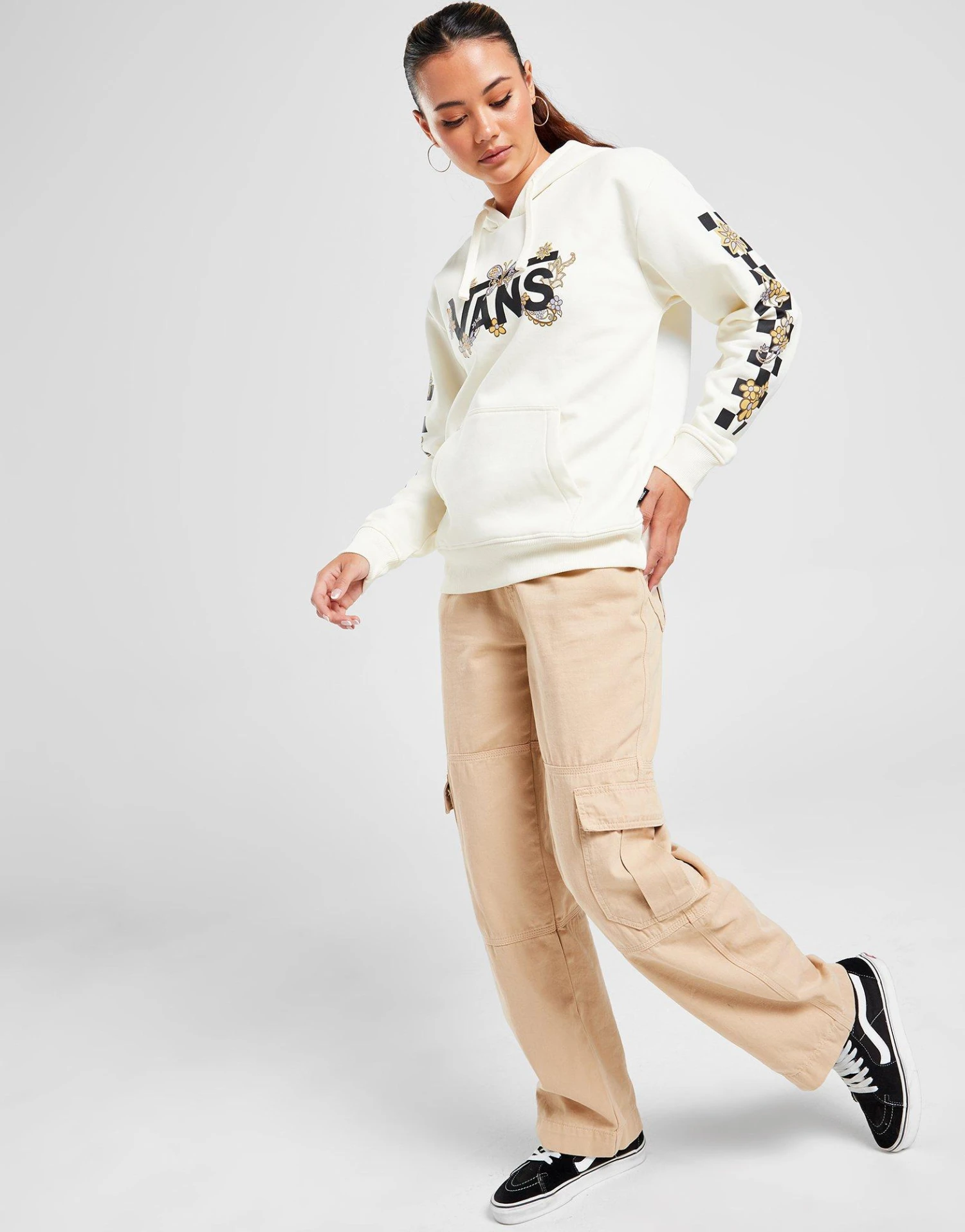 Embrace the outdoors with this women’s Paisley Hoodie from Vans. In a White colourway, this relaxed-fit pullover is made a super-soft cotton and poly blend for fleecy comfort. The drawcord-adjustable hood provides coverage, while a spacious kangaroo pocket and dropped shoulders keep it laidback. Finished off with the iconic checkerboard print down the sleeves, Vans branding to the chest and floral-inspired graphics overlaid. Machine washable. | Our model is 5’6″ and wears a size small.